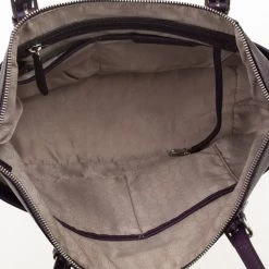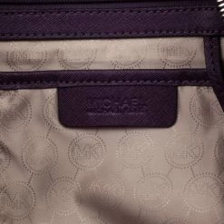 This Michael Kors bag features a flawless purple leather exterior accented with gold-tone hardware. It is adorned with dual buckled leather straps with a hanging MK charm. The interior ois lined with monogram fabric and houses one zip pocket and three patch pockets. It comes with a top zip closure and seam detailing on the exterior.Original Retail Price: US $248
