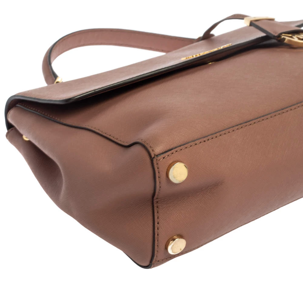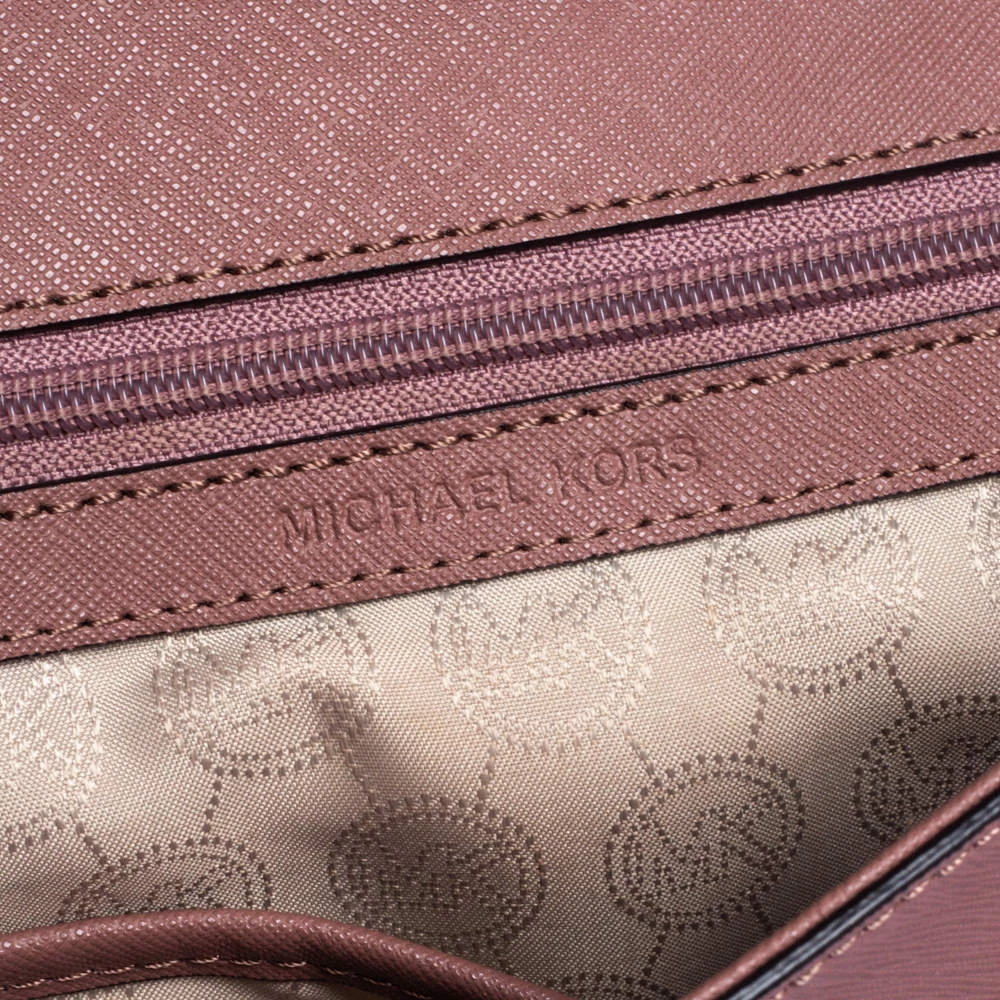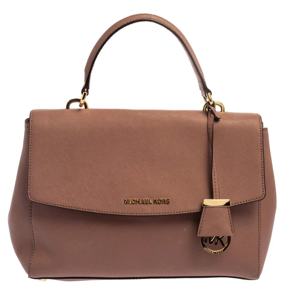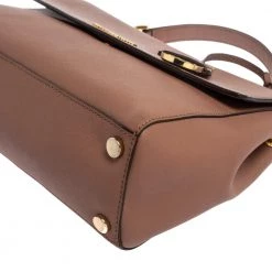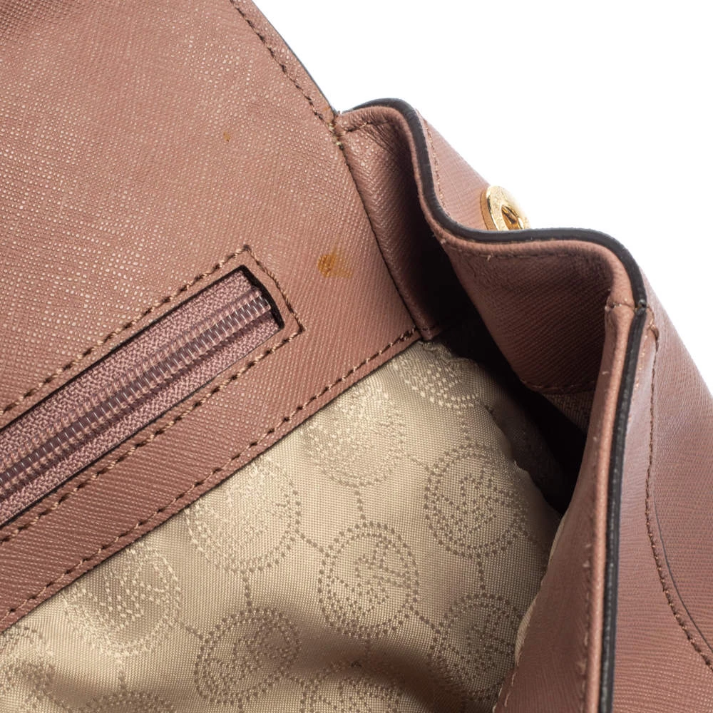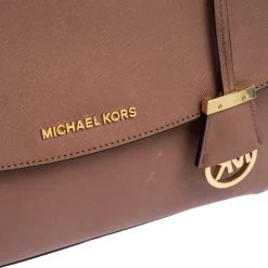 This pink-colored bag comes from the fashion house of Michael Kors. Crafted from leather, it features a durable fabric interior that ensures to house your lipsticks, wallet, and other essentials. Designed with a flap closure, it flaunts a gold-tone brand logo adorning the front and is complete with a single top handle and a detachable shoulder strap.