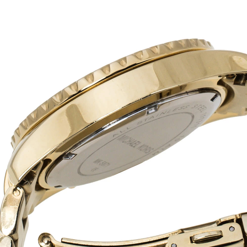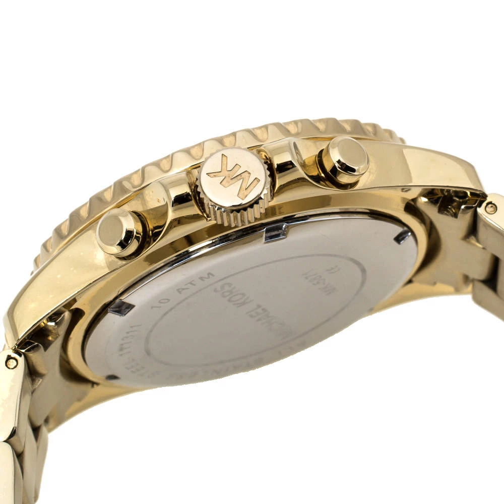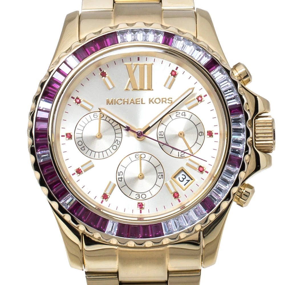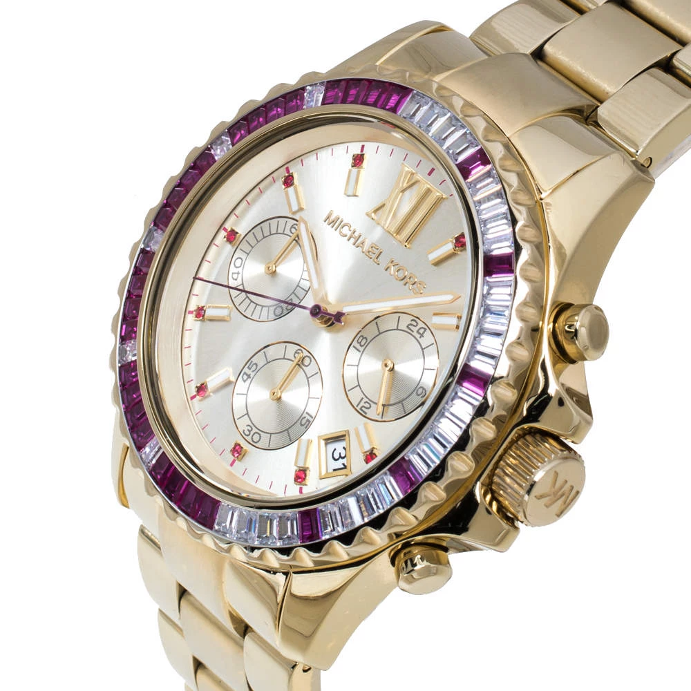 Add a dash of glamor to your stylish ensemble with this eye-catchy Michael Kors Everest wristwatch. The attractive watch features a gold-tone stainless steel case with baguette crystals on the bezel surrounding a beautiful dial and a stainless steel bracelet. Powered by a quartz movement, this watch comes with hours, minutes, date and chronograph functions.