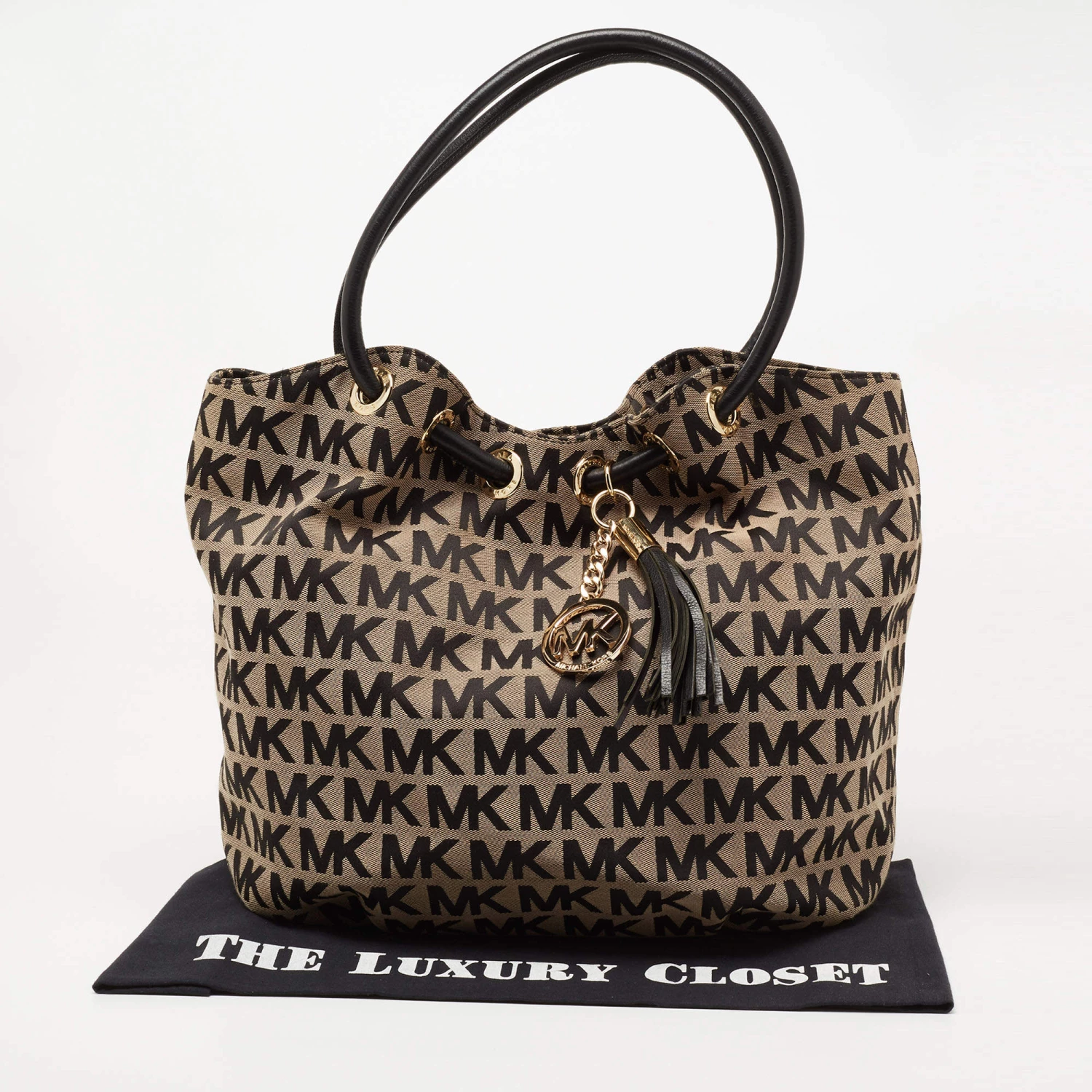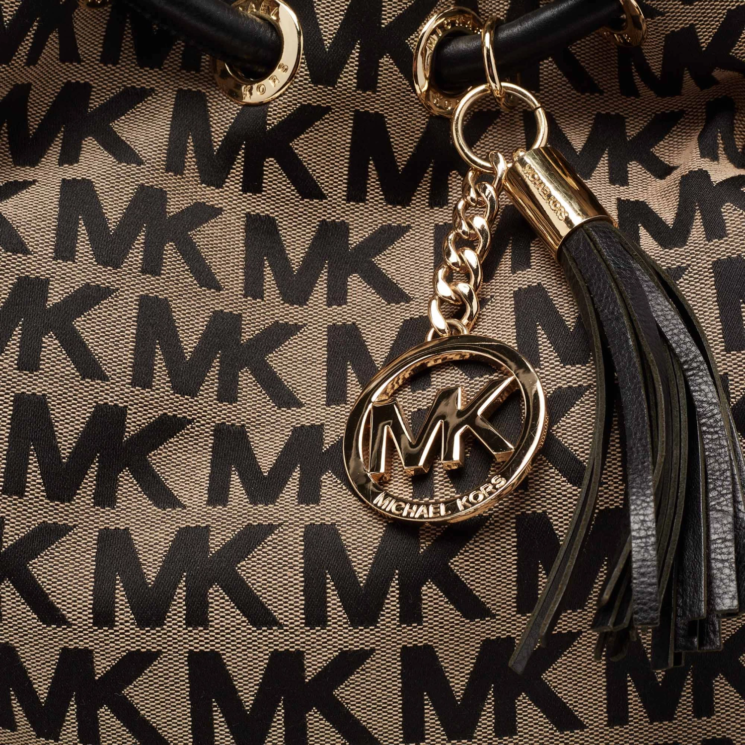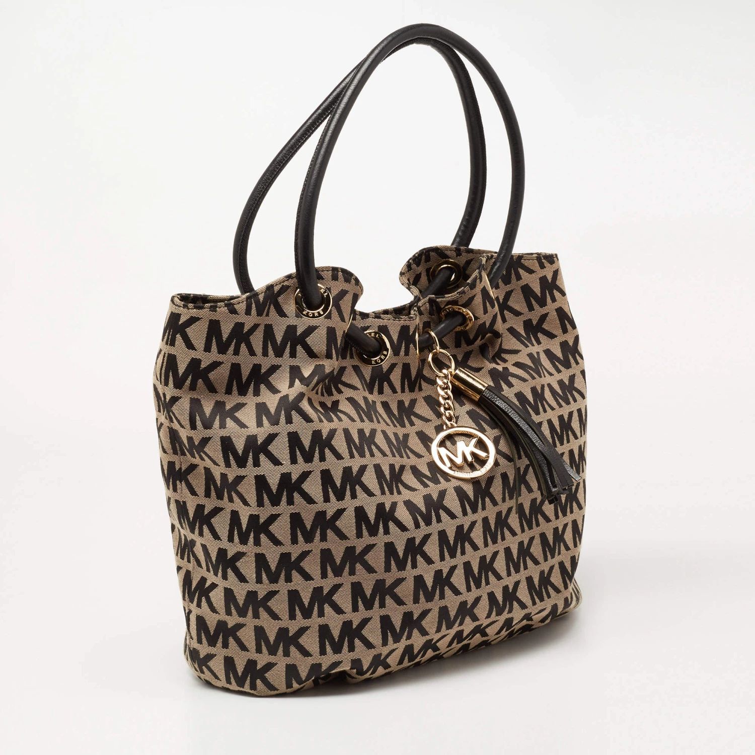 This Michael Kors Jet Set bag aims to provide you with practical ease. Designed with a drawstring closure, it is made from the signature canvas and leather. It exhibits dual handles for you to carry it in a chic way and a spacious fabric interior to hold all your essentials. The brand signature on the front makes it easily recognizable and the tassel adds charm to the bag.
