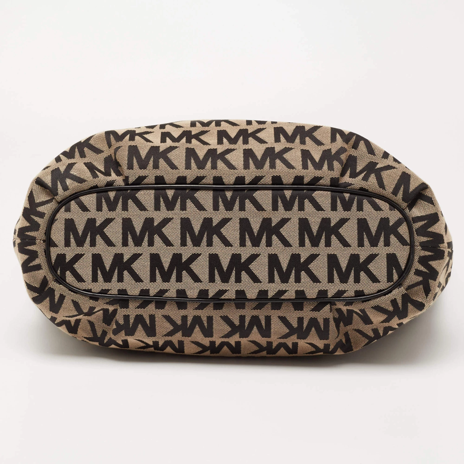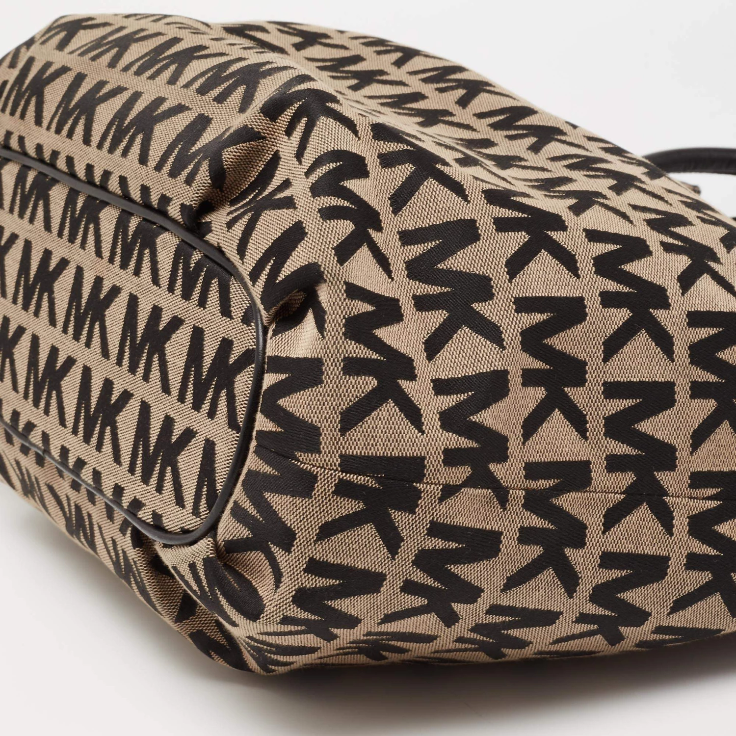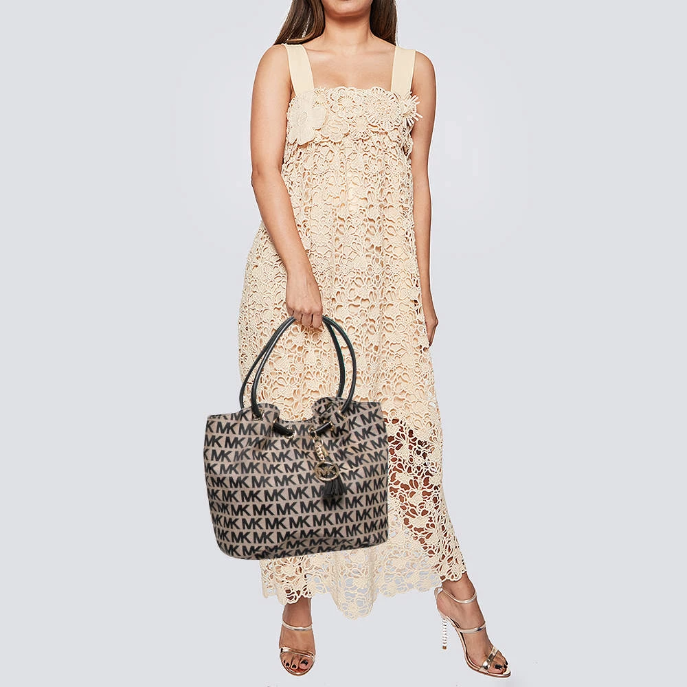 This Michael Kors Jet Set bag aims to provide you with practical ease. Designed with a drawstring closure, it is made from the signature canvas and leather. It exhibits dual handles for you to carry it in a chic way and a spacious fabric interior to hold all your essentials. The brand signature on the front makes it easily recognizable and the tassel adds charm to the bag.