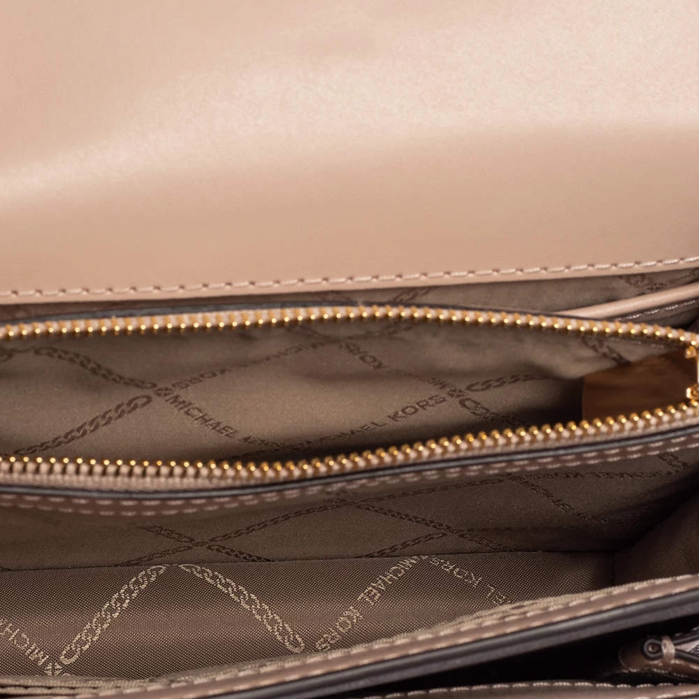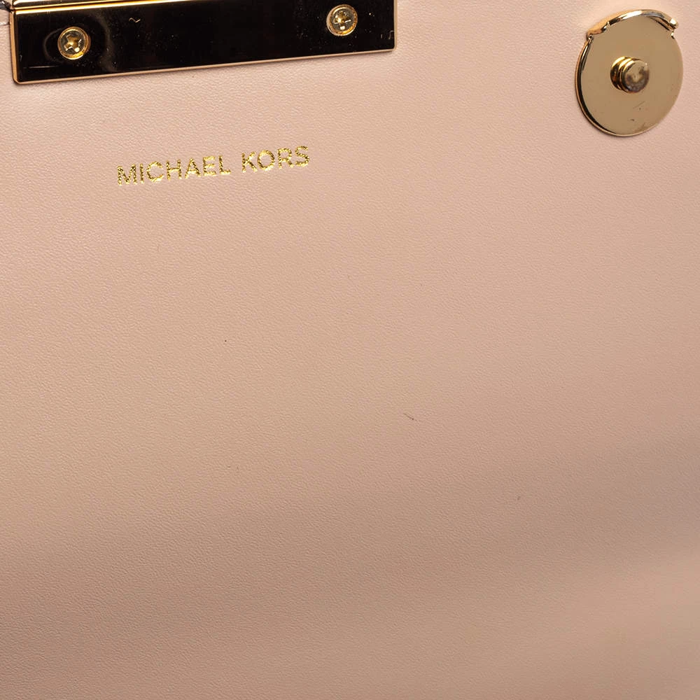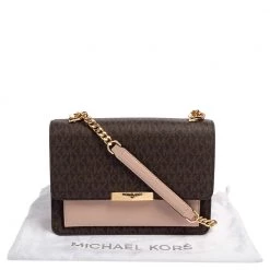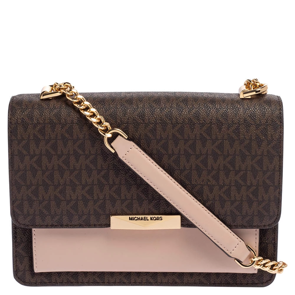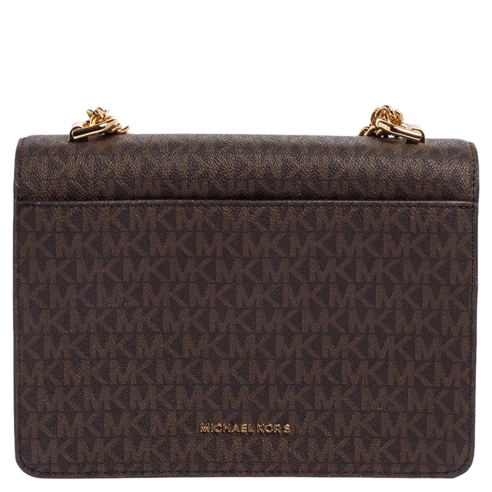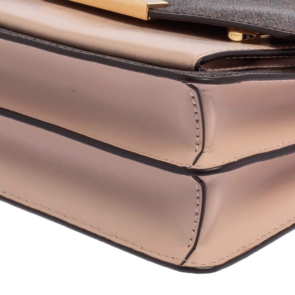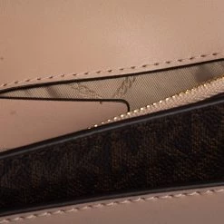 Elevate your style with this gorgeous shoulder bag by Michael Kors. Crafted from monogram coated canvas and leather, the bag features the brand detail on the front, shoulder chain link, and a nylon-lined interior. It is sturdy, compact, and stylish.