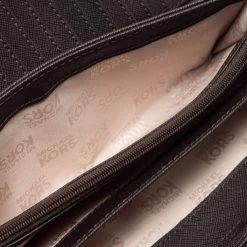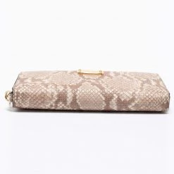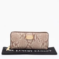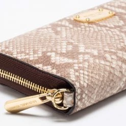 The top zip-around closure secures the compartmentalized interior of this Michael Kors wallet. A practical accessory, this snakeskin-embossed leather creation is beautified with gold-tone accents and has a brand signature on the front.