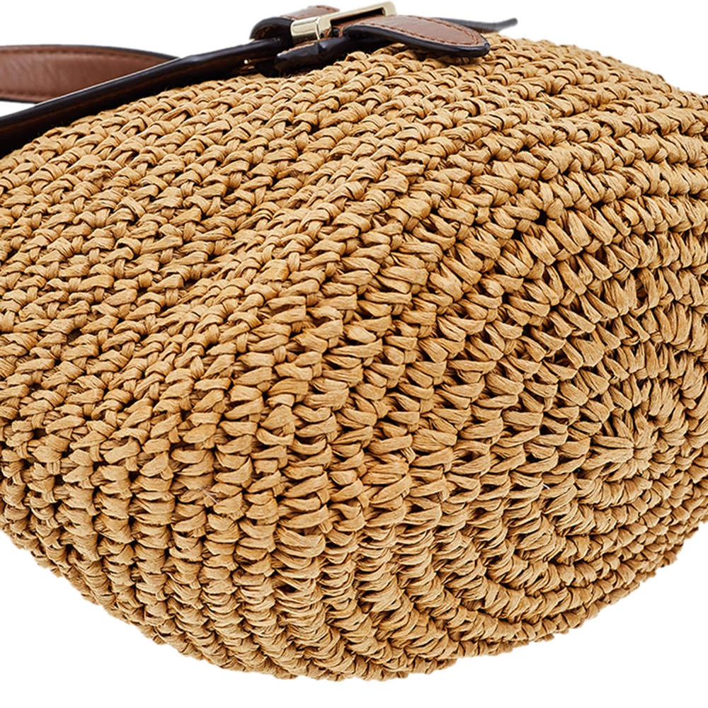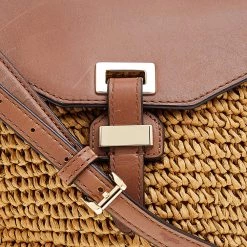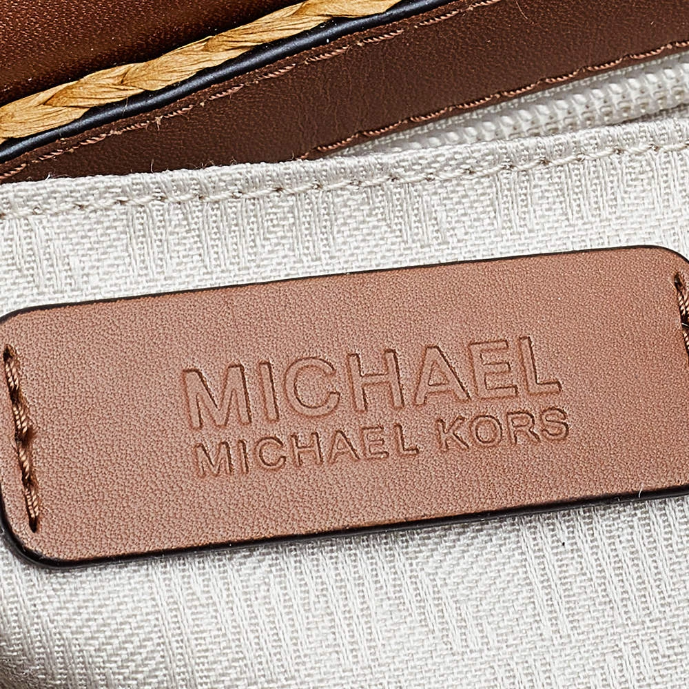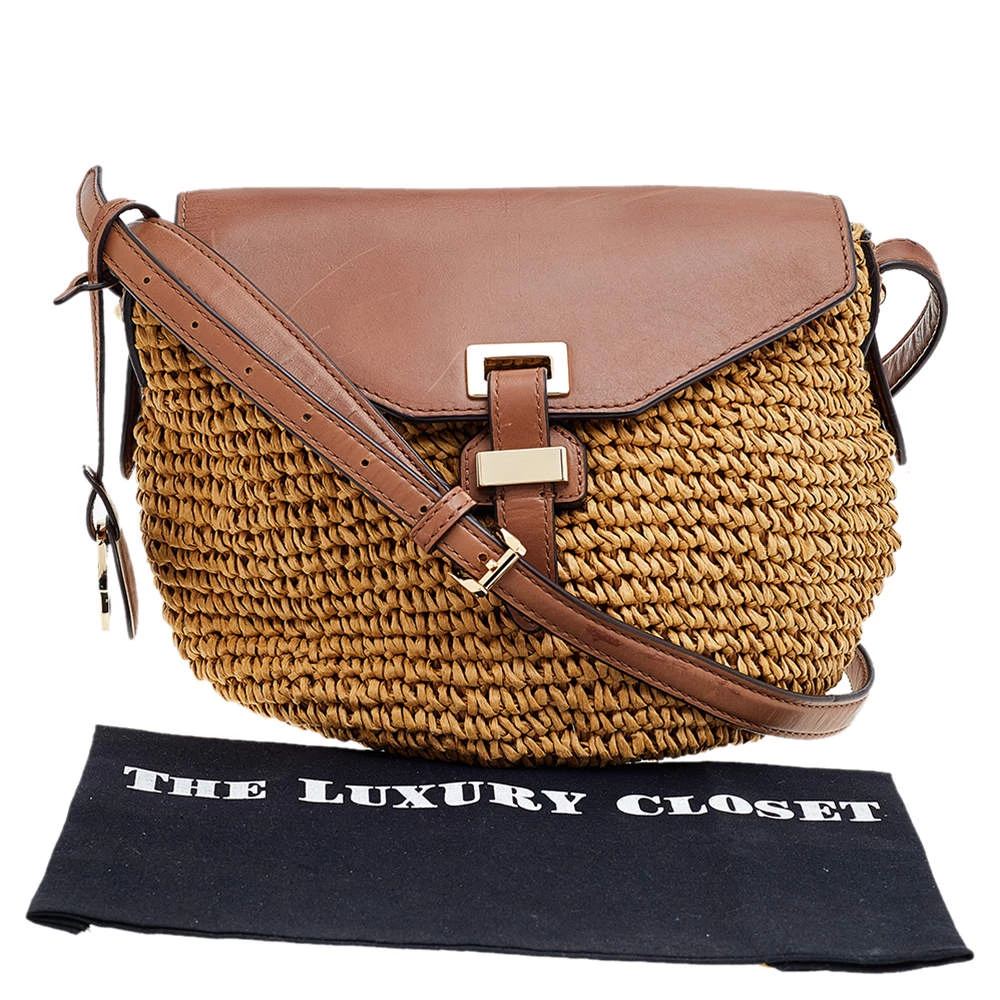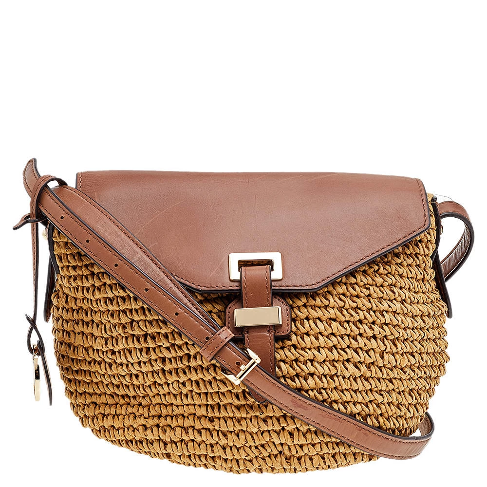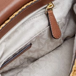 Flaunt an astonishing style with this marvelous bag from Michael Kors. The outer surface of this bag features beige woven straw and brown leather with a gold-toned buckle lock at the front. It is held by a leather shoulder strap. This chic bag is perfect for daily use.