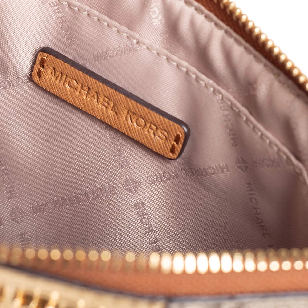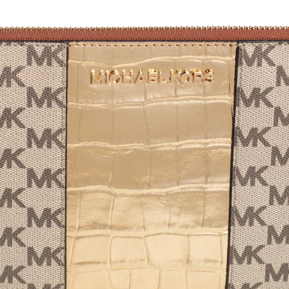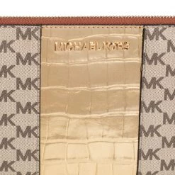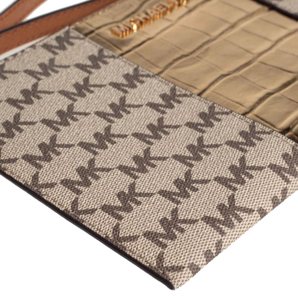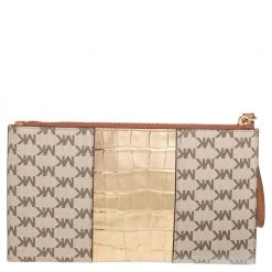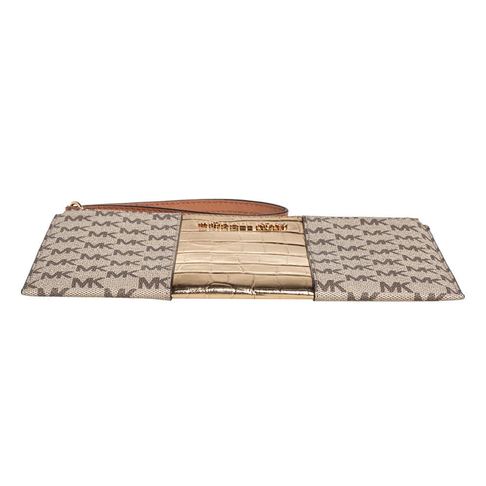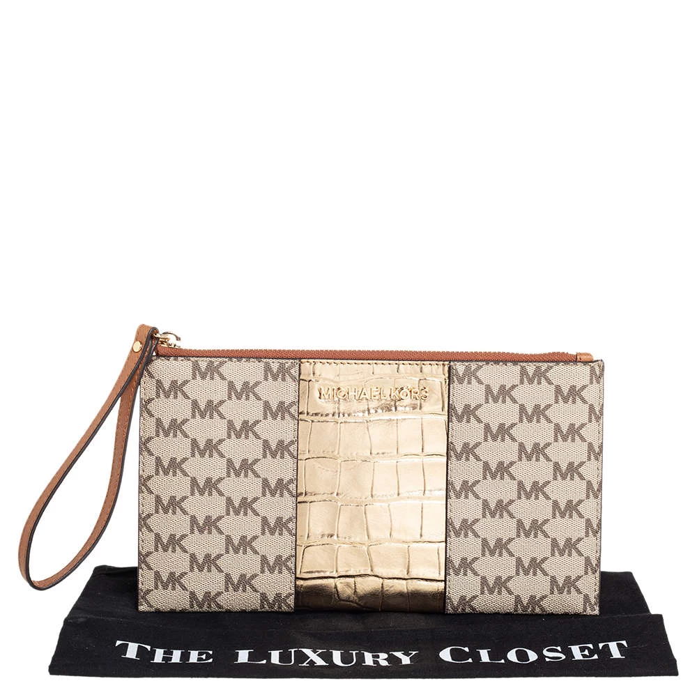 This Michael Kors clutch is beautiful in so many ways. From its minimal design to its classy silhouette, the signature canvas & croc-embossed leather clutch exudes charm and high fashion. It flaunts the brand logo on the front, a delicate wristlet strap, and a nylon interior to house your basic essentials.