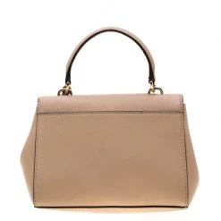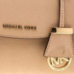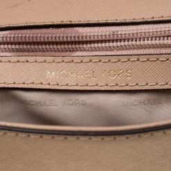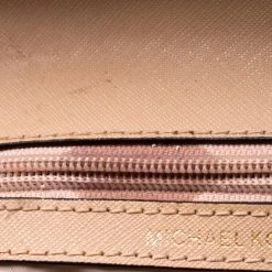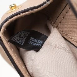 This beige crossbody bag comes from the fashion house of Michael Kors. Crafted from leather, it features a durable fabric interior that ensures to house your lipstick, wallet and other essentials. Designed with a flap closure, it flaunts gold-tone brand logo at the front.