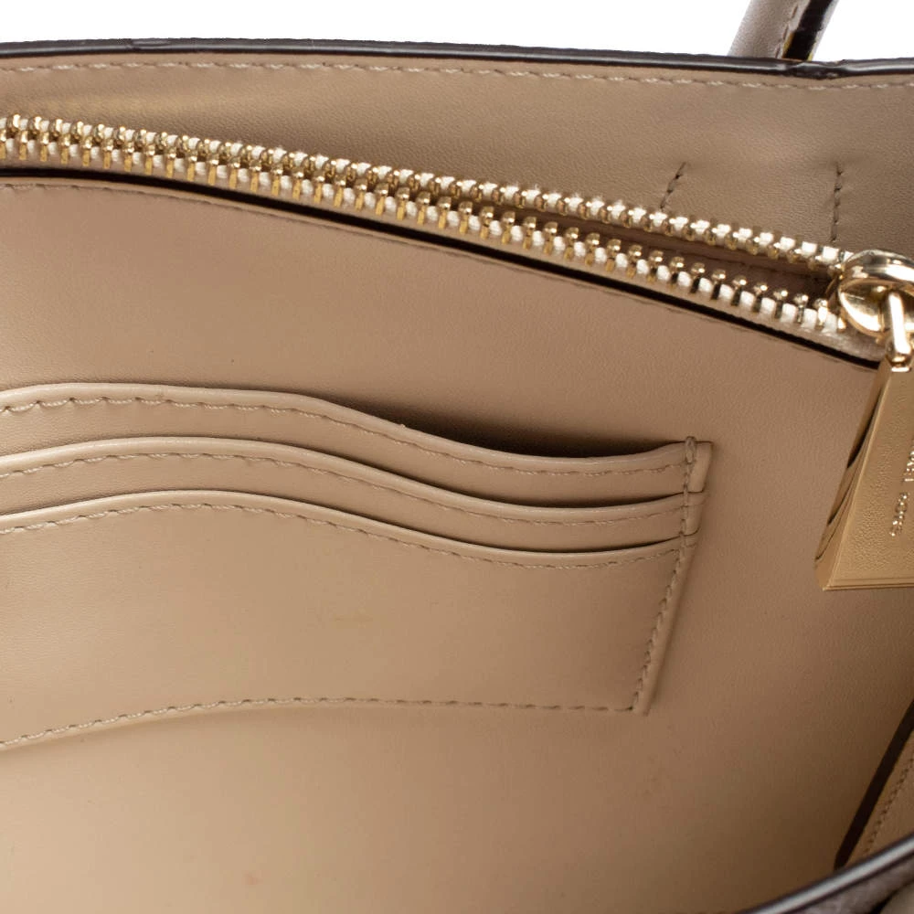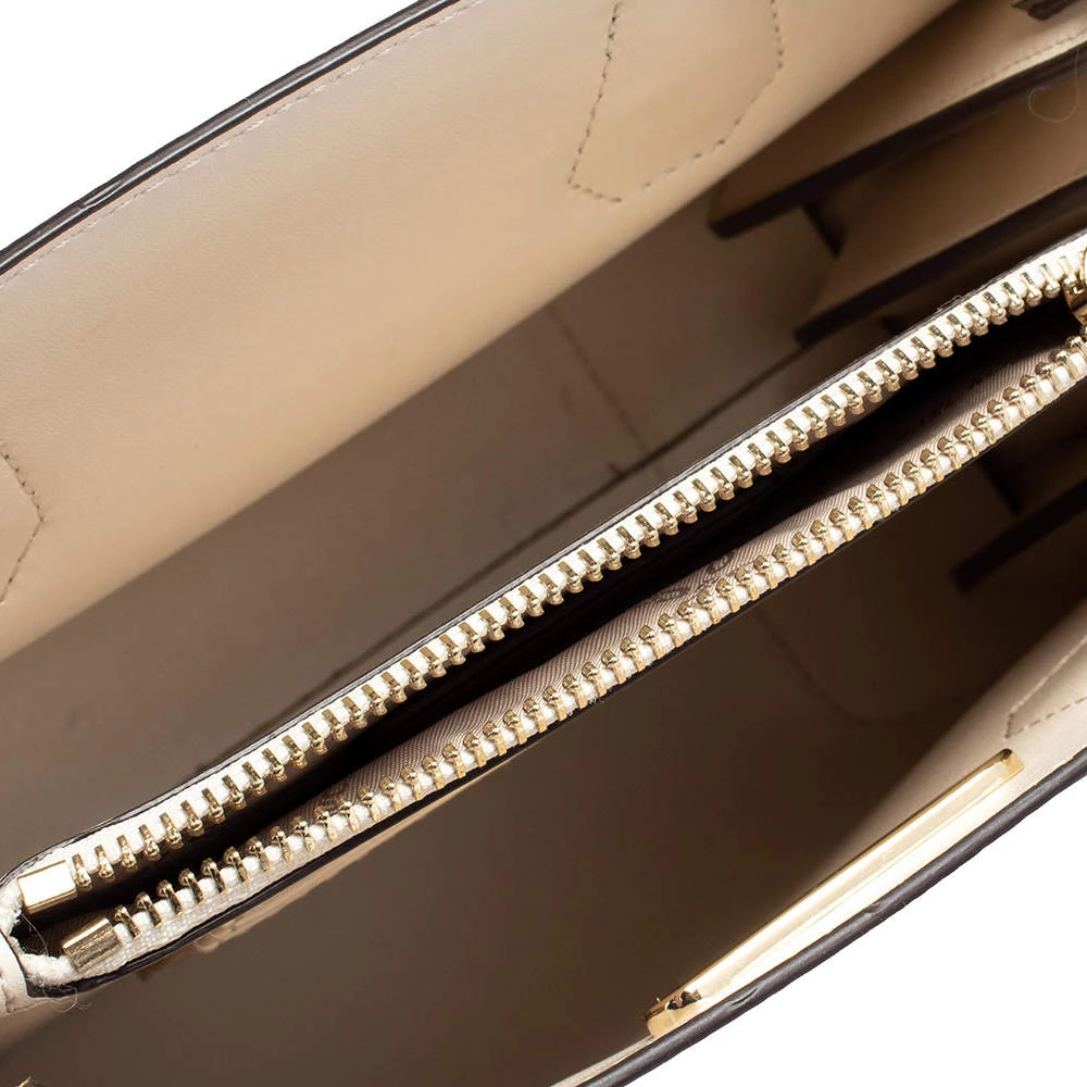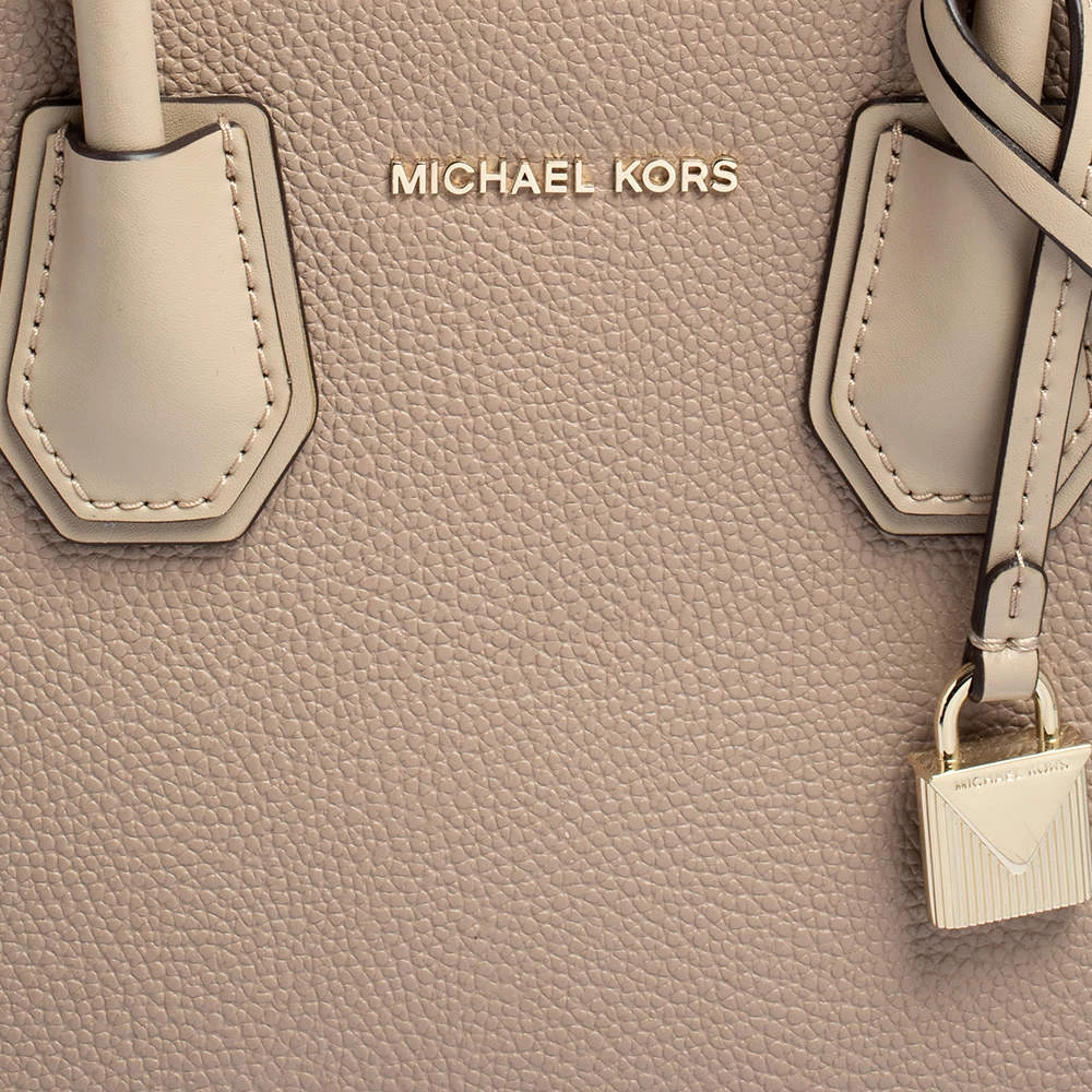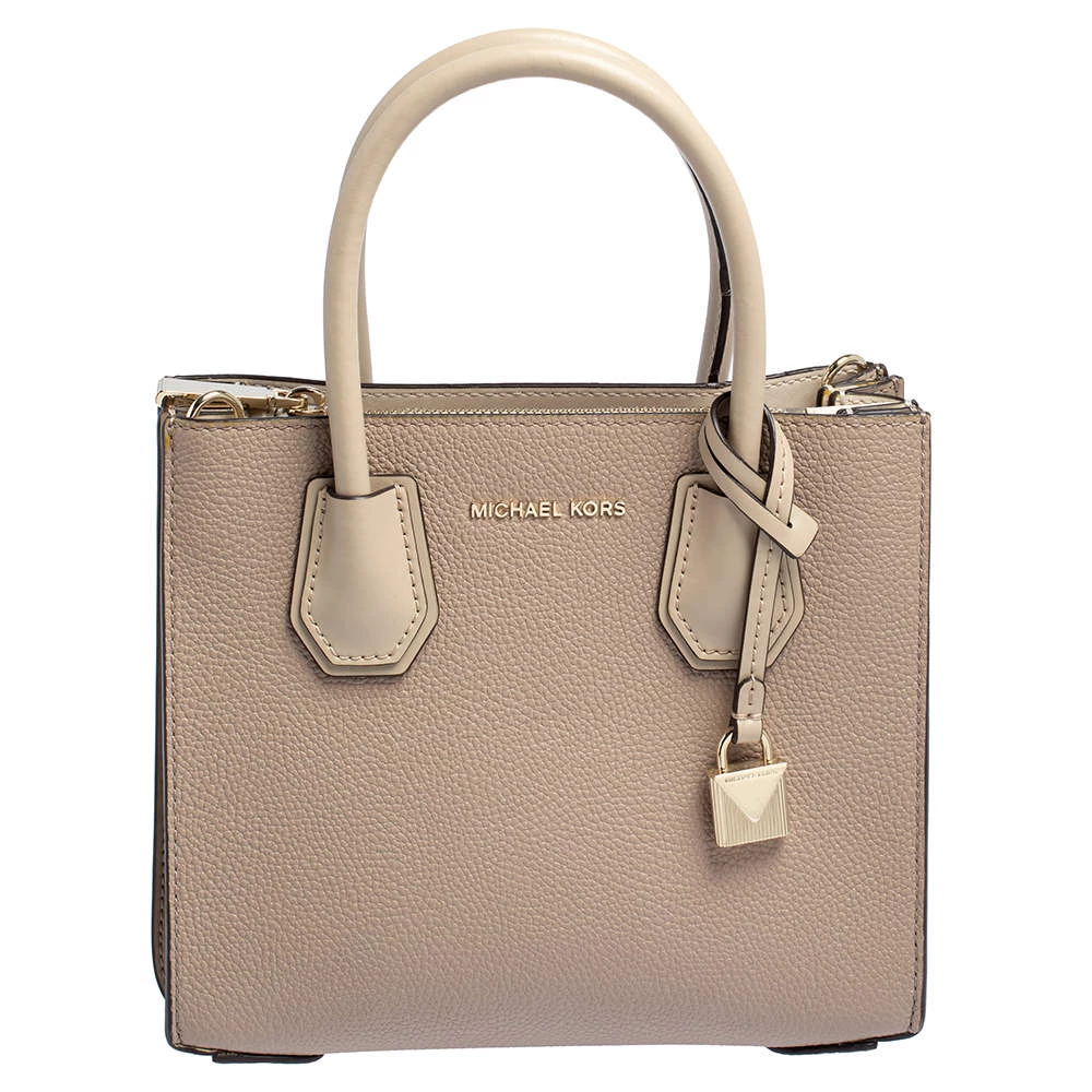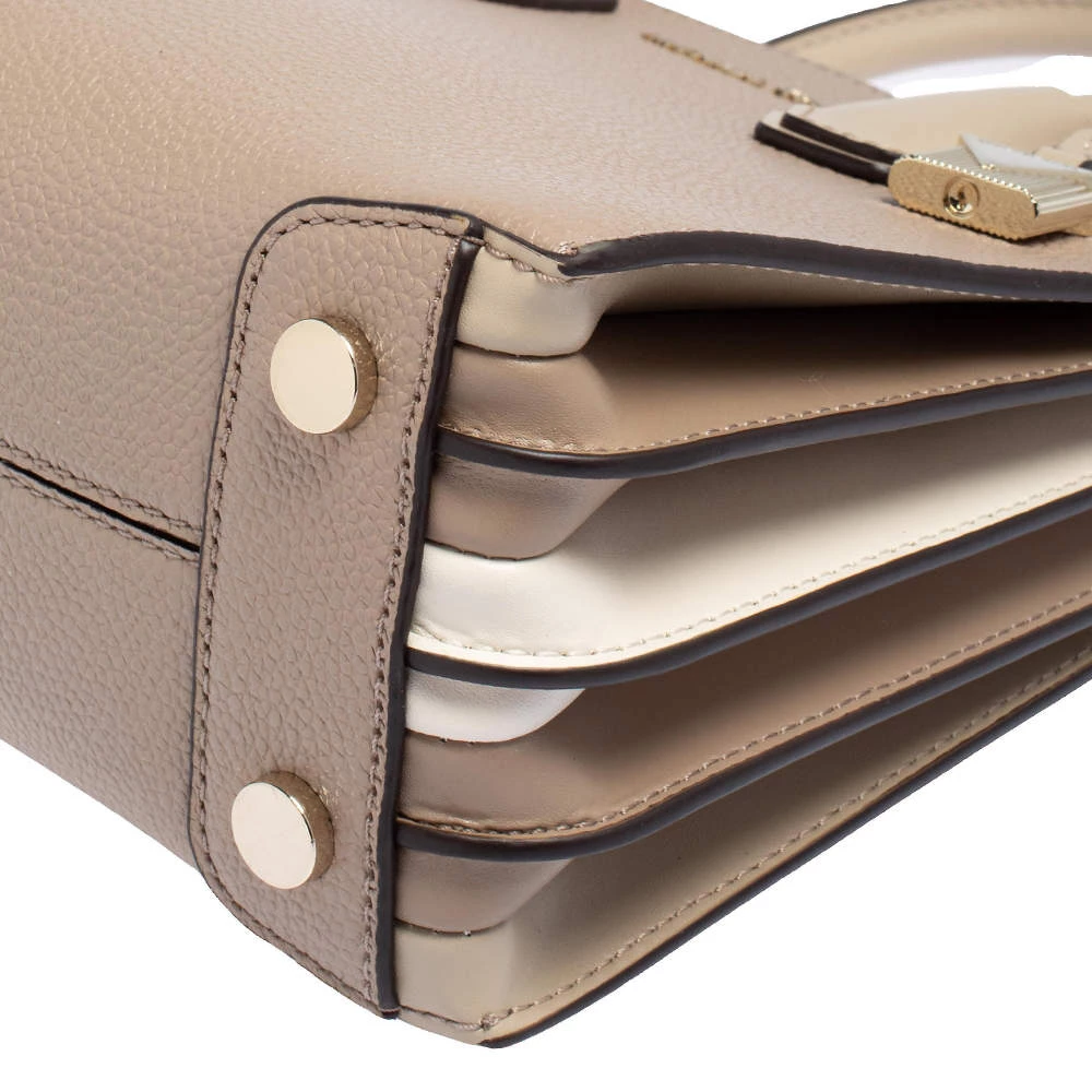 Featuring a chic and fabulous style, this Michael Michael Kors tote is modern. Crafted from leather in stunning beige, the tote features dual handles and a padlock. It opens to a spacious leather and nylon interior divided by a zipped compartment. The tote comes with protective metal feet and you are sure to love swinging this beauty.