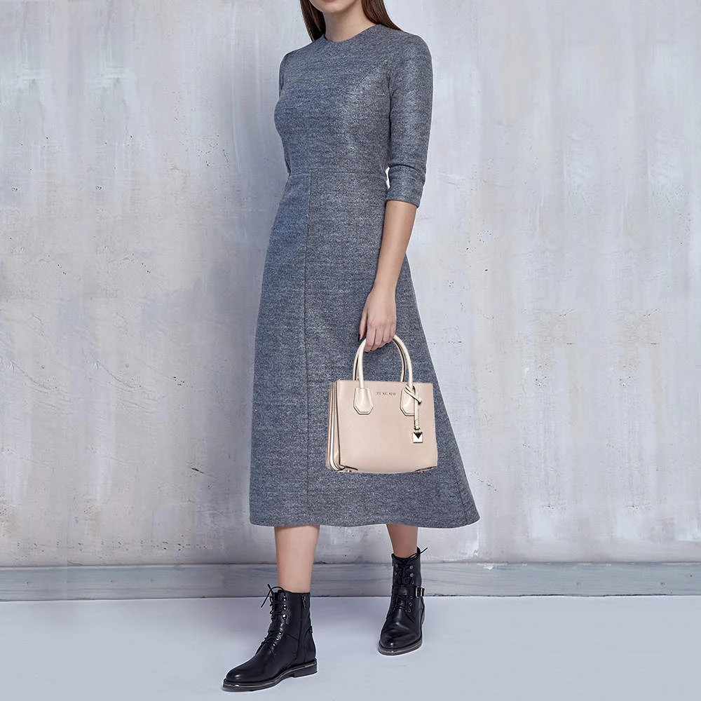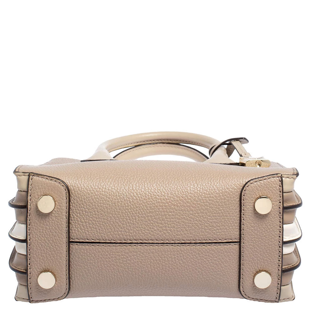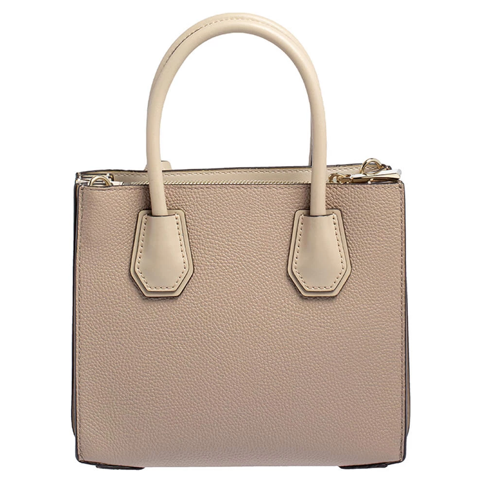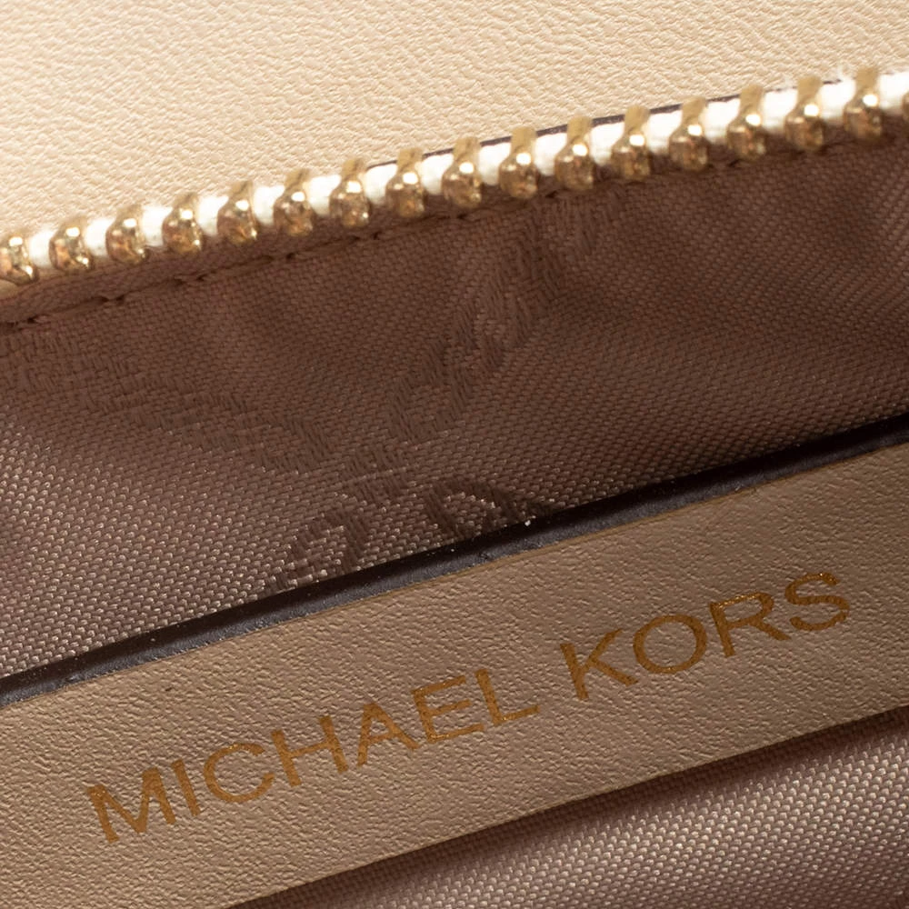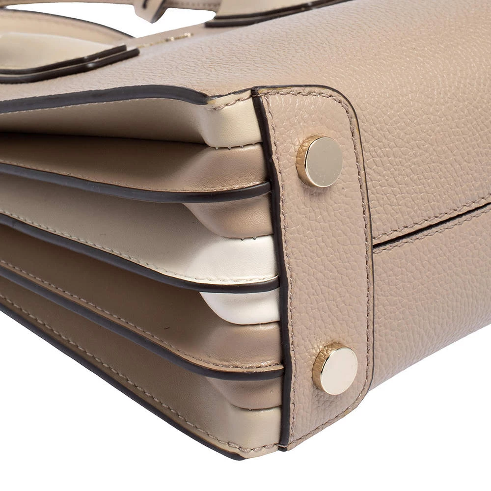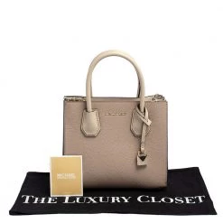 Featuring a chic and fabulous style, this Michael Michael Kors tote is modern. Crafted from leather in stunning beige, the tote features dual handles and a padlock. It opens to a spacious leather and nylon interior divided by a zipped compartment. The tote comes with protective metal feet and you are sure to love swinging this beauty.