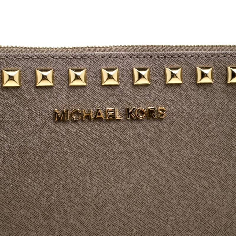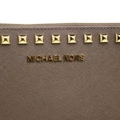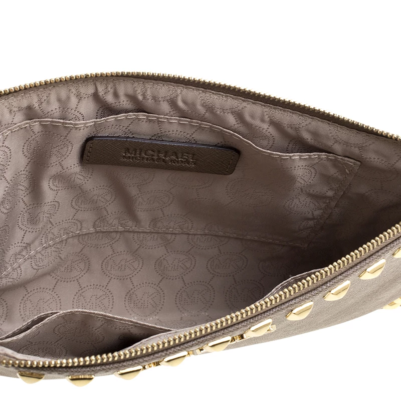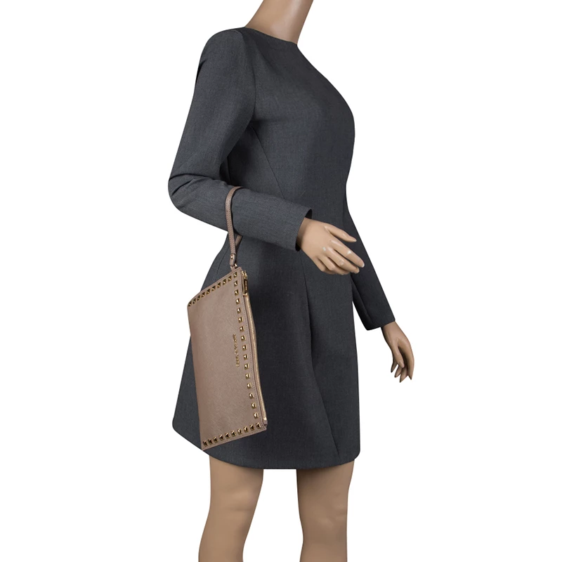 Beautifully crafted from leather, this Michael Kors clutch is a sweet buy! The piece features a fabric interior secured by a zipper and a wristlet. Decorated with stud detailing, this clutch is truly functional and stylish.