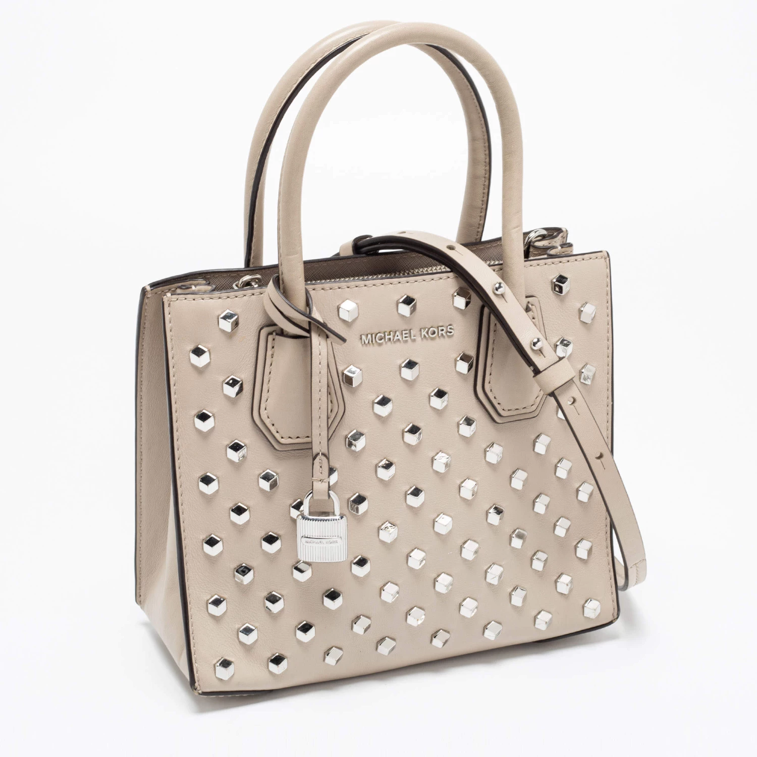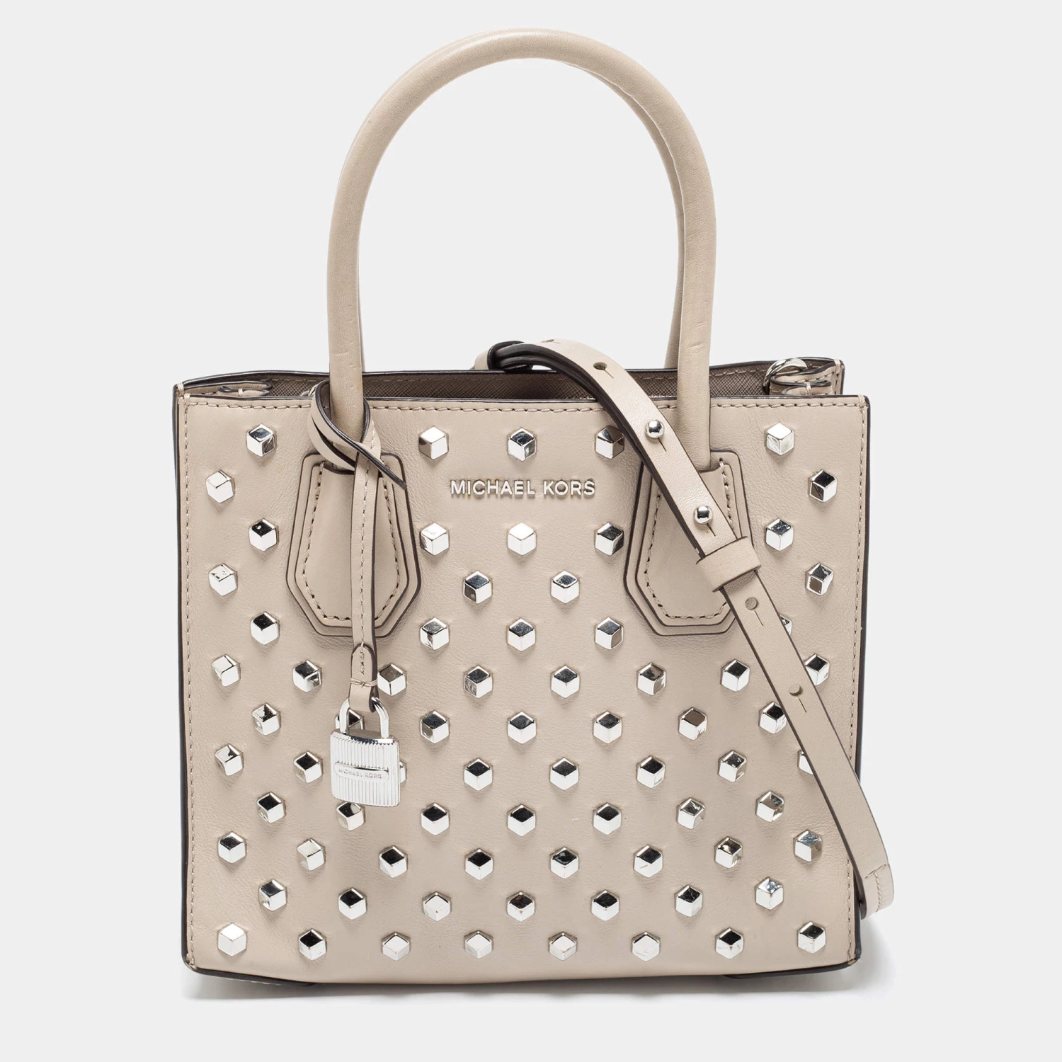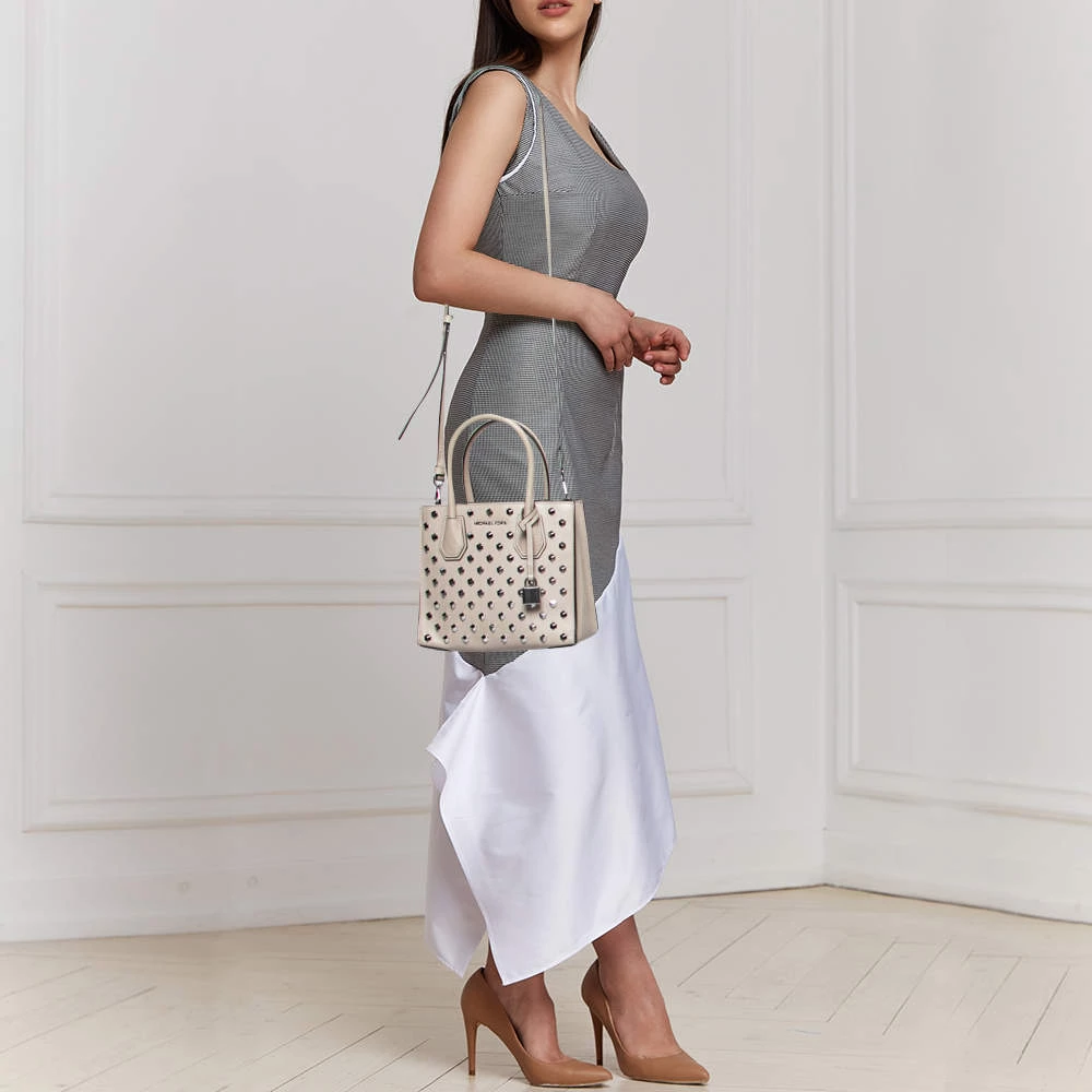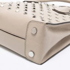 Featuring a chic and fabulous studded style, this Michael Kors tote is modern. Crafted from leather in stunning beige, the tote features dual handles, a removable shoulder strap, and a padlock. It opens to a spacious leather interior divided by a zipped compartment. The tote comes with protective metal feet, and you are sure to love swinging this beauty.