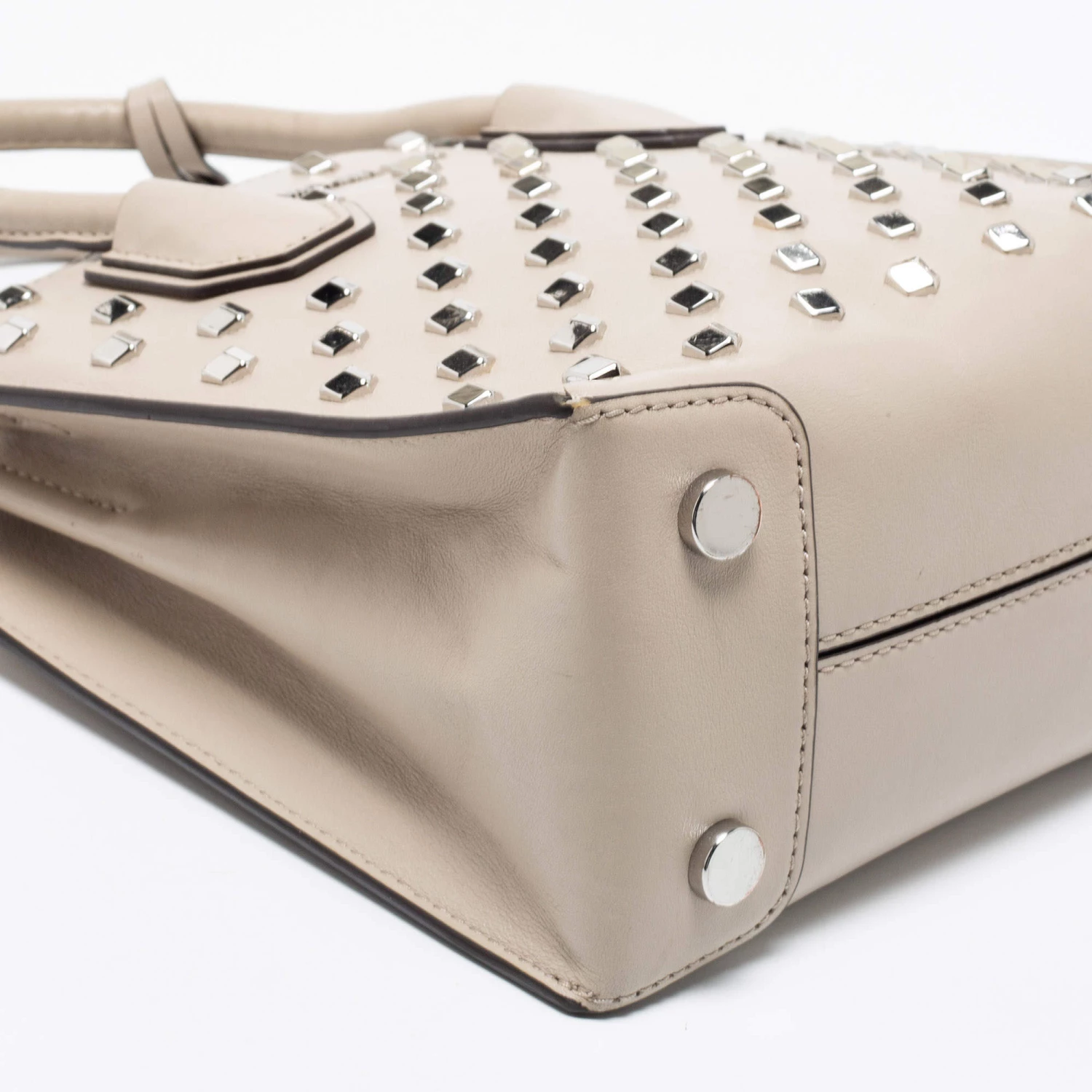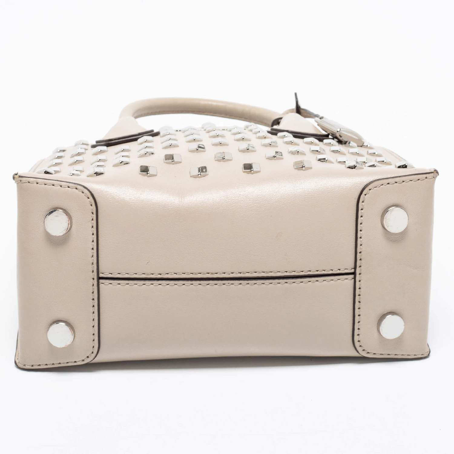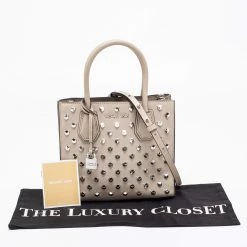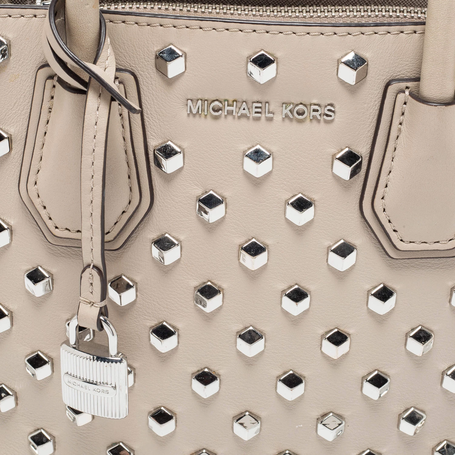 Featuring a chic and fabulous studded style, this Michael Kors tote is modern. Crafted from leather in stunning beige, the tote features dual handles, a removable shoulder strap, and a padlock. It opens to a spacious leather interior divided by a zipped compartment. The tote comes with protective metal feet, and you are sure to love swinging this beauty.