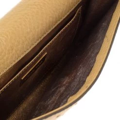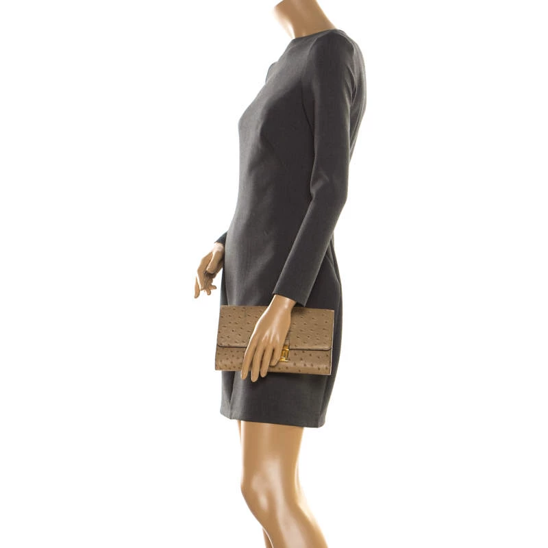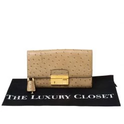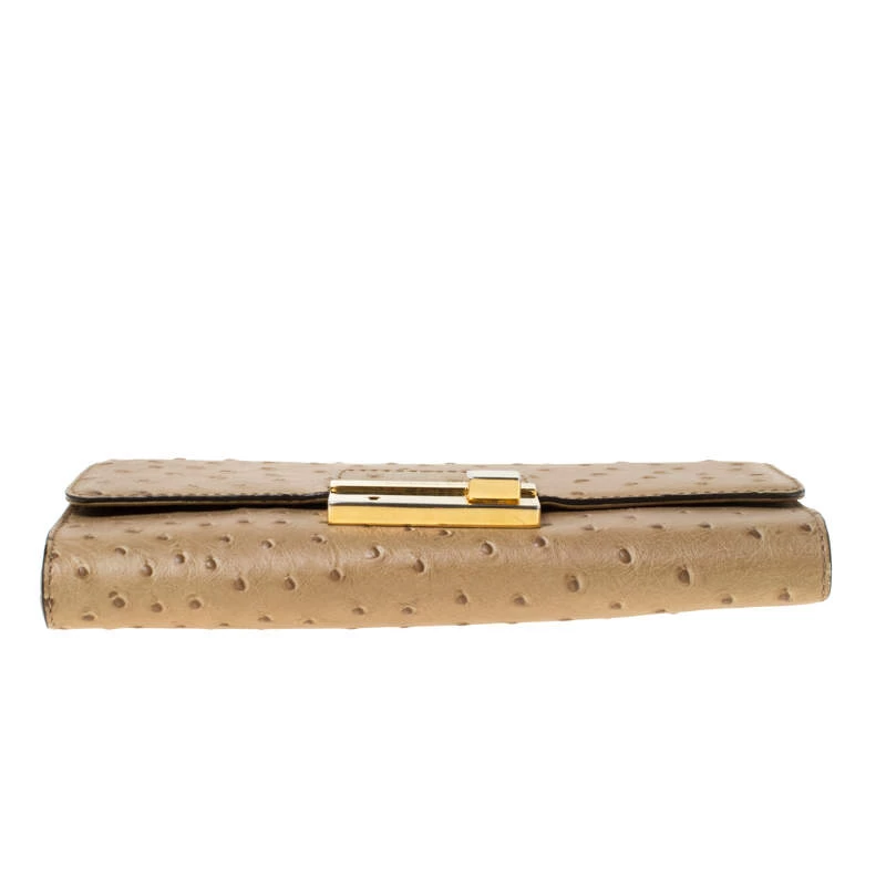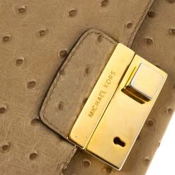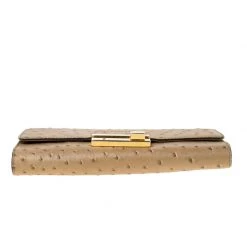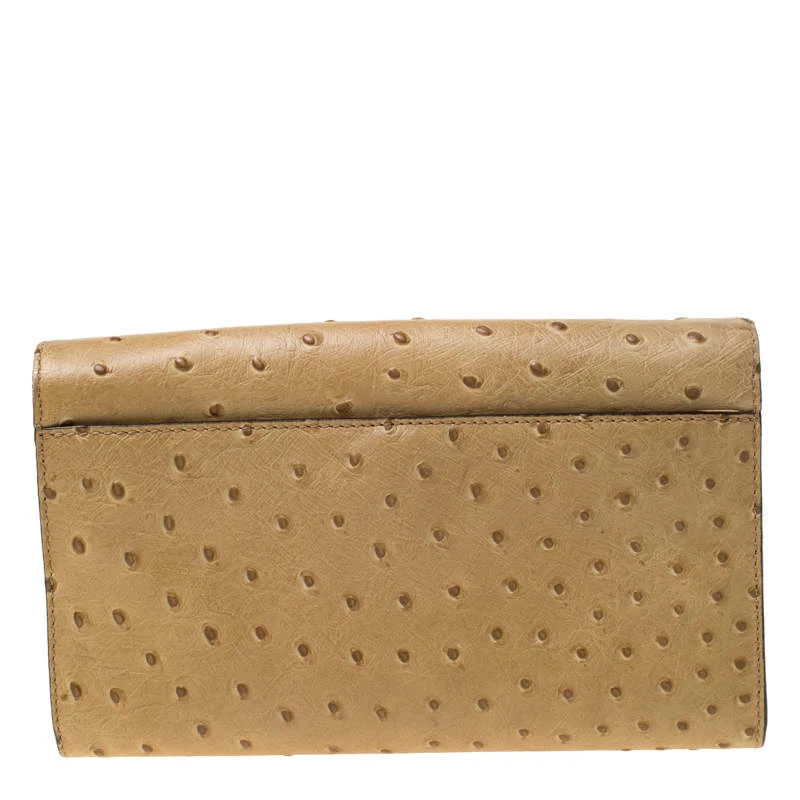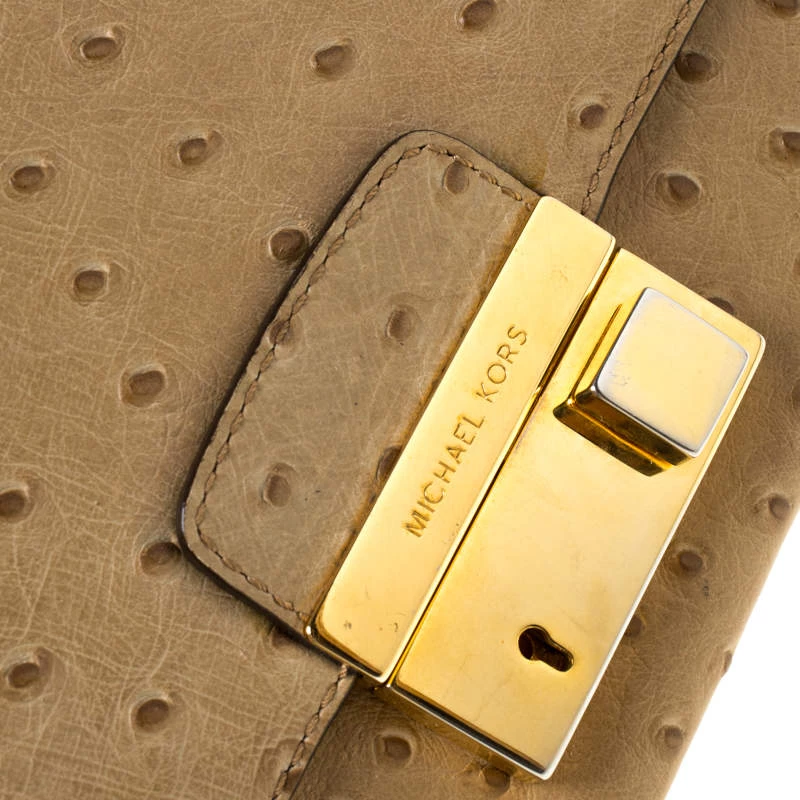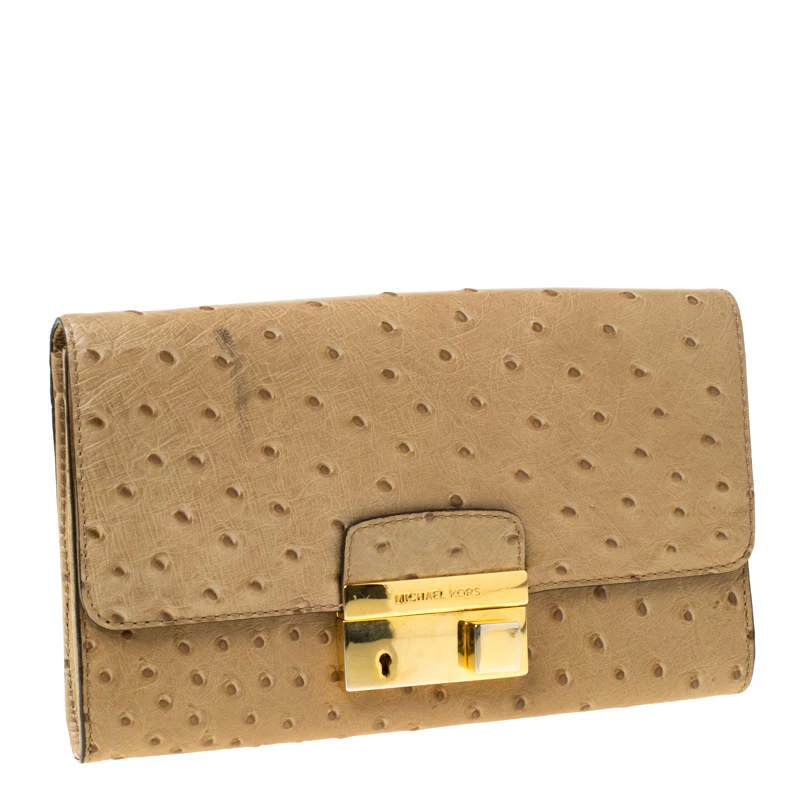 This elegant clutch from Michael Kors is easy to carry without compromising on style. Crafted from ostrich-embossed leather, the clutch features gold-tone hardware on the flap. The interior is leather-lined and has a slip pocket.