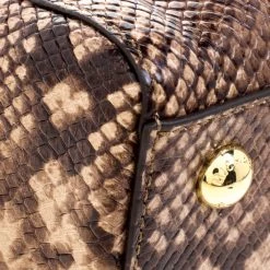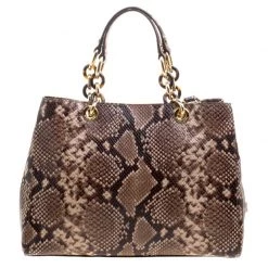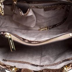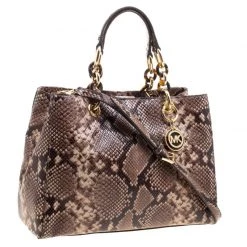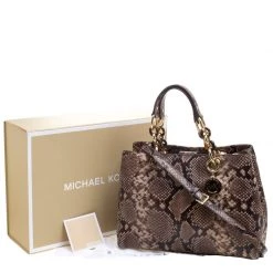 This stunning Cynthia satchel from Michael Kors will make a standout addition to your collection. The bag features dual top handles, a shoulder strap, protective metal feet, a Michael Kors charm and a Python embossed leather exterior. It has a spacious fabric lined interior that has two open compartments divided by a zipped compartment.