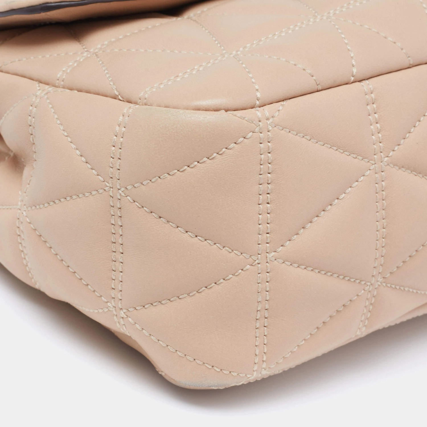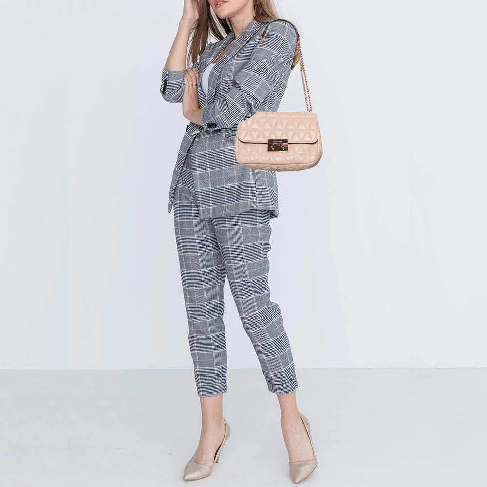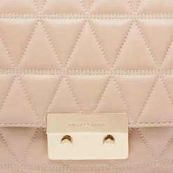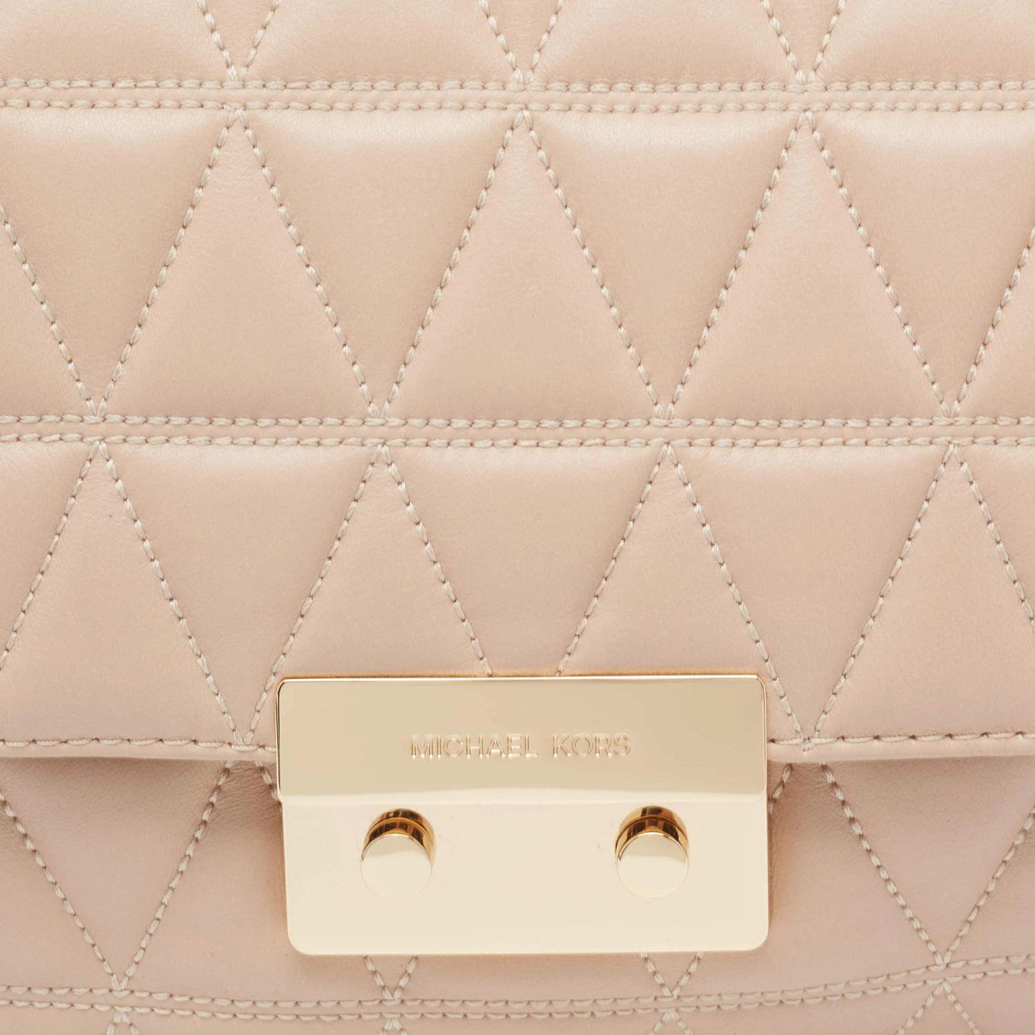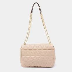 Accessorize your outfit with this stylish and classy Michael Kors bag. Crafted from quilted leather in a beige hue, it is held by a chain-leather shoulder strap and features branded lock closure on the front flap. The nylon-lined interior is equipped with pockets.