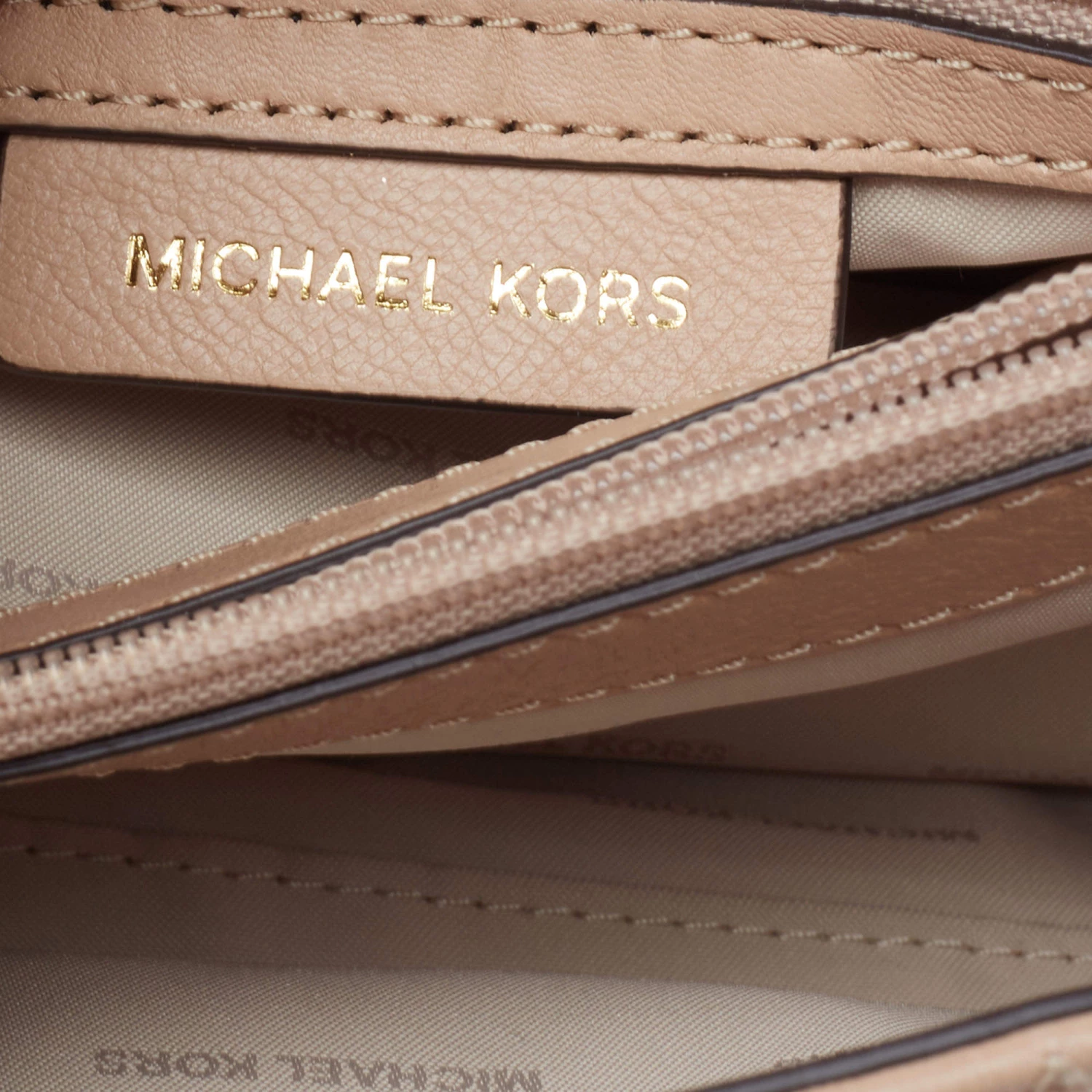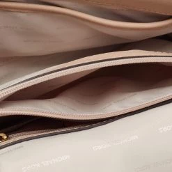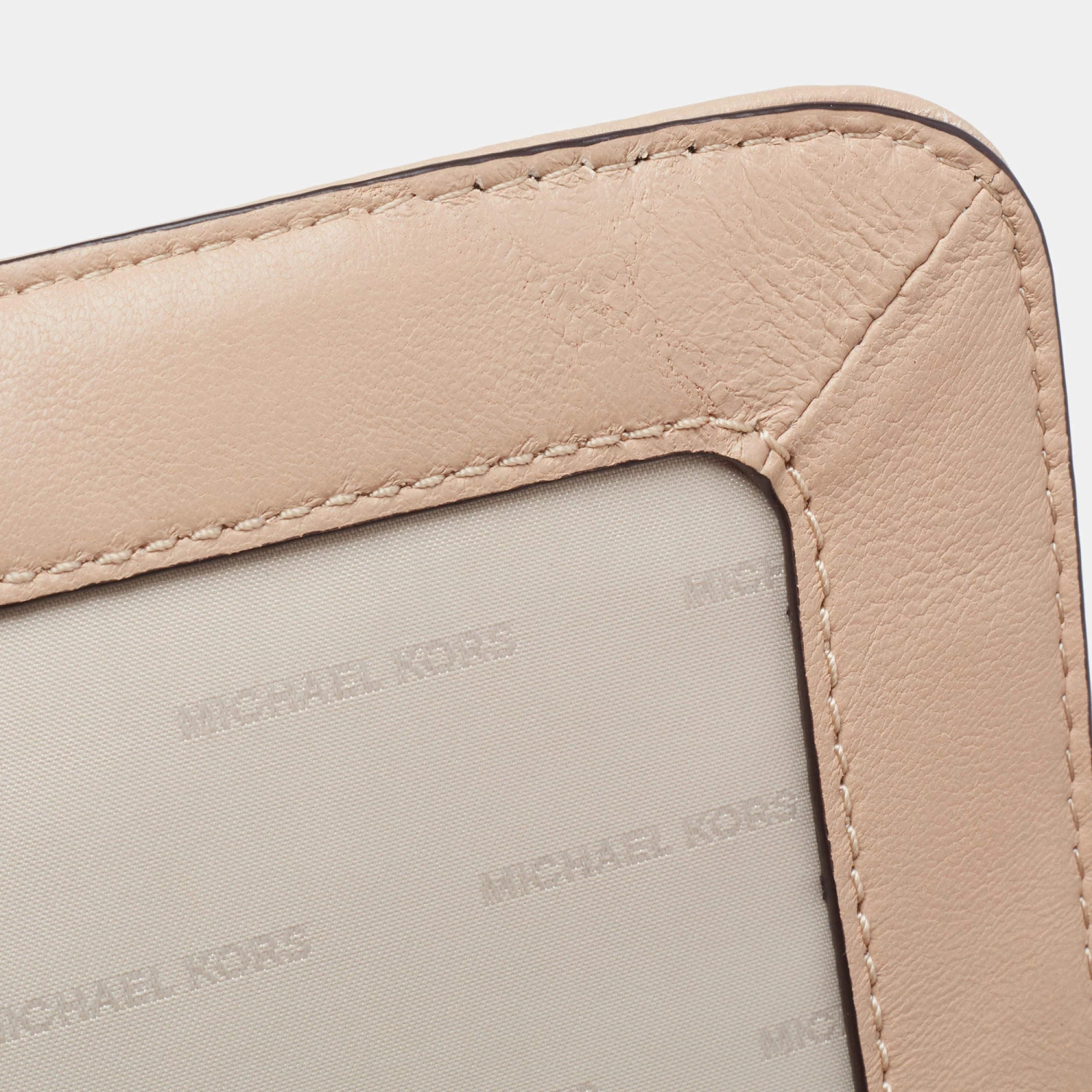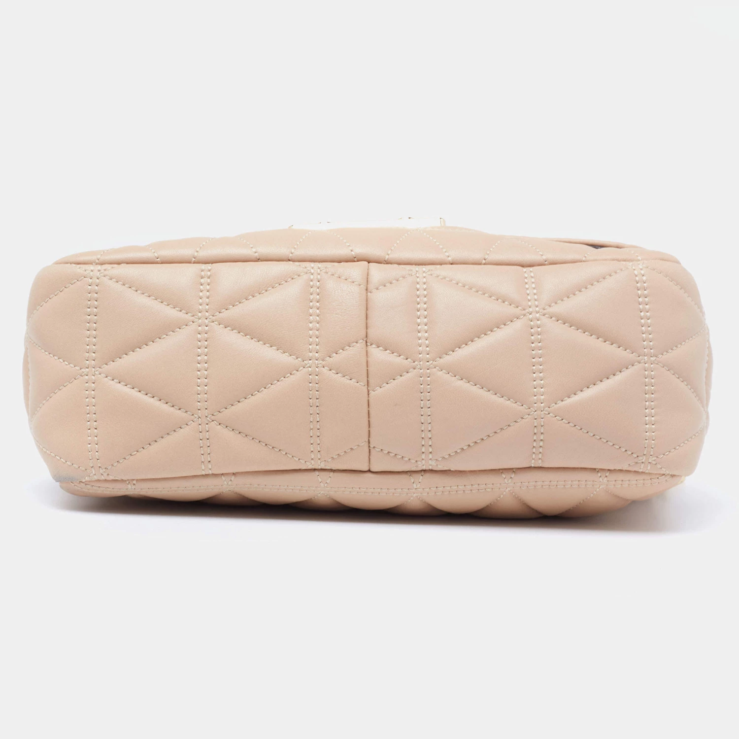 Accessorize your outfit with this stylish and classy Michael Kors bag. Crafted from quilted leather in a beige hue, it is held by a chain-leather shoulder strap and features branded lock closure on the front flap. The nylon-lined interior is equipped with pockets.