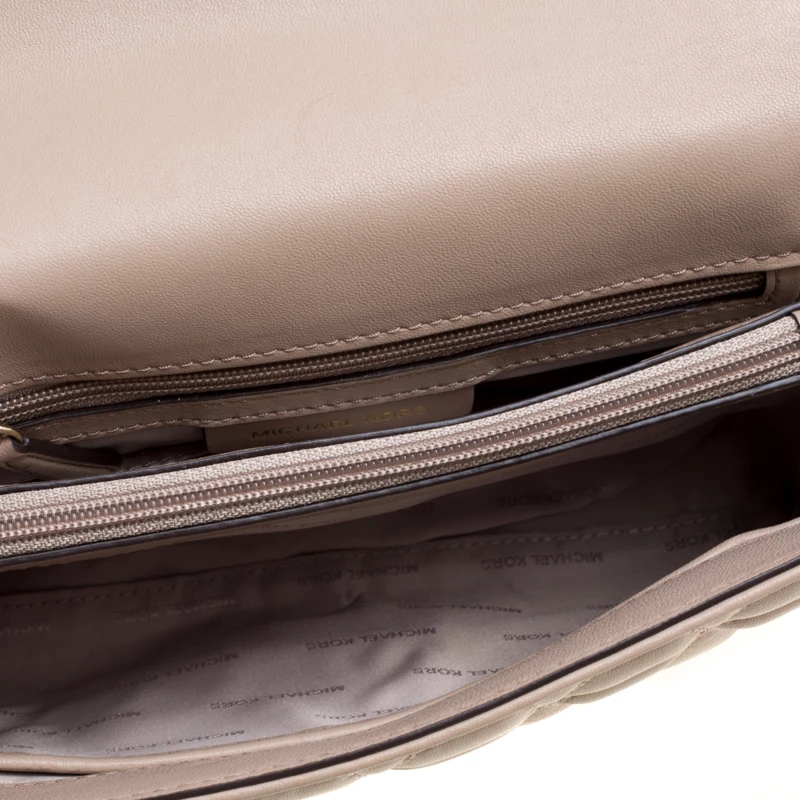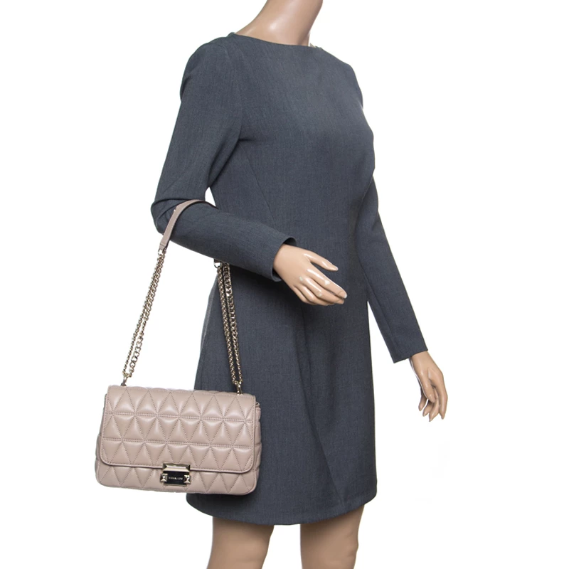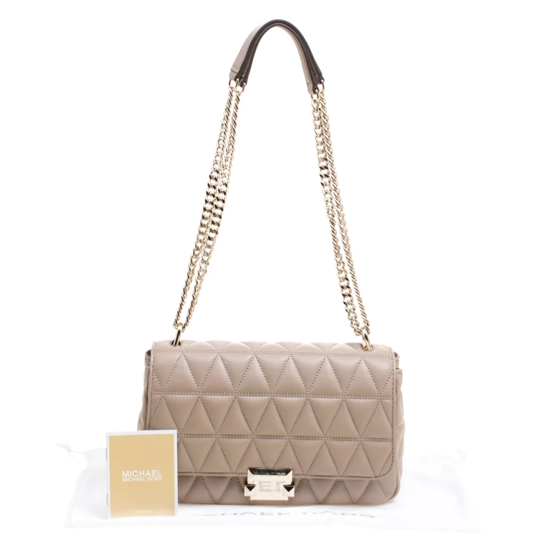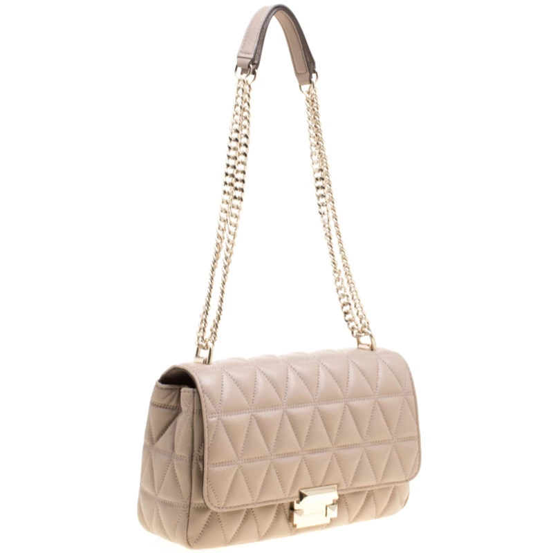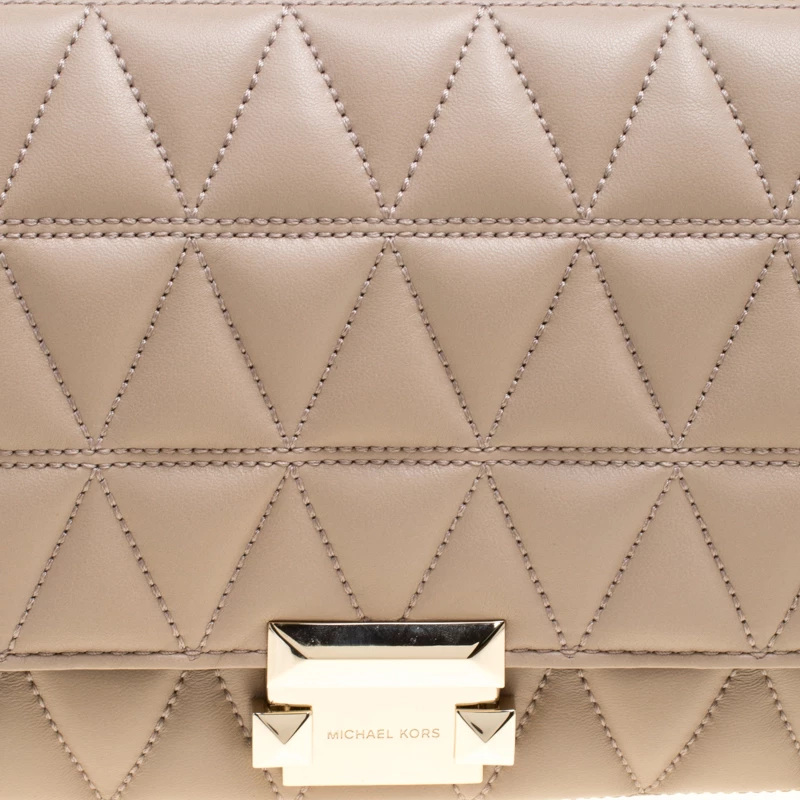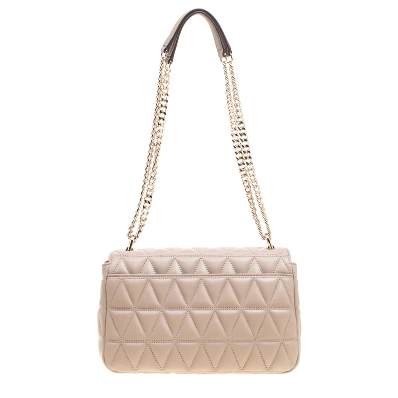 With the festivities around the corner, pamper yourself with this chic shoulder bag from the house of Michael Kors. It has been designed from a beige quilted leather body with a flap style secured with a silver-tone buckle closure. It comes fitted with chain shoulder strap fitted with a leather shoulder pad. This bag is ideally proportioned to hold your evening essentials in great style.