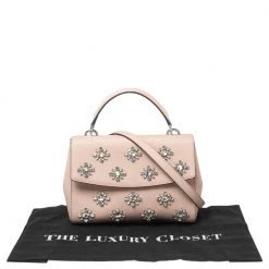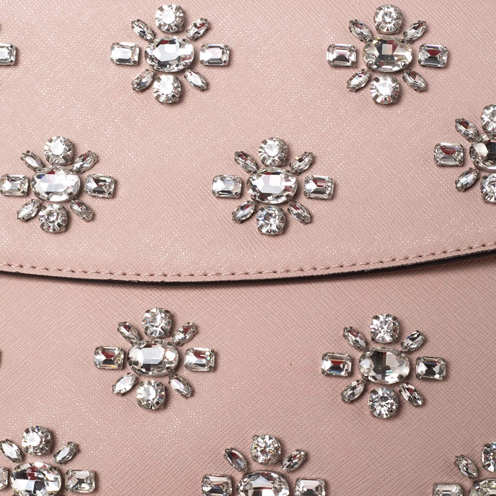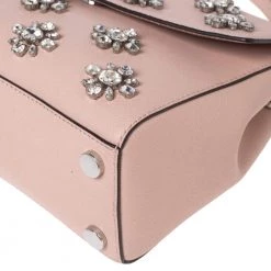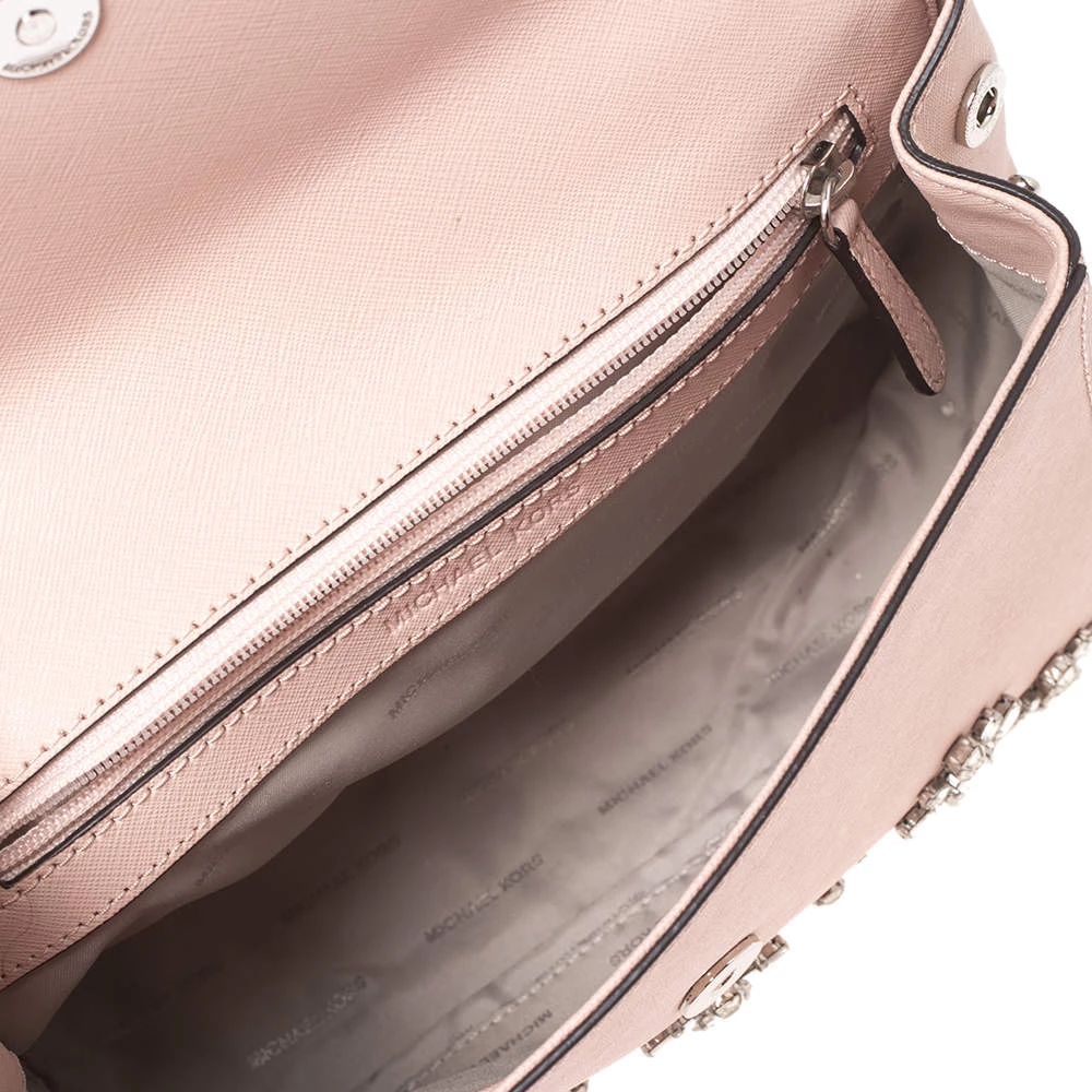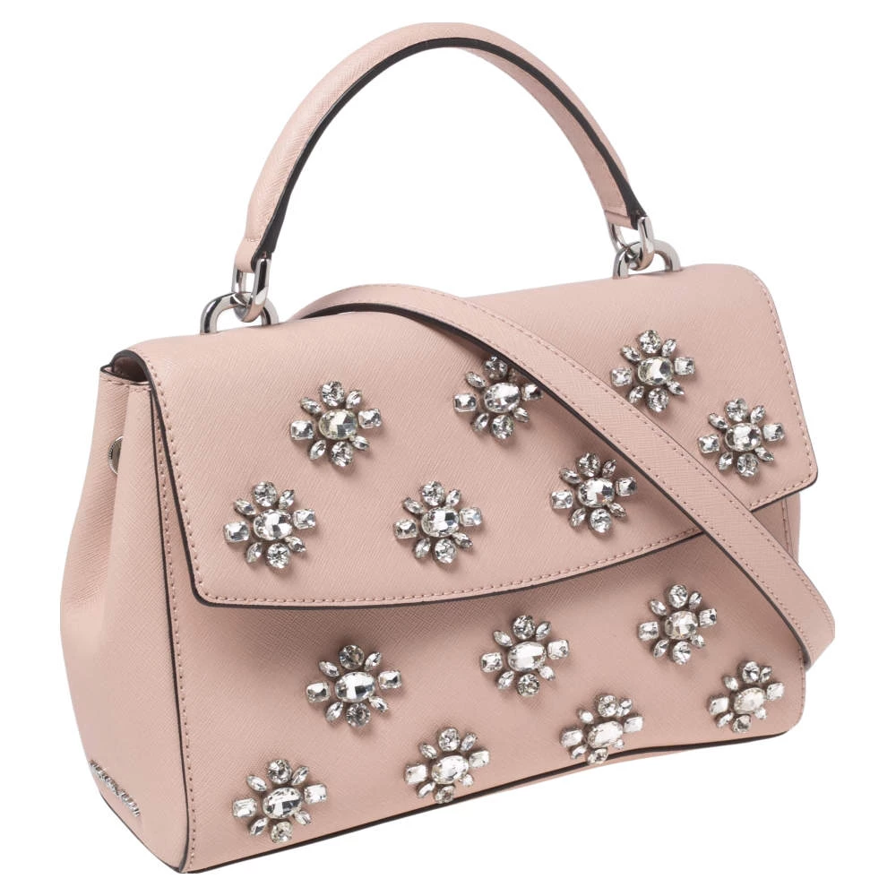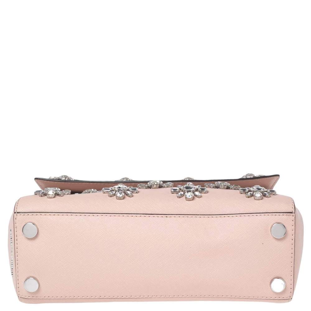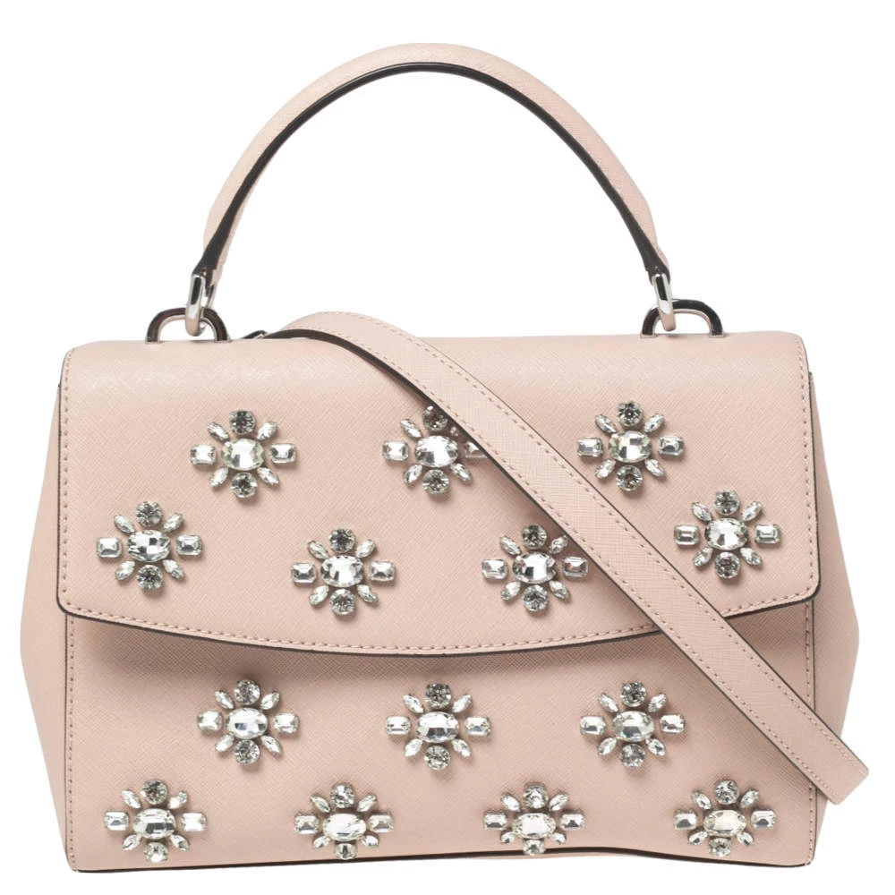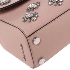 How beautiful is this Ava bag from the House of Michael Kors! Crafted using beige Saffiano leather on the exterior, this bag flaunts intricate crystal embellishments on the front. It is accented with a top handle, silver-tone hardware, and a nylon-lined interior.