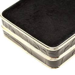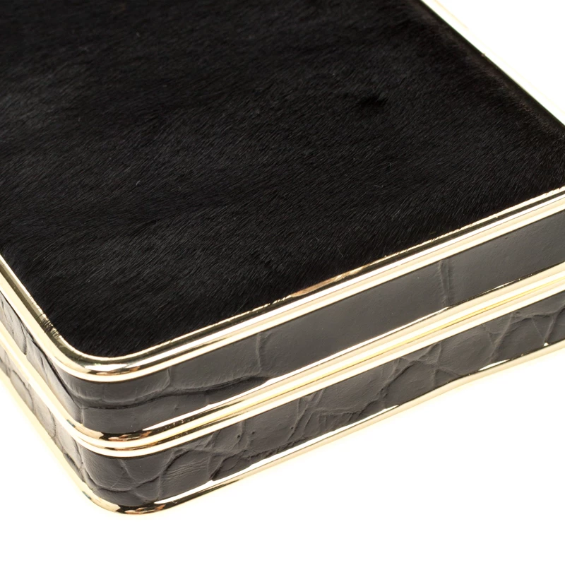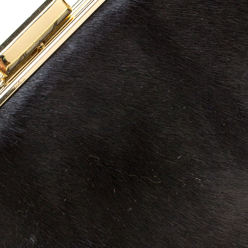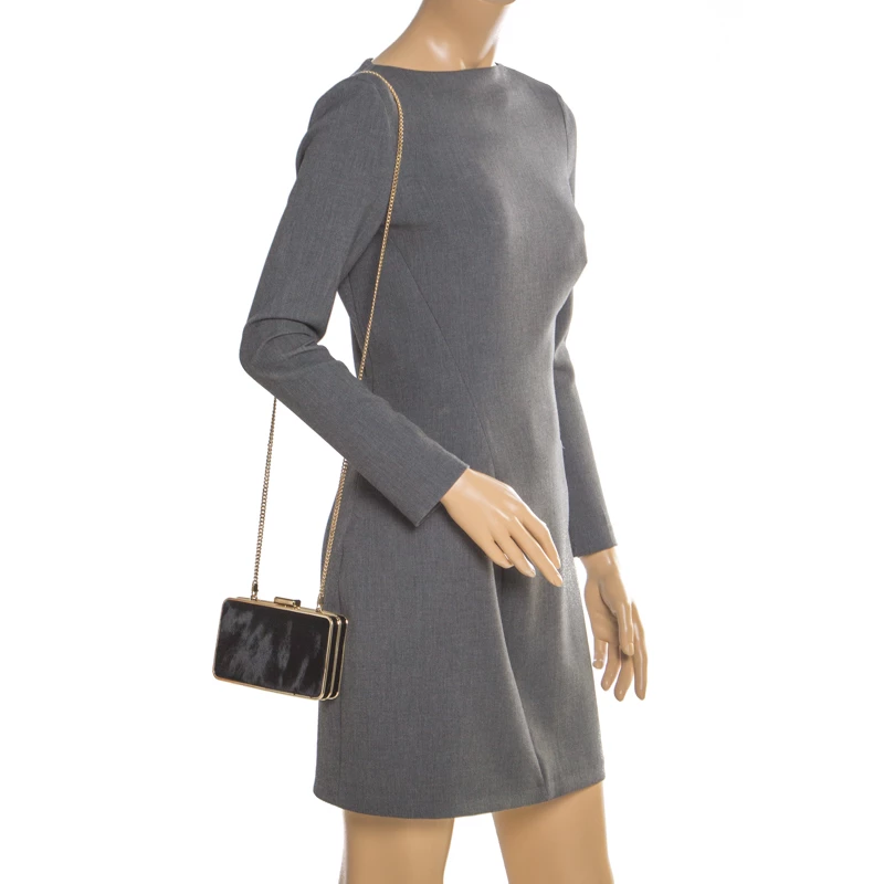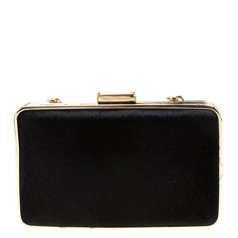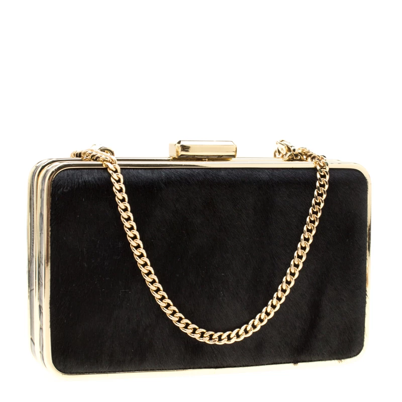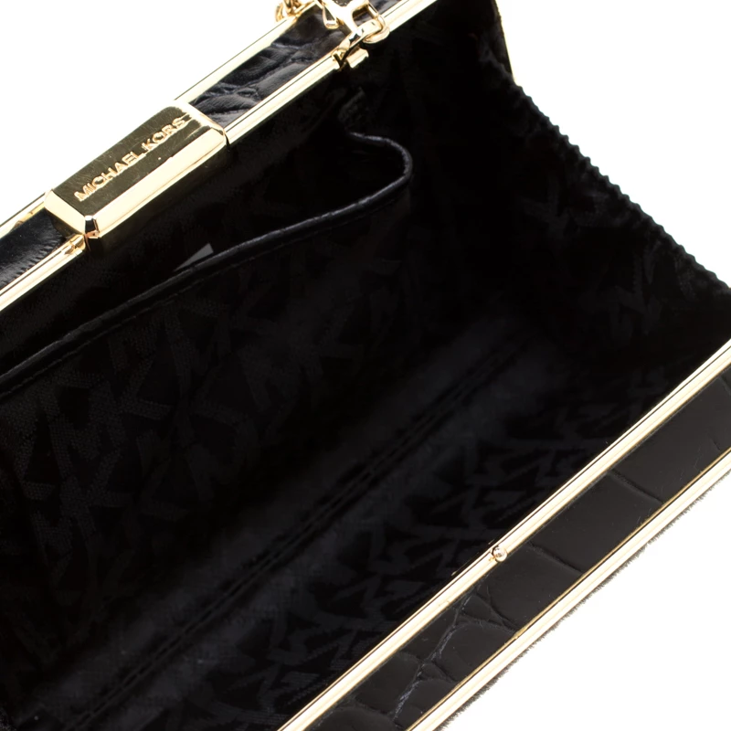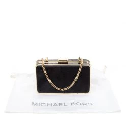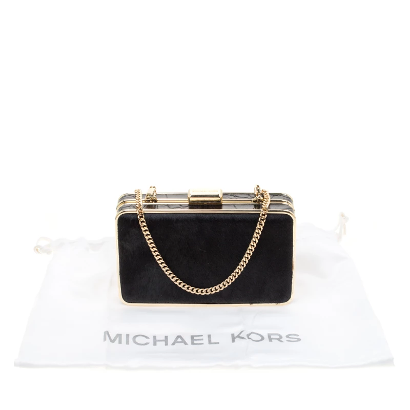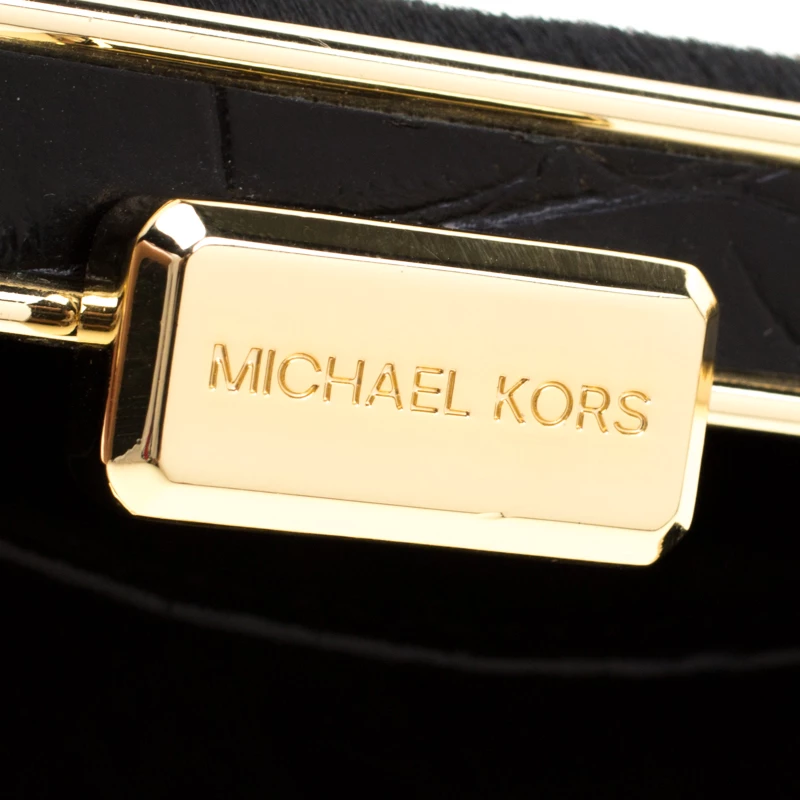 Elegant and eye-catching, this Elsie box clutch by Michael Kors is perfect for a fun night out. Crafted in exotic calfhair and trimmed with croc-embossed leather on the outlines, it features a timeless black hue and is accentuated with gold-tone metal. Secured with a label-engraved flip top closure, the clutch opens to a hold-all, fabric-lined interior. The chain link helps you carry this stunner over your shoulder.