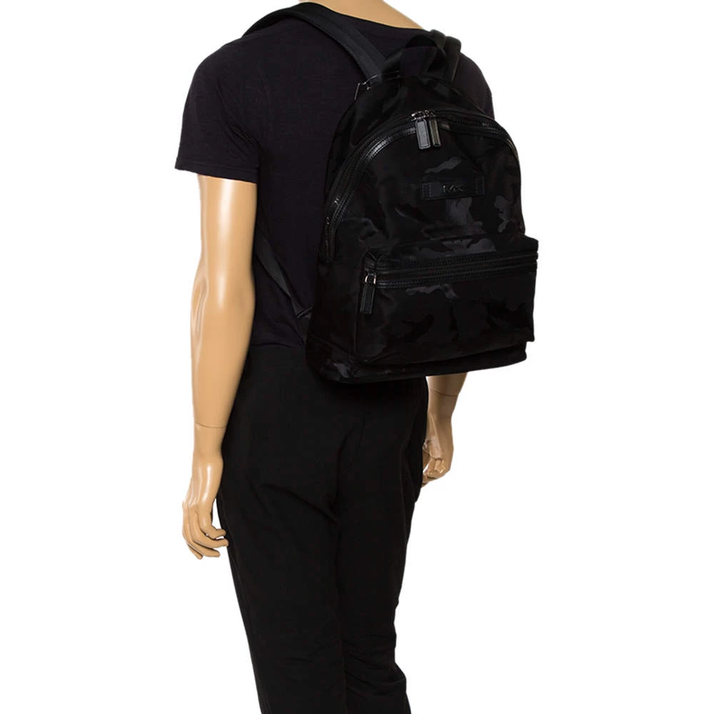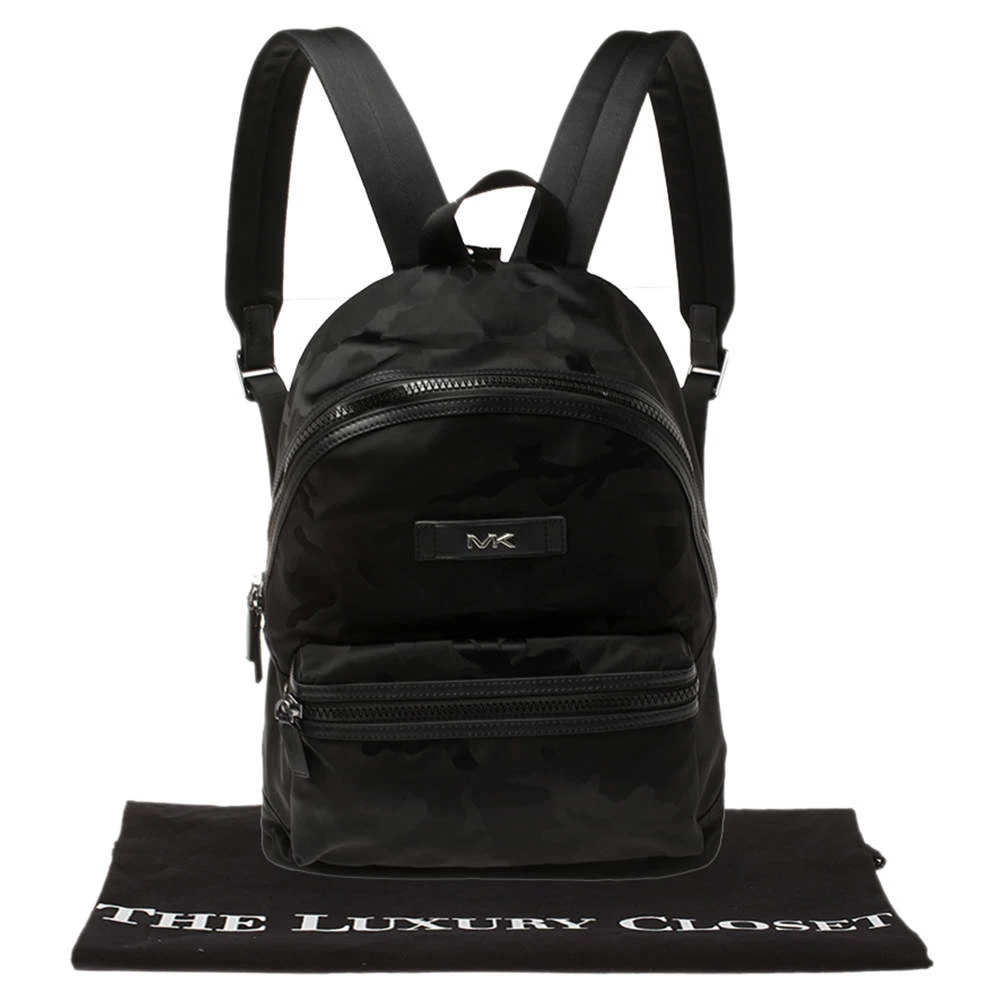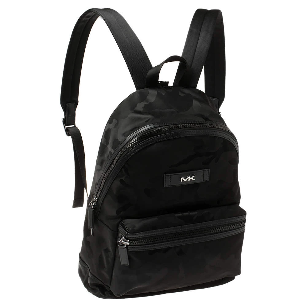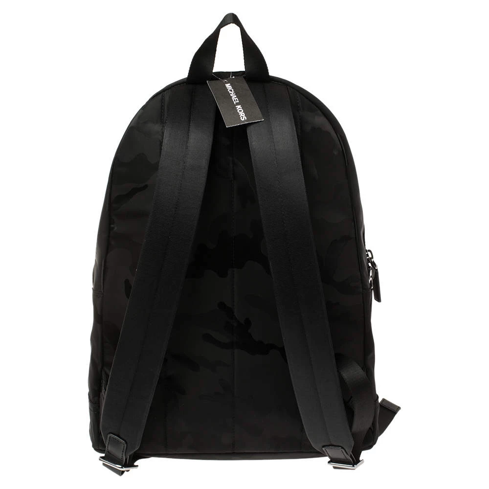 This stunning Michael Kors backpack will come in handy for daily use or as a style statement. It is crafted from camouflaged nylon and leather and designed with a front pocket as well as a spacious interior secured by a zipper. Two shoulder straps and a small top handle make it ready to be yours.