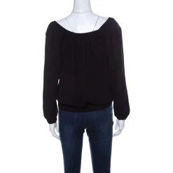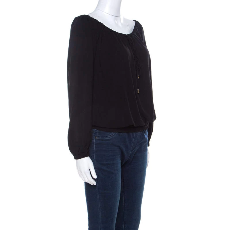 Michael Kors brings to you this black top that can be paired with almost anything in your dresser. This top is a definitive fashion choice that features long sleeves and a drawstring tie detail. It is easy to style and can be worn as an off-shoulder.