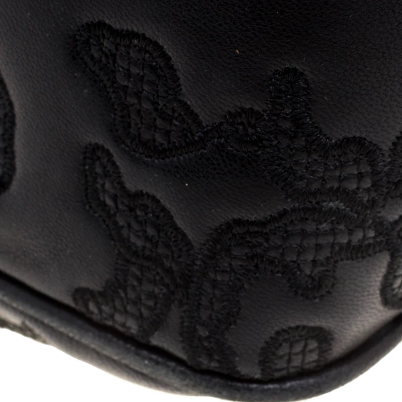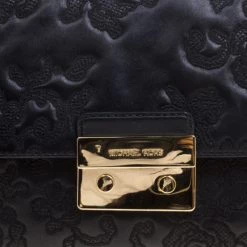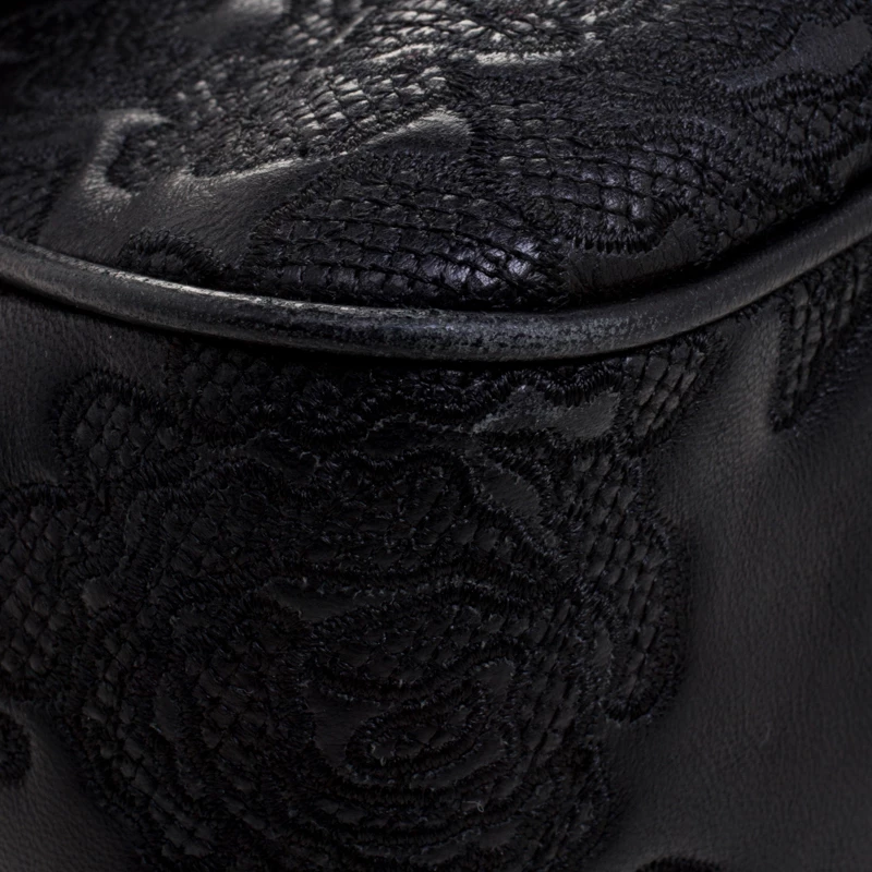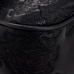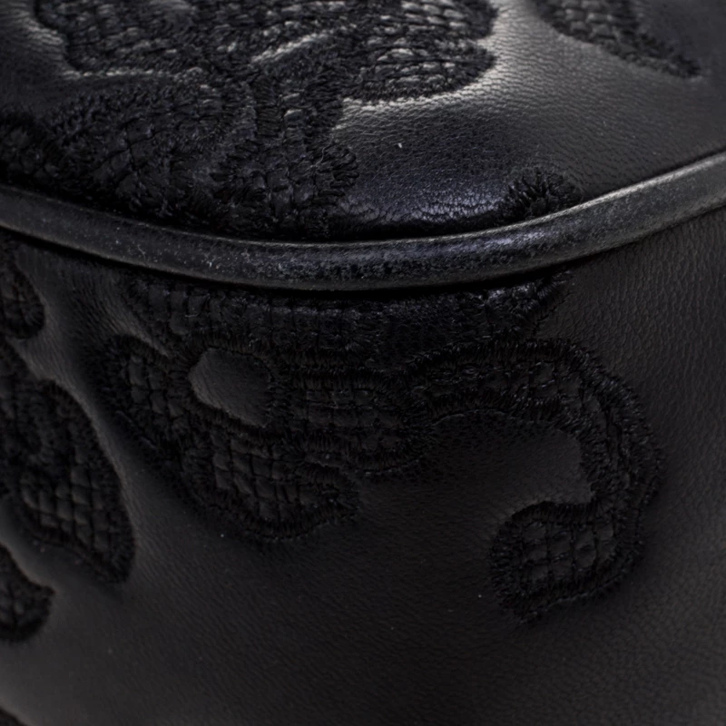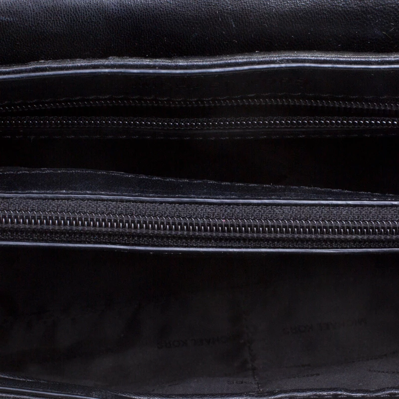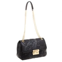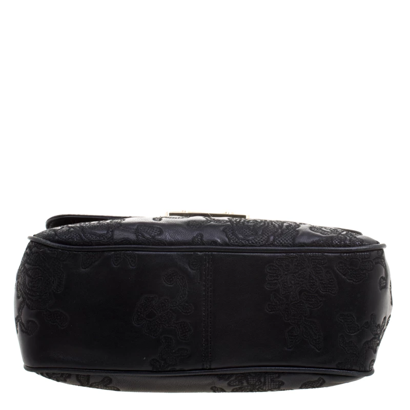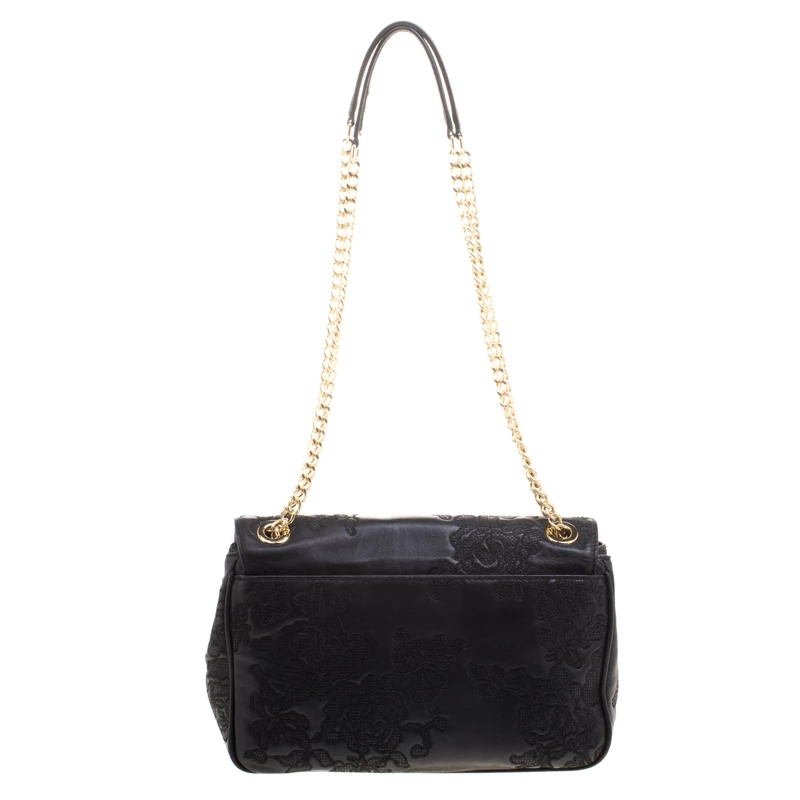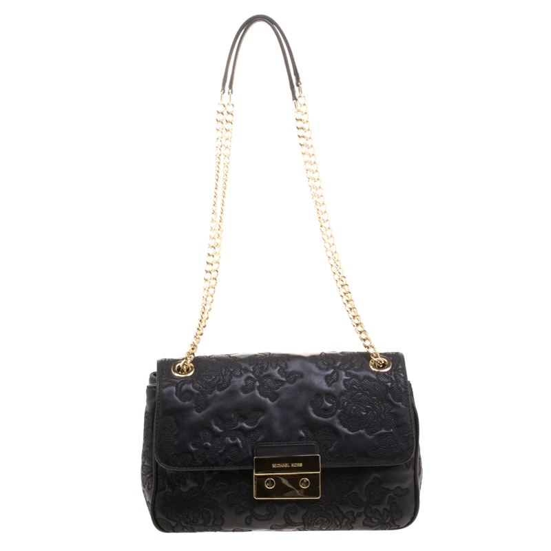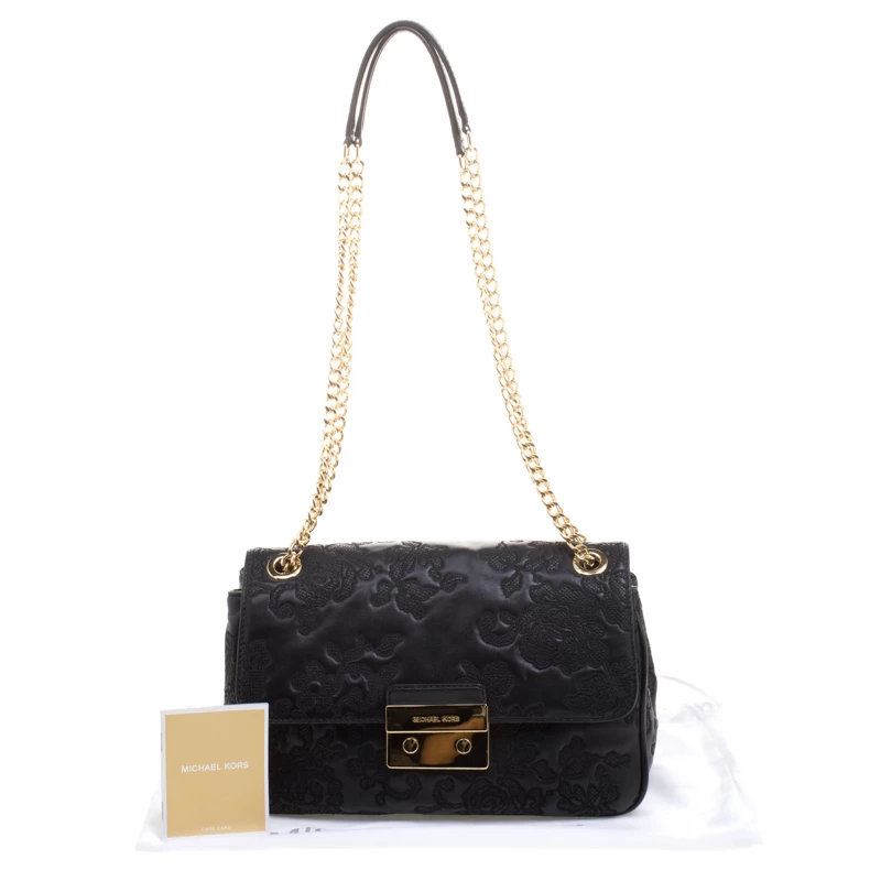 Elevate your style with this gorgeous Sloan shoulder bag by Michael Kors. Crafted from black leather the bag features a lovely lace embroidery on the exterior. It has a spacious nylon lined interior that houses two open compartments and a zipped compartment. This beauty is complete with dual chain straps with leather shoulder rest and is totally worth the splurge!