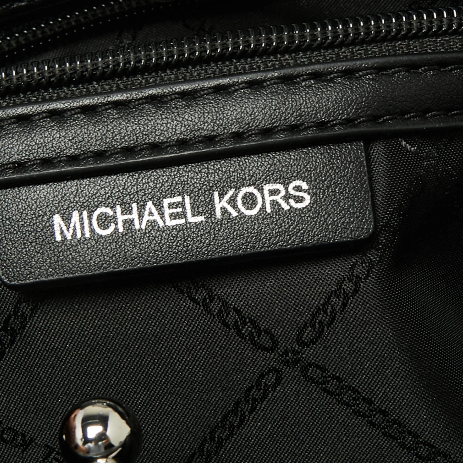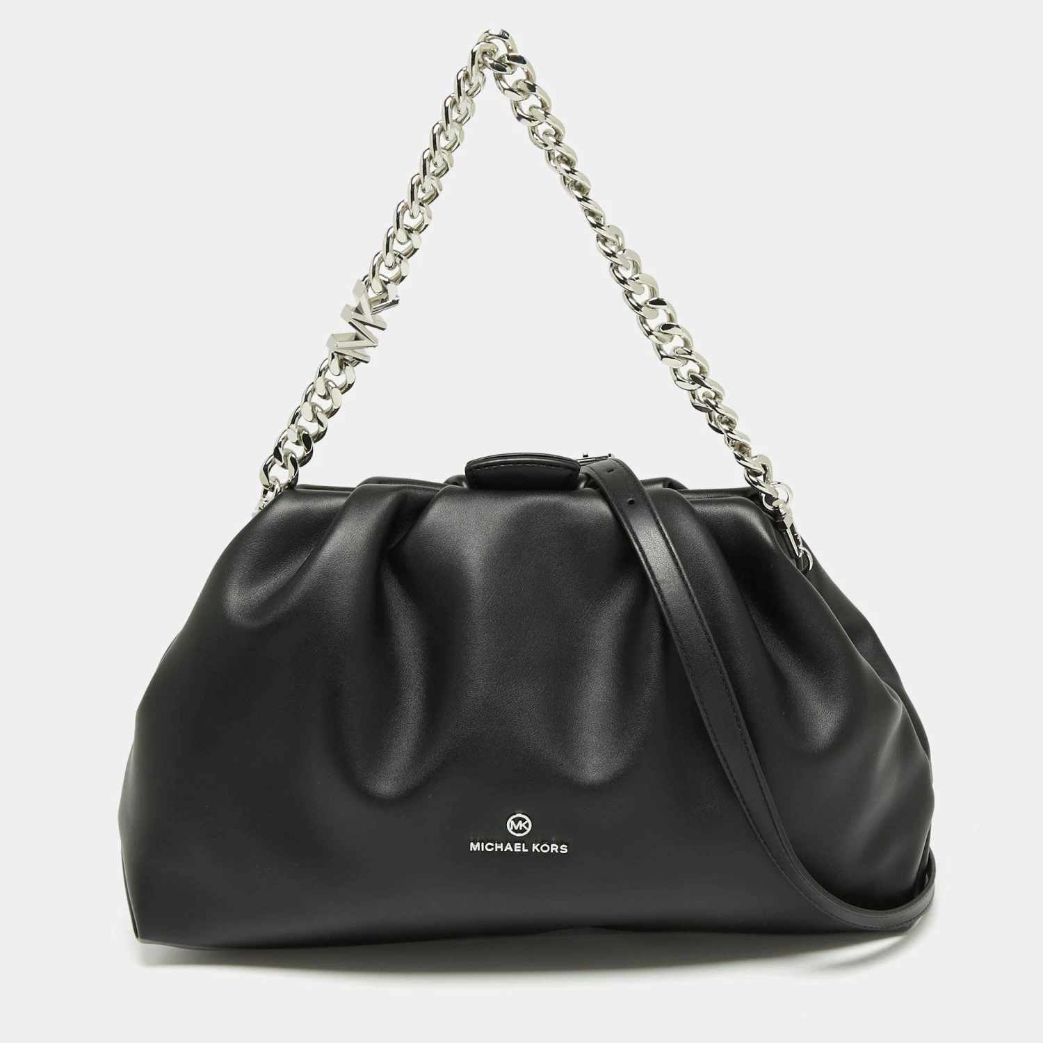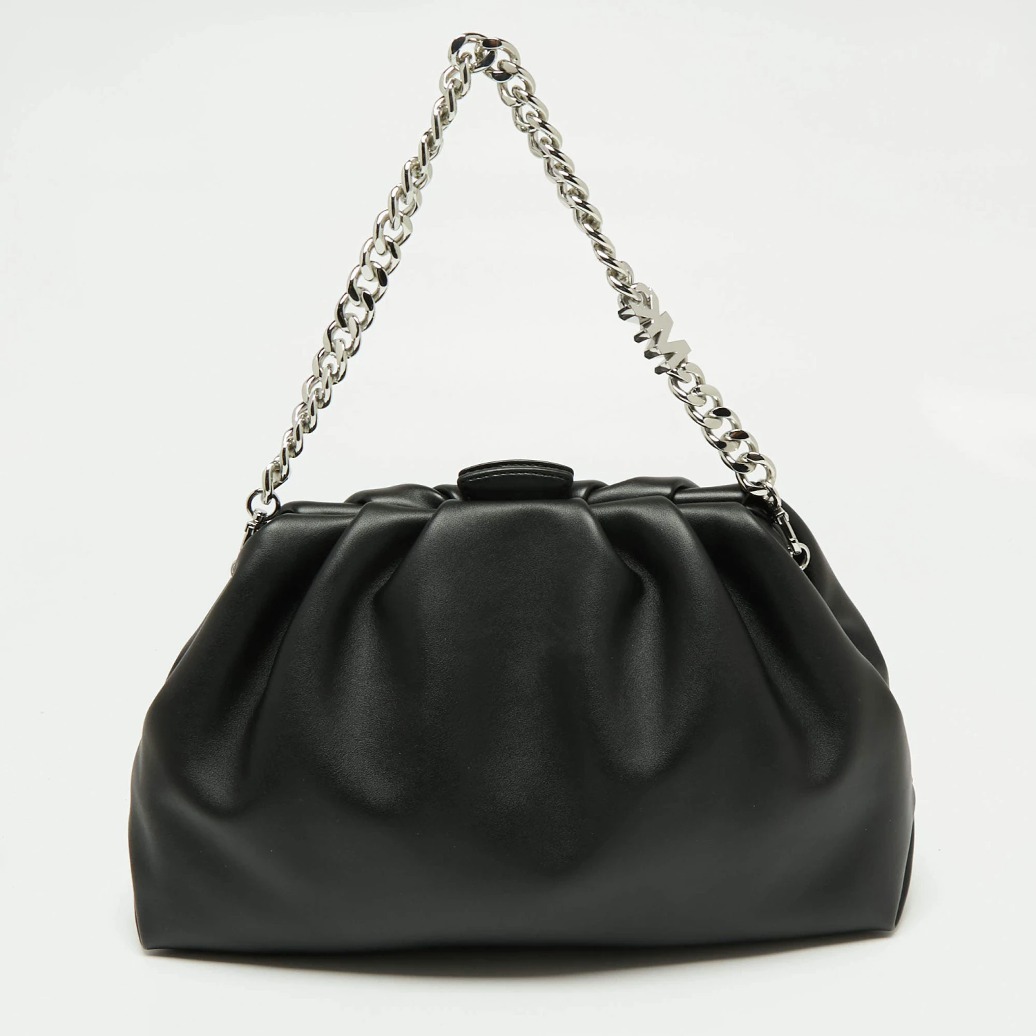 Michael Kors’ Nola clutch bag can be carried on the shoulder, in your hand, or tucked under your arm. This extra-large version is in black faux leather, complemented by silver-tone hardware.