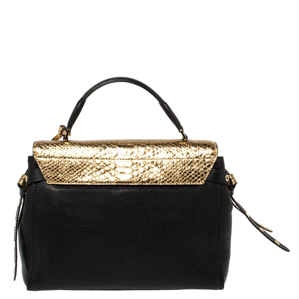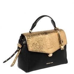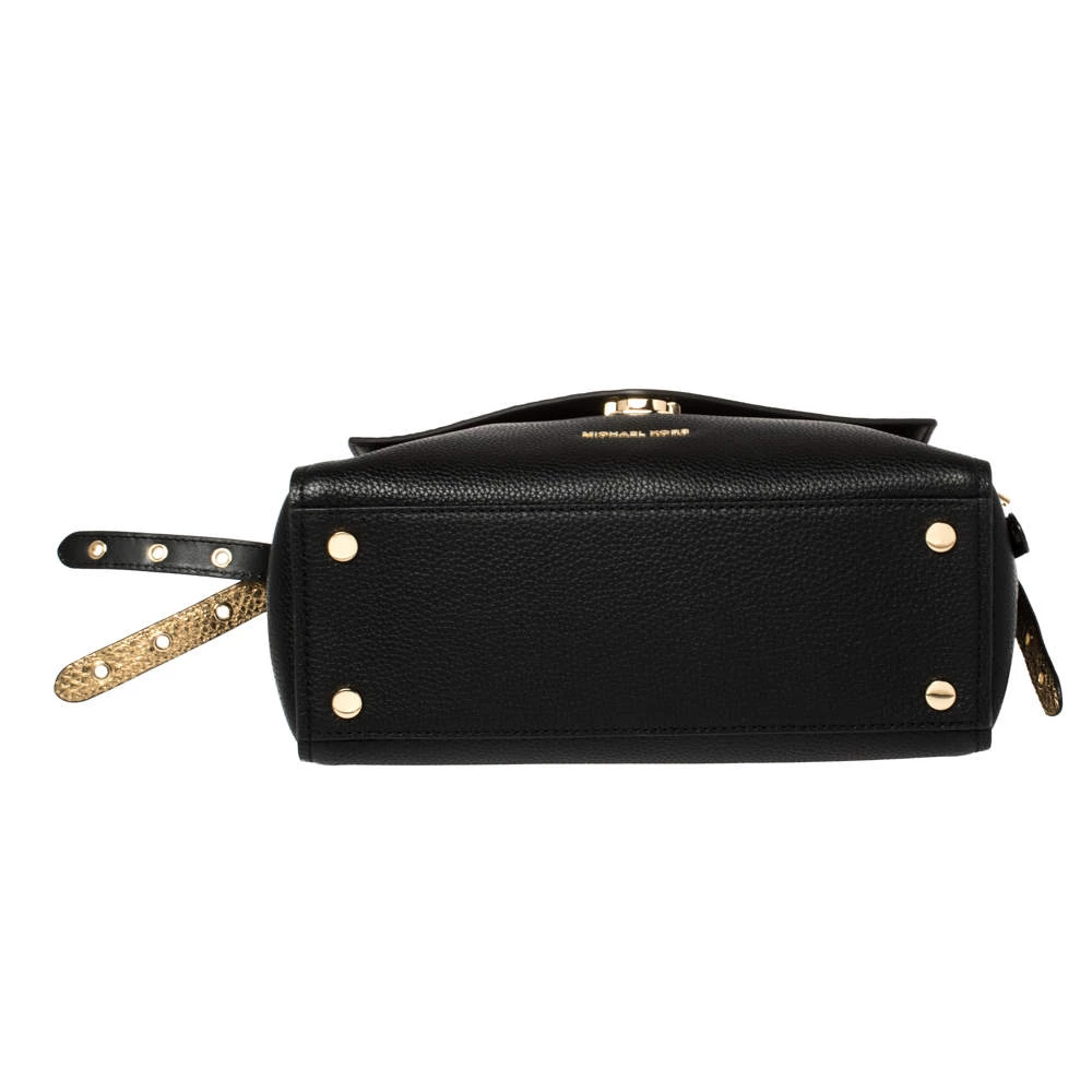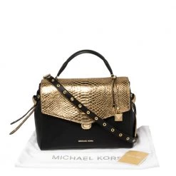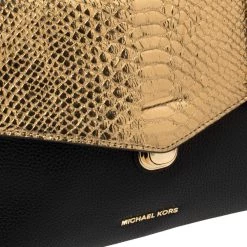 Timelessly elegant and stylish, Michael Kors collections capture the effortless, nonchalant finesse of the modern woman. Crafted from black leather into a sturdy silouette, the bag features a front flap made from snakeskin-embossed leather for a contrasting effect. The creation is finished off with a padlock, a top handle, and a shoulder strap. Match your accessories with the gold-tone hardware for an elegant appeal.