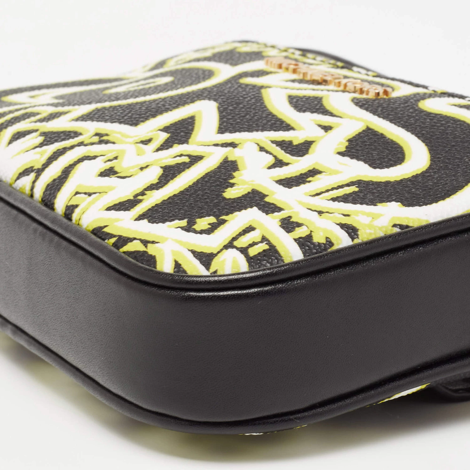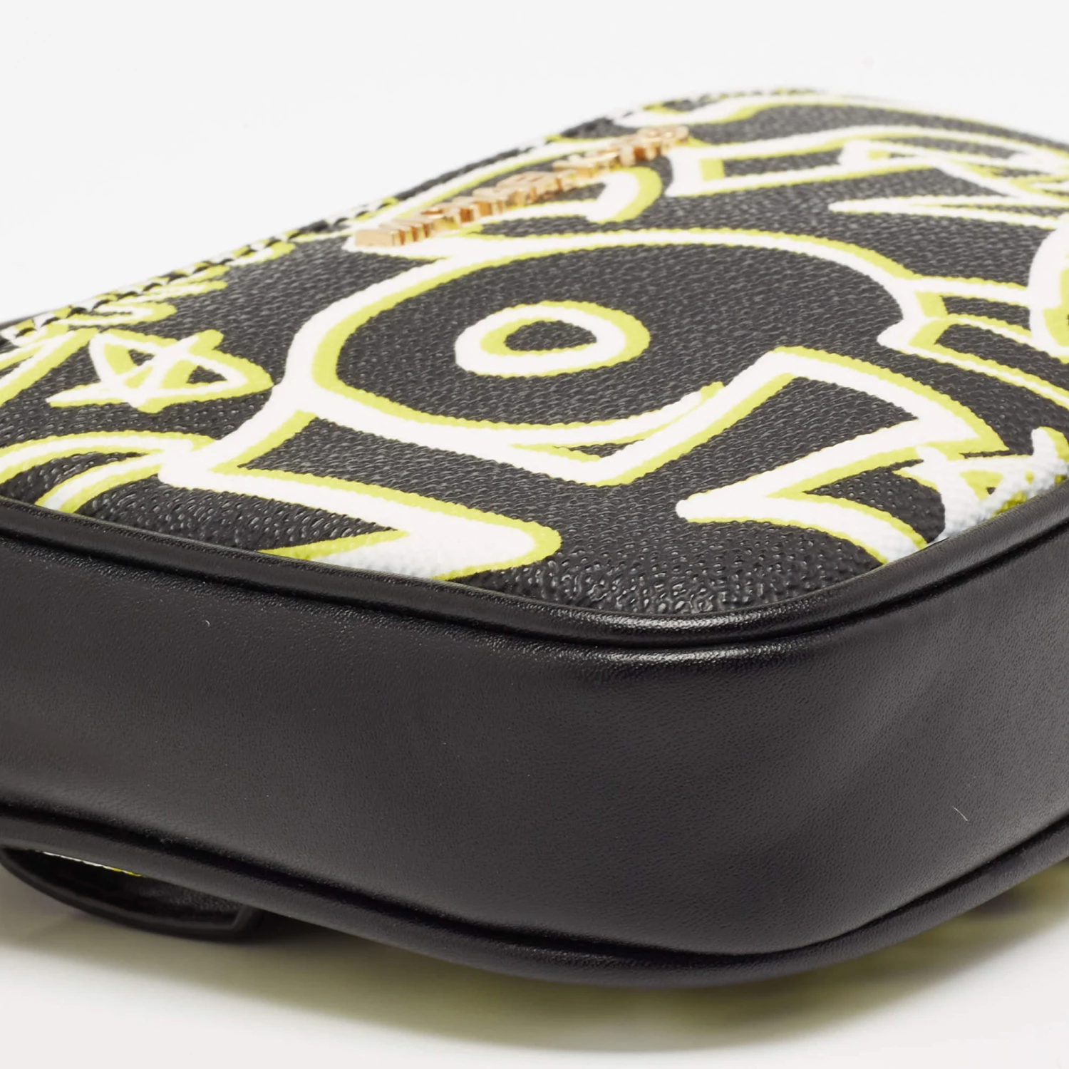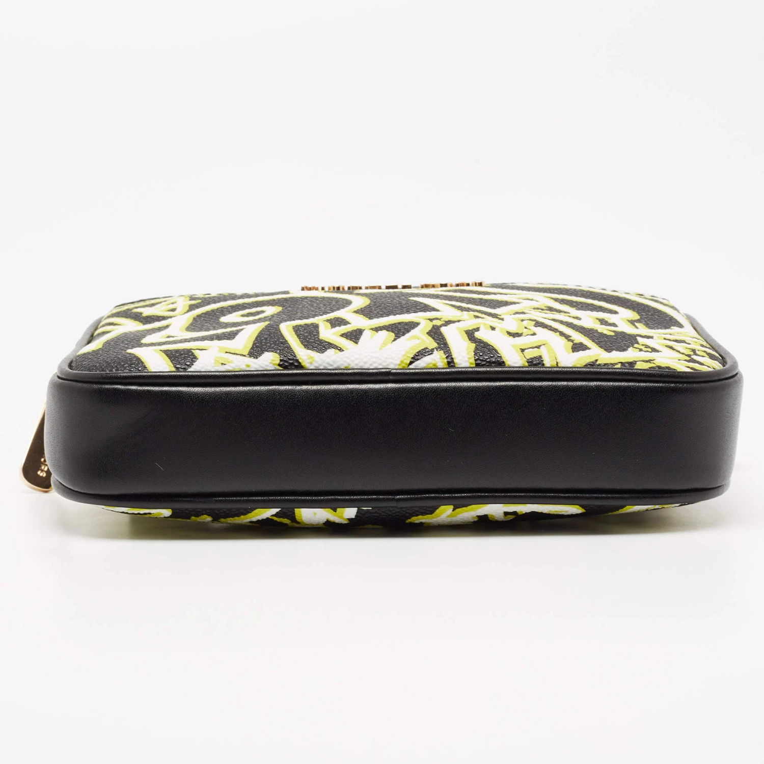 This Michael Kors clutch is made of graffiti-printed coated canvas and black leather. It has a zip-enclosed, compact interior and a wristlet strap. The quirky clutch is complete with gold-tone hardware.