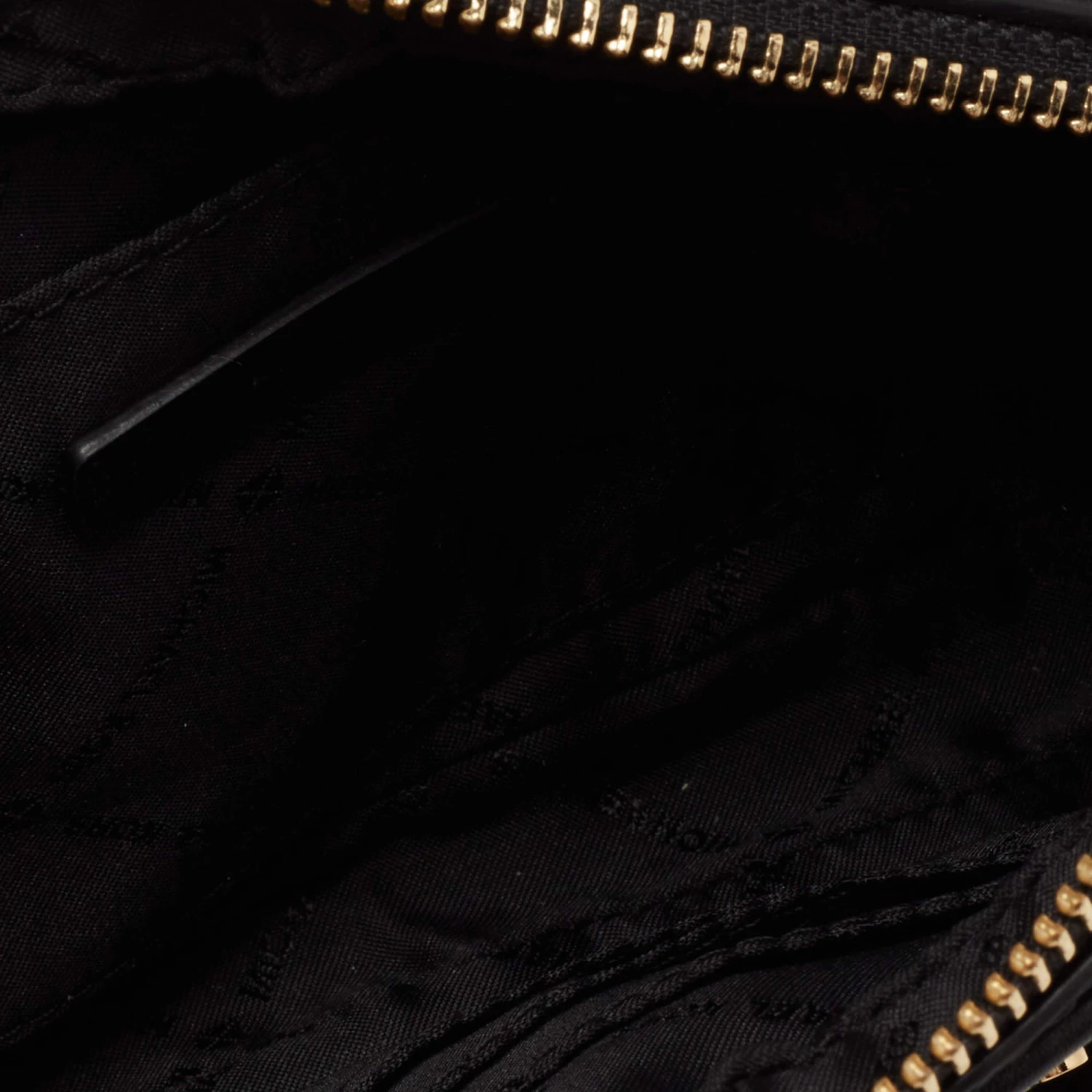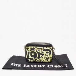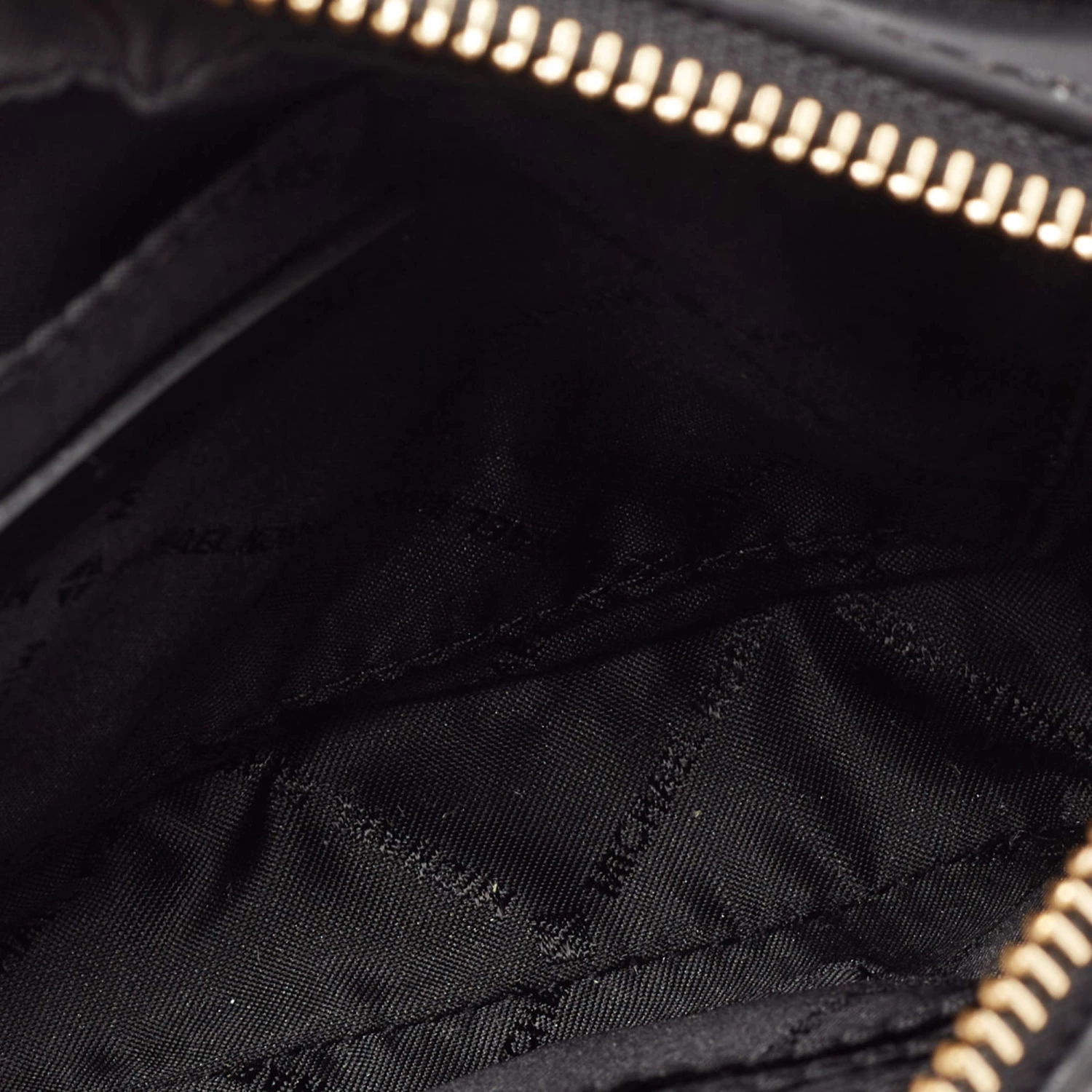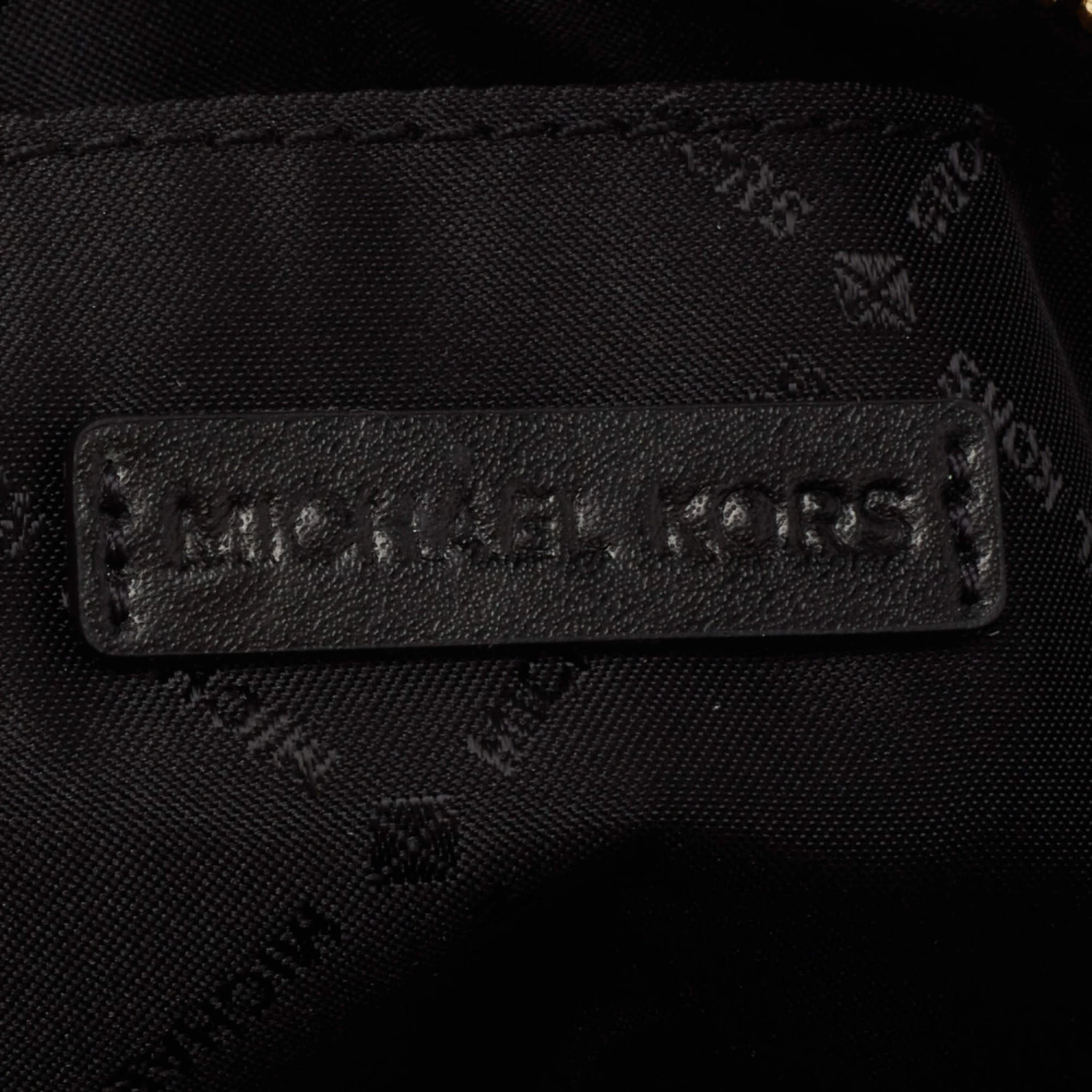This Michael Kors clutch is made of graffiti-printed coated canvas and black leather. It has a zip-enclosed, compact interior and a wristlet strap. The quirky clutch is complete with gold-tone hardware.