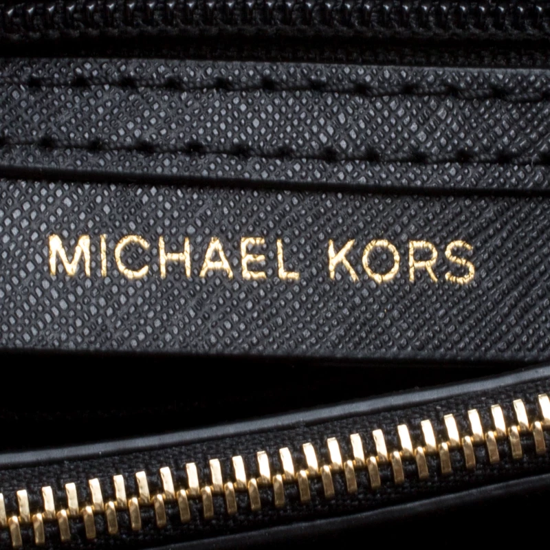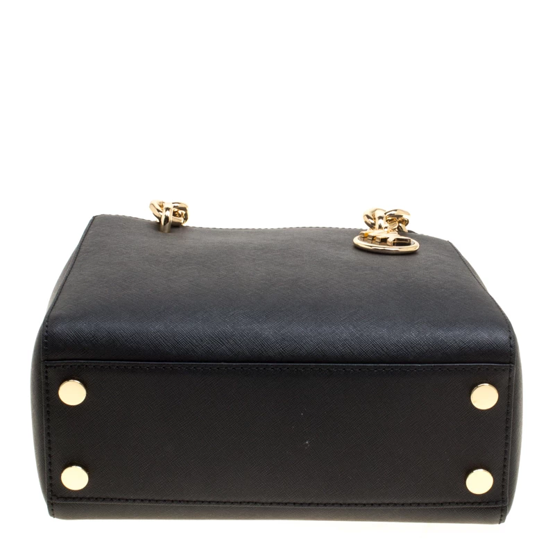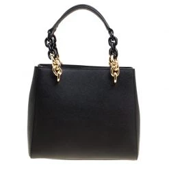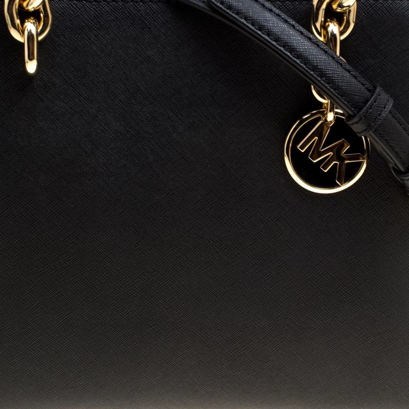 This Cynthia Satchel from the house of Michael Kors has been designed from a classic black leather body detailed with gold-tone accents. It comes fitted with two chunky chain top handles and an open top secured with a strap and snap button closure. The interior is divided into two compartments separated with a zipper pocket. Attach the shoulder strap for a cross-body look.
