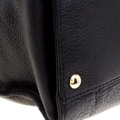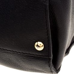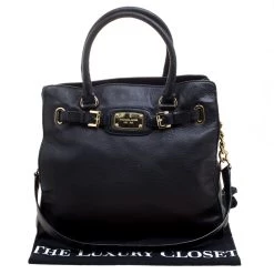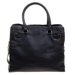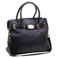 This Hamilton tote is from Michael Kors. It has been crafted from leather in a black shade and decorated with buckles and the brand plaque on the front. The bag has two handles, a shoulder strap, and a spacious fabric interior. This creation is ideal for everyday use.
