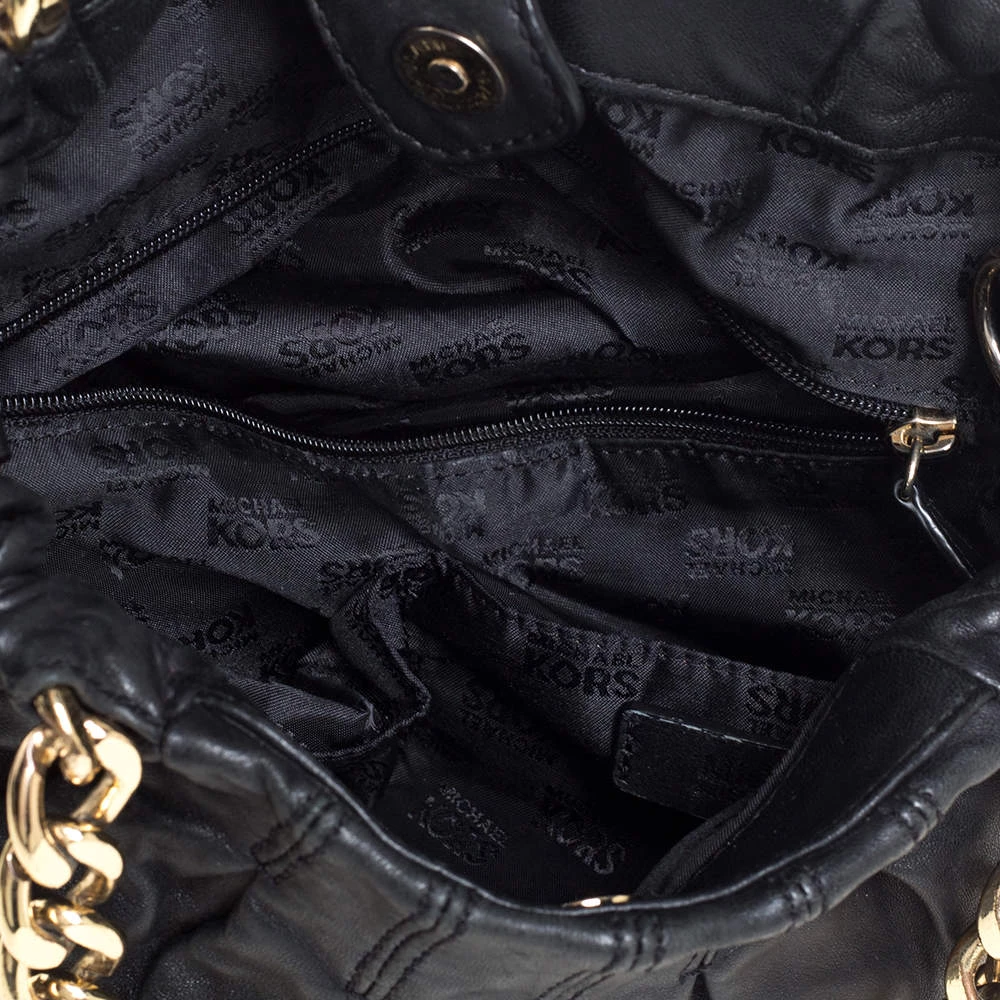 Designed with love, this Michael Kors hobo bag is crafted from black-hued leather. It comes with a fabric-lined interior that houses enough space essentials. The hobo features a shoulder strap and two handles.