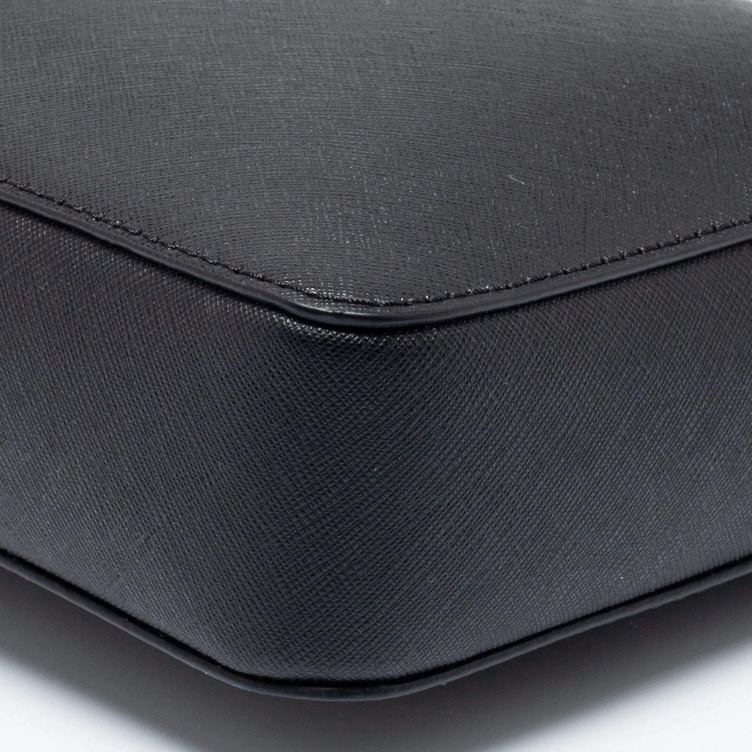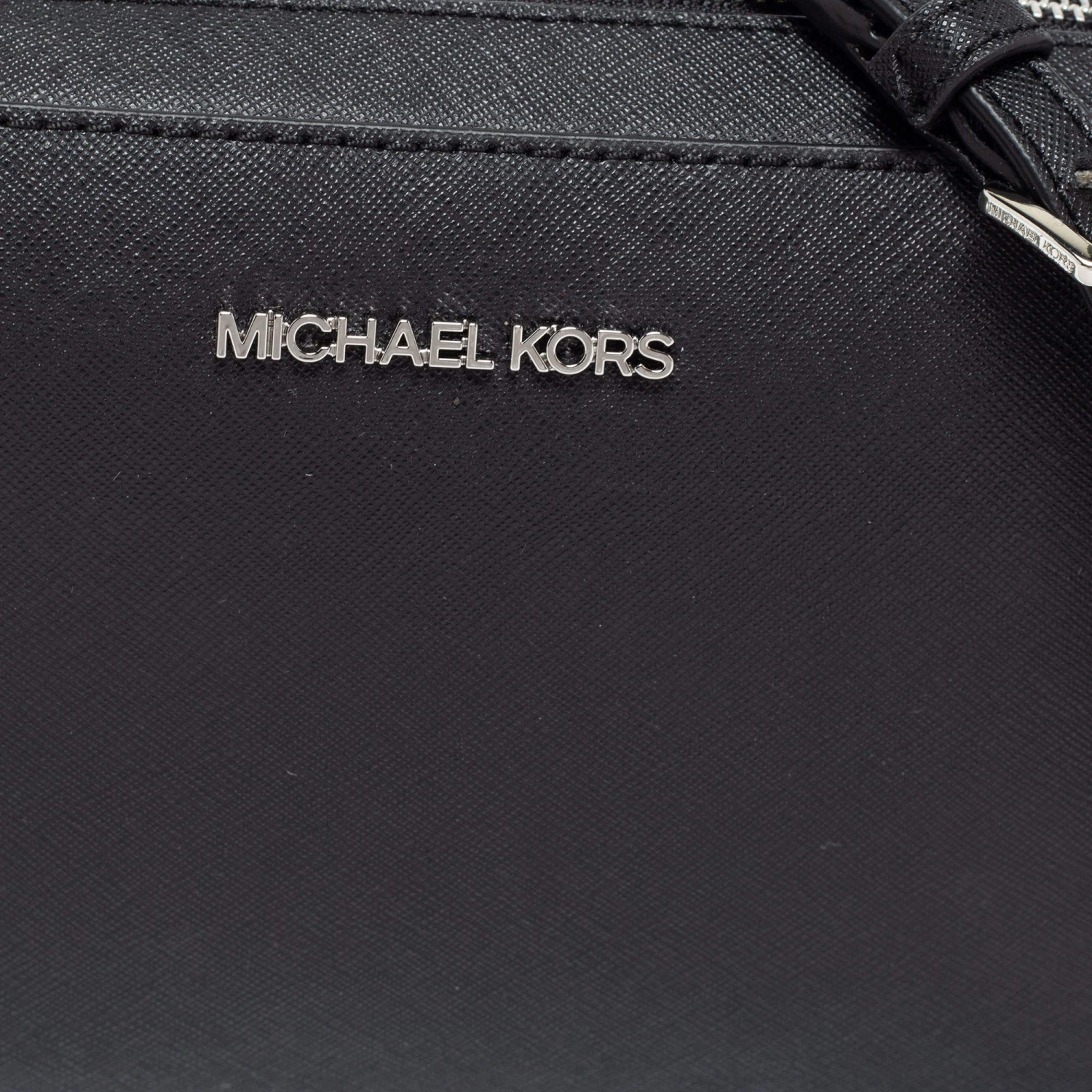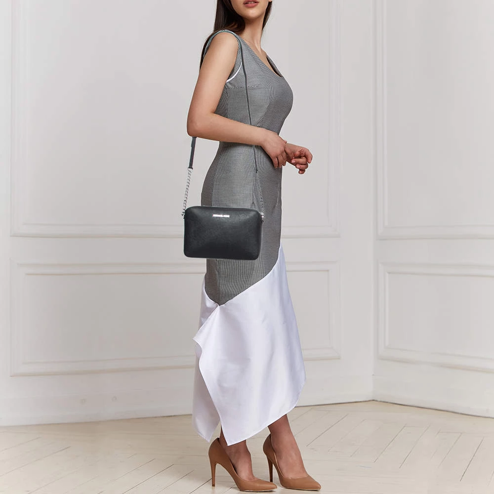 This Michael Kors Jet Set bag is a timeless piece to last you season after season. This bag is made of black leather and will suit all your needs. It has a black shade, logo detailing, a long shoulder strap, and a fabric-lined interior.