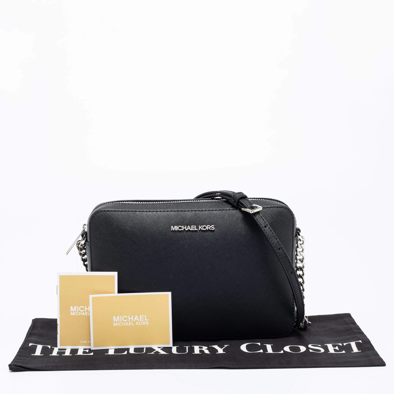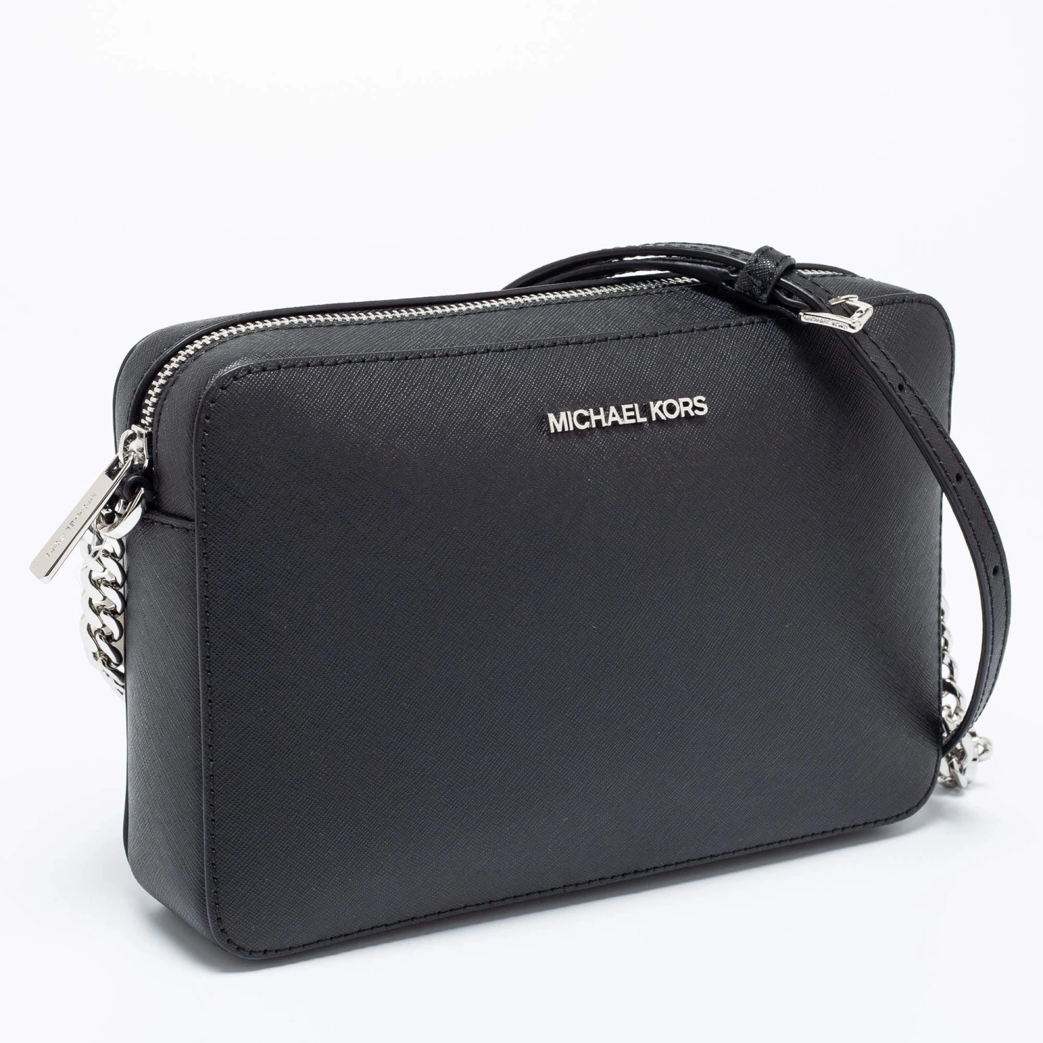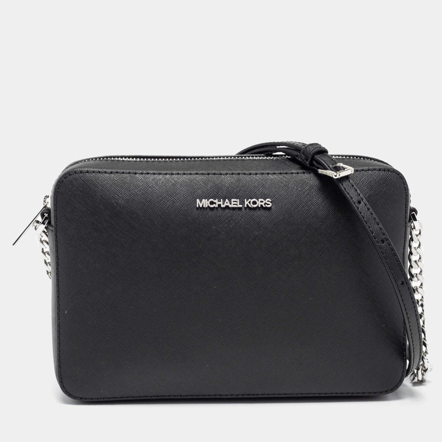 This Michael Kors Jet Set bag is a timeless piece to last you season after season. This bag is made of black leather and will suit all your needs. It has a black shade, logo detailing, a long shoulder strap, and a fabric-lined interior.