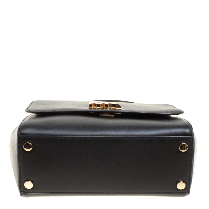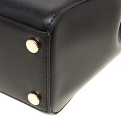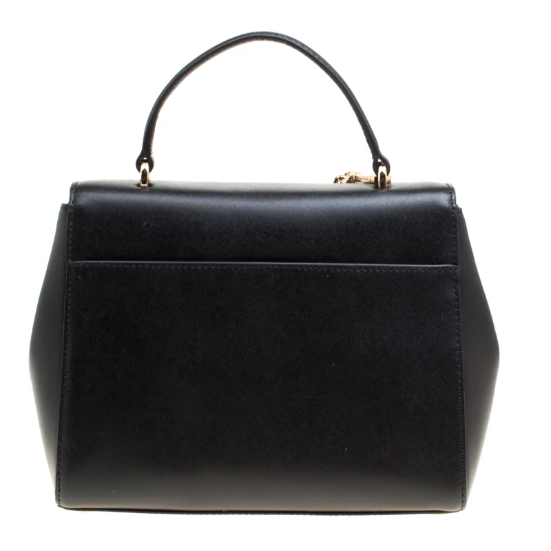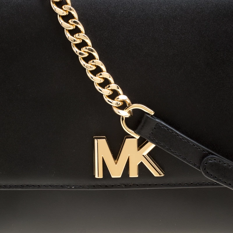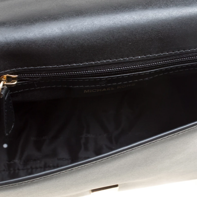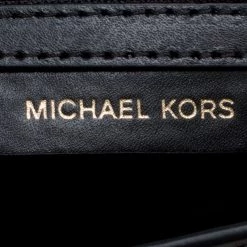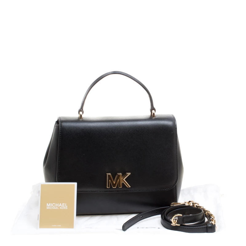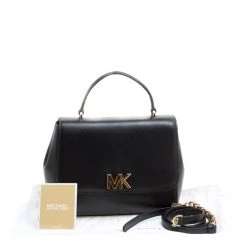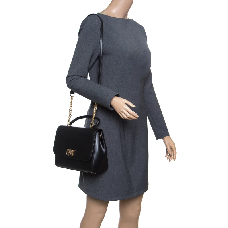 Characterized by a chic, feminine shape, this Michael Kors Top handle bag will be your go-to for any formal occasion. It has been crafted from a black leather body in a flap style with the MK lettering on it. It opens to a fabric lined interior with a zipper wall pocket to secure little essentials. Attach the shoulder strap to go cross-body for days when you are busy running errands.