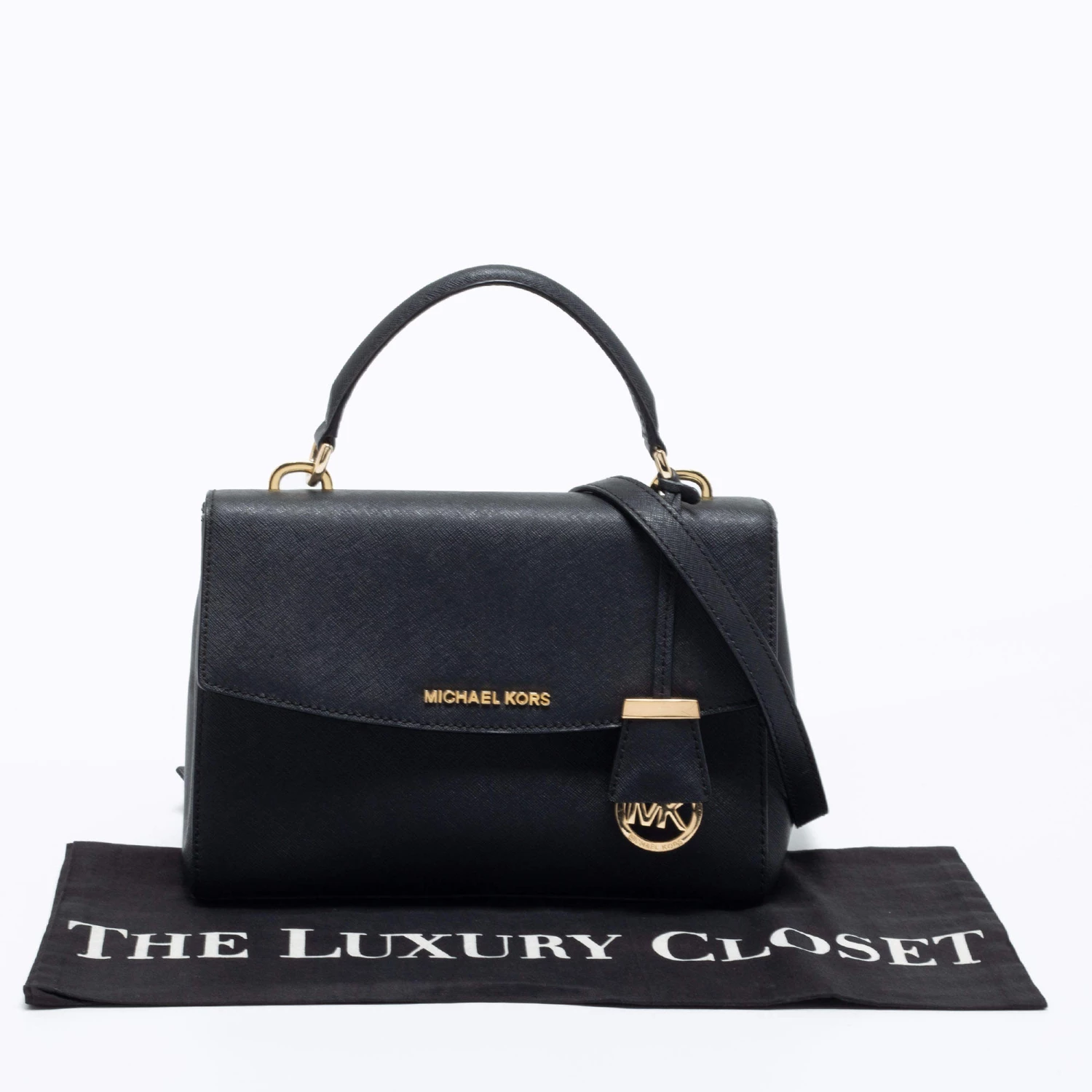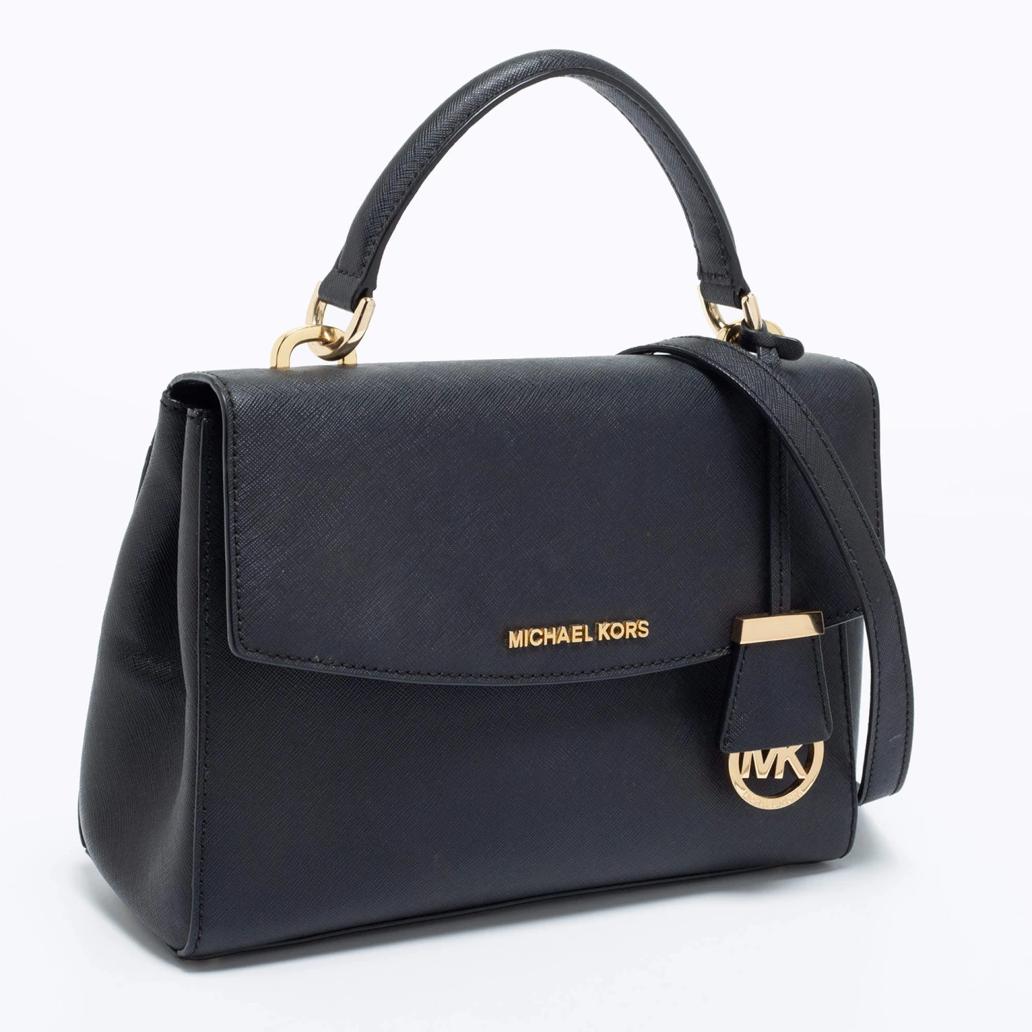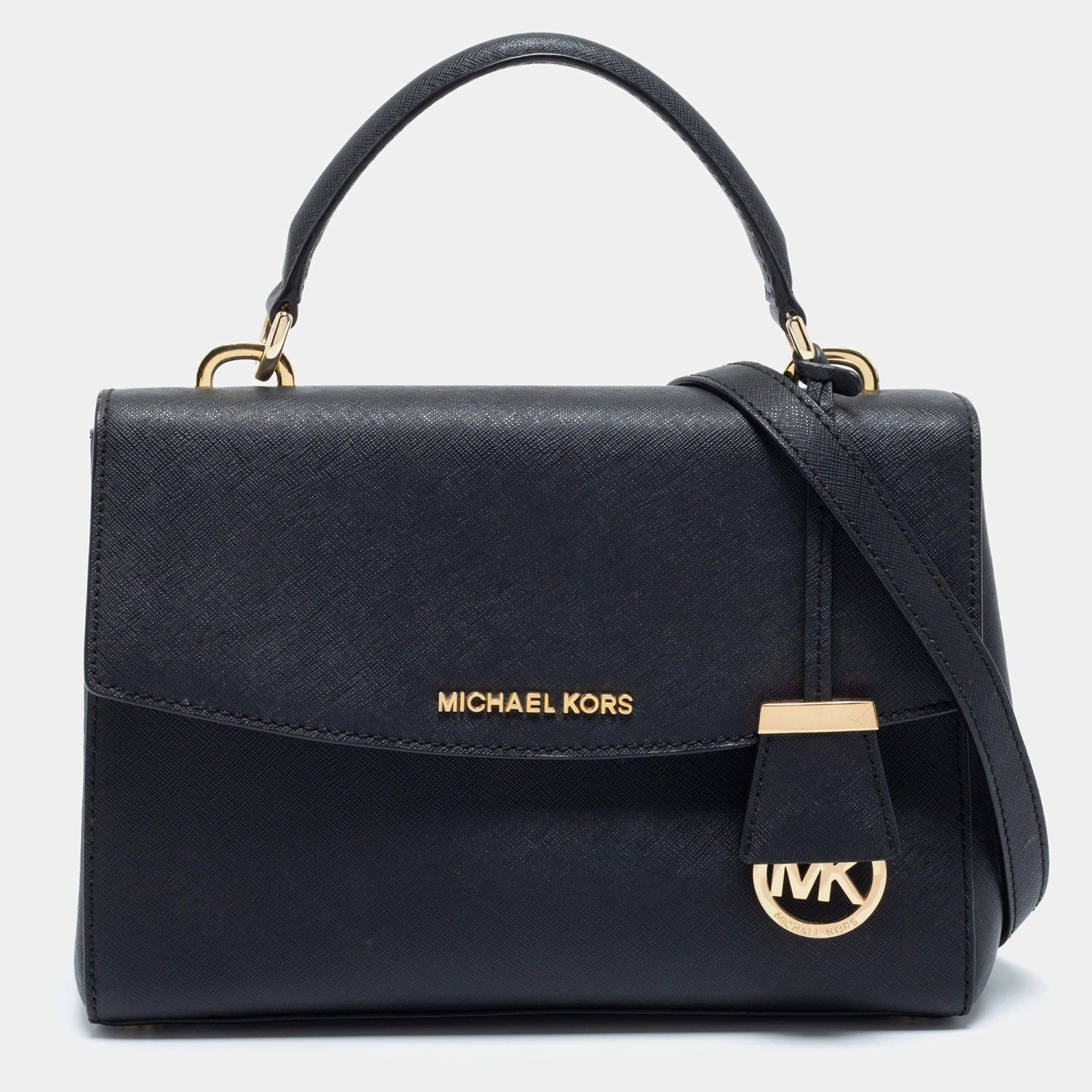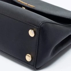 This black bag comes from the fashion house of Michael Kors. Crafted from black leather, it has a fabric interior that ensures to house your everyday essentials effortlessly. The MK Ava top handle bag is complete with the brand name on the front.