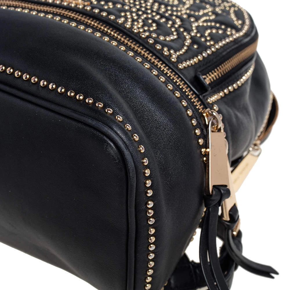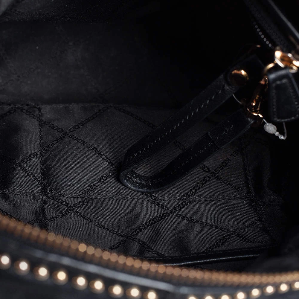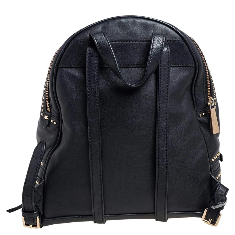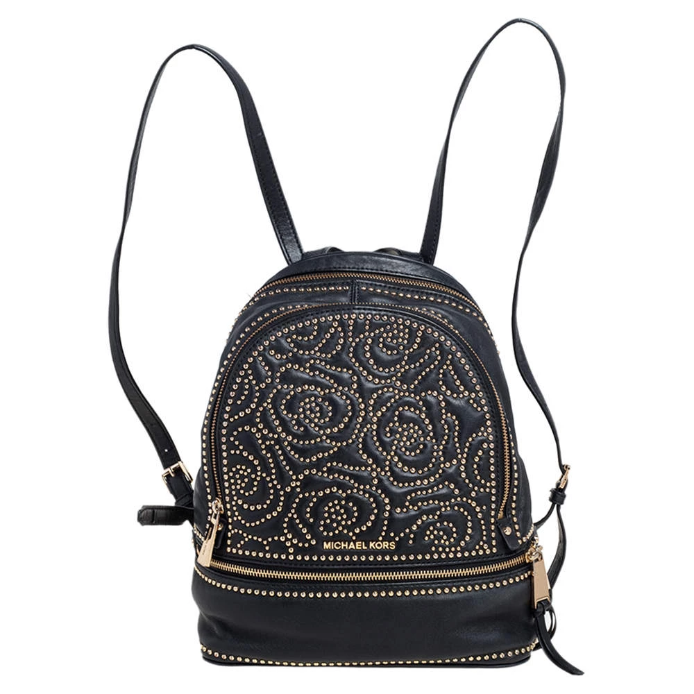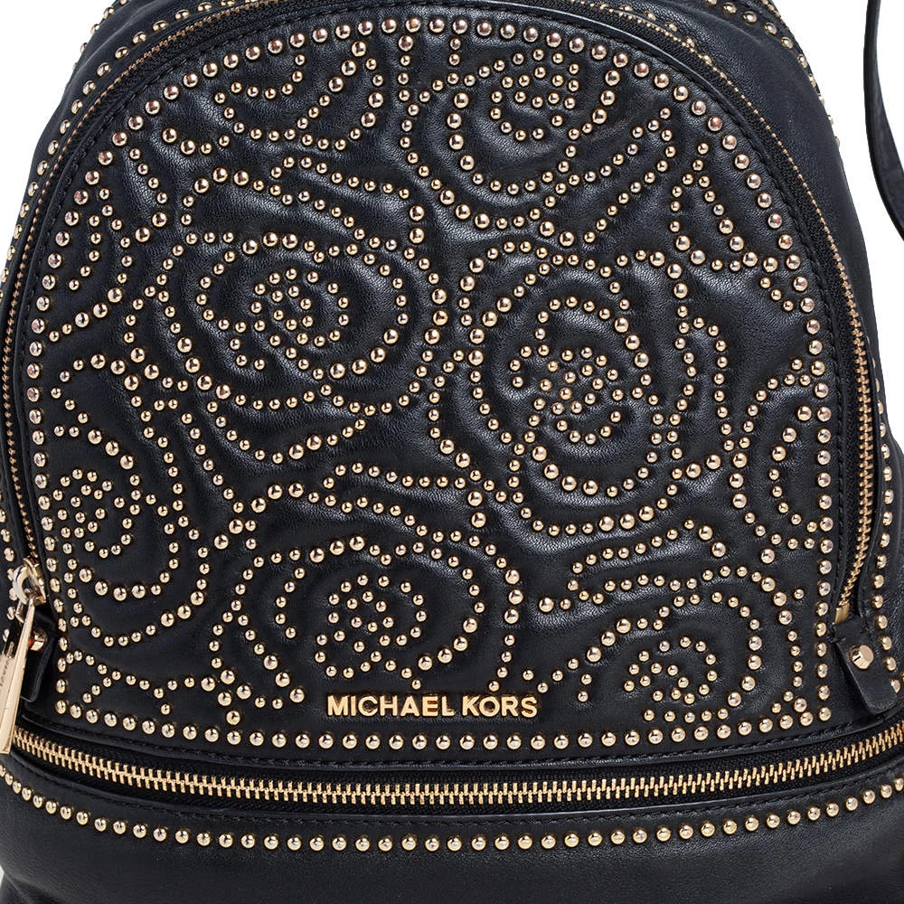 Get set for an uber stylish look with this black Rhea backpack from Michael Kors. It has been crafted from leather and detailed with zippers and studs. The designer backpack for women is equipped with a top handle, adjustable shoulder straps, and fabric compartments.