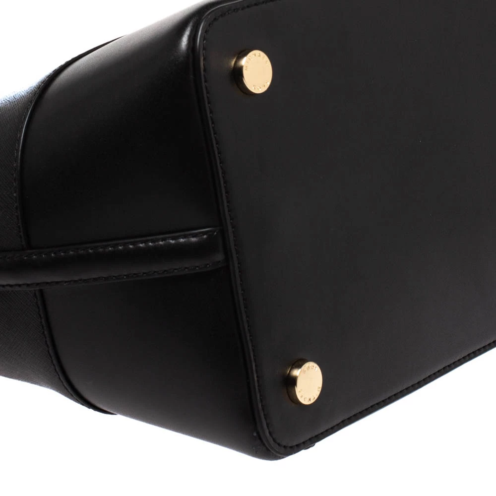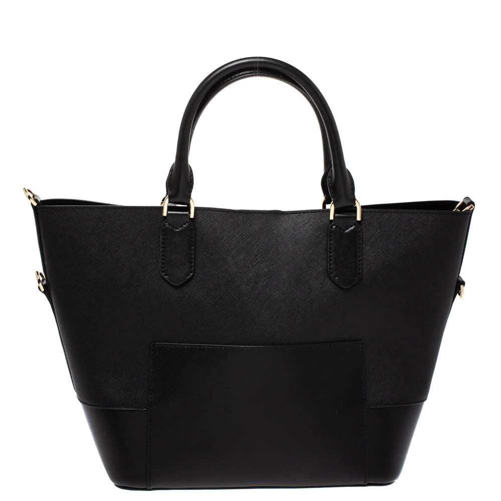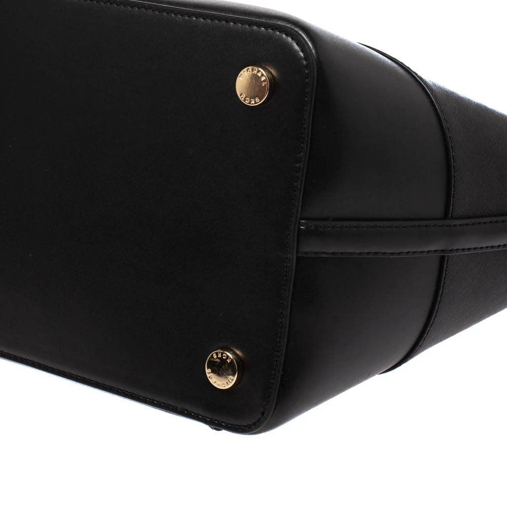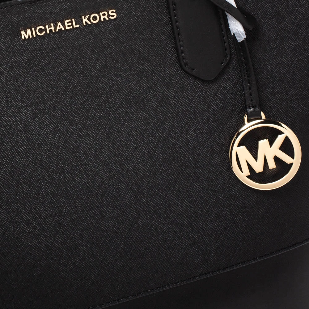 Exhibiting an up-to-date design, this bag from the house of Michael Kors will be an instant hit. Crafted from black leather, this Trista hobo features a MK charm and dual handles. It comes with a slip pocket at the back and a leather lined interior.