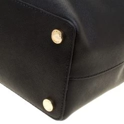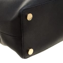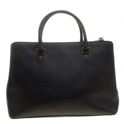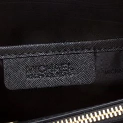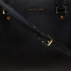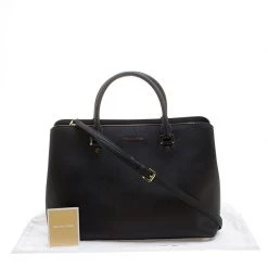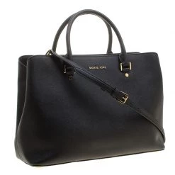 The Savannah satchel from Michael Kors is made with modern aesthetics on fine lines into a structured shape that speaks durability. It is crafted with black leather and gold-tone hardware. Equipped with two top handles and a detachable shoulder strap, this bag comes with variety in carrying options. The fabric lined interior houses two compartments divided by a zip pocket.