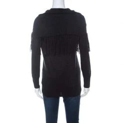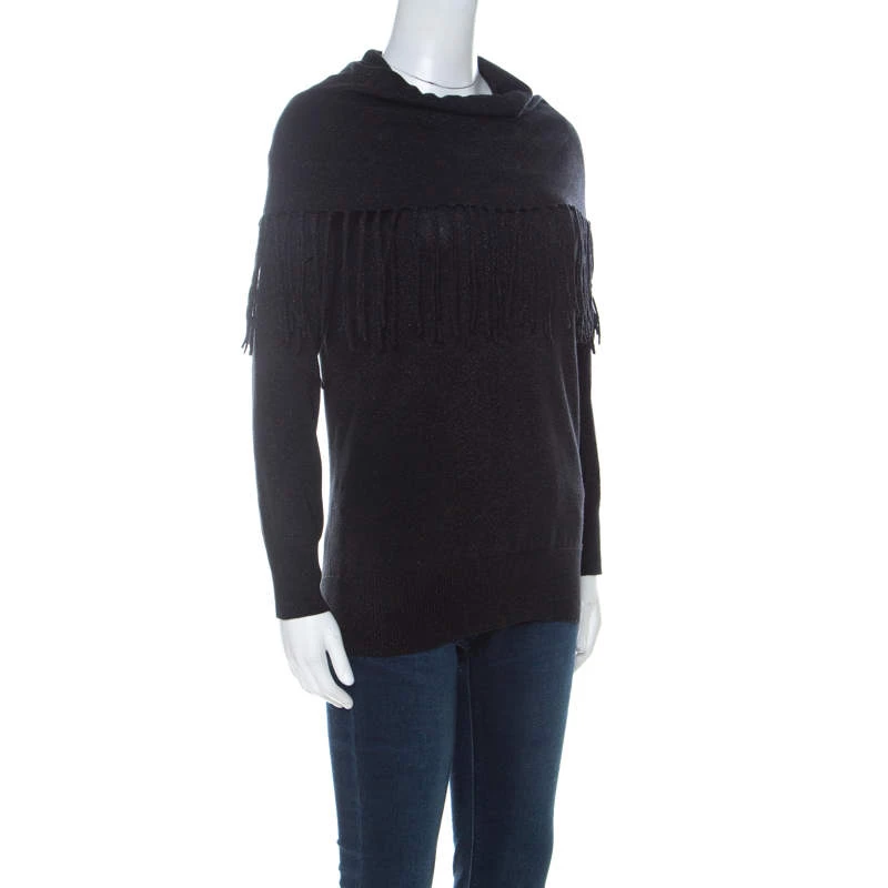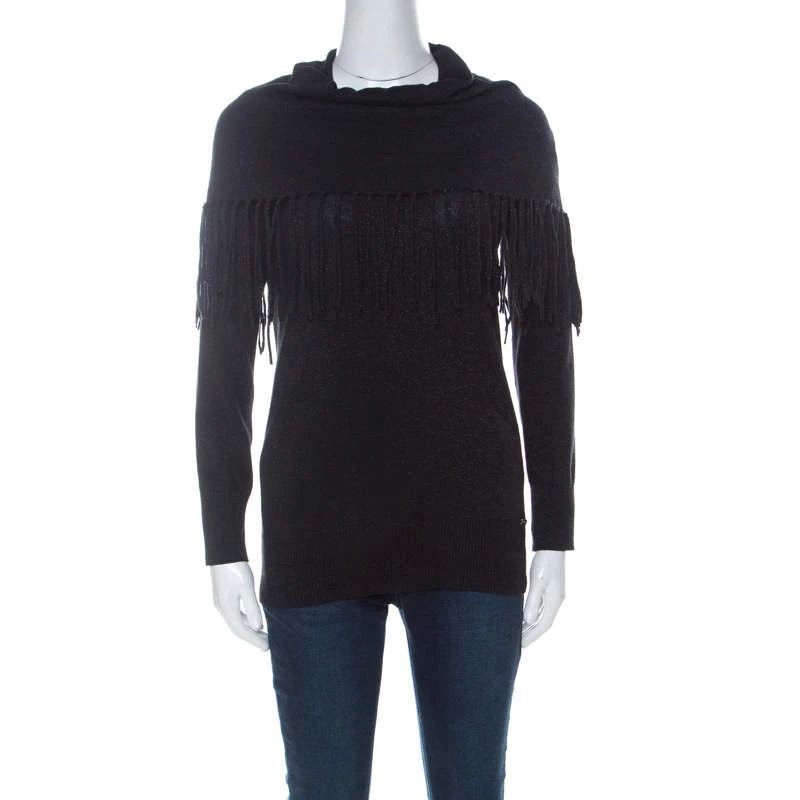 This trendy sweater by Michael Kors has been crafted in keeping with the latest trends. This black piece would make you the centre of attraction of any occasion. It flaunts a cowl neckline with long sleeves and fringe details on the bodice area. Team it with a pleated skirt and boots for a high-fashion look.