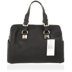 An elegantly structured tote from Michael Kors is meant for the chic women of today. Crafted from Saffiano leather, this bag features an MK charm falling on the front, magnetic snap-tab closure on the sides, protective metal feet, top zip closure, detachable shoulder strap, adjustable leather handles and bold pyramid motifs placed on leather trim. The spacious interior houses a zip pocket. Original Retail Price: USD $355