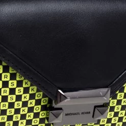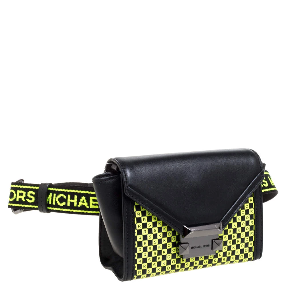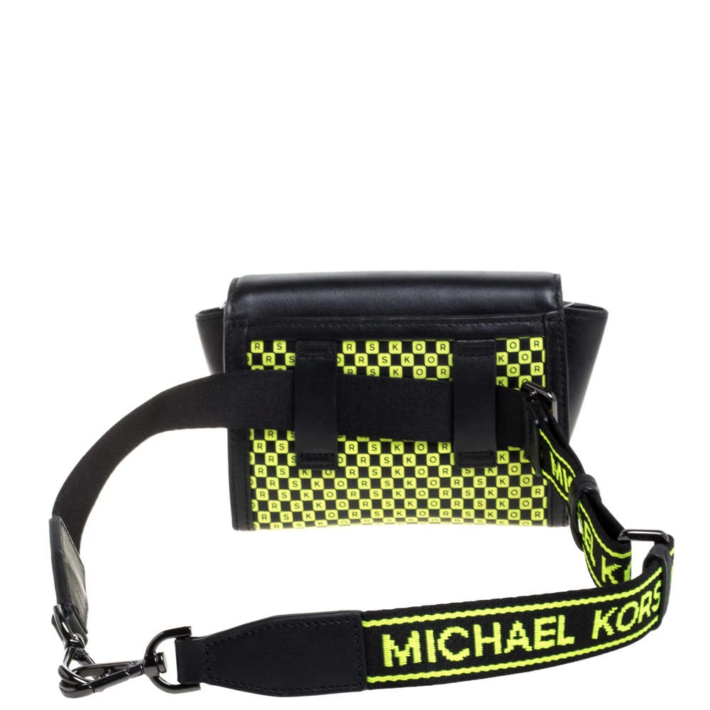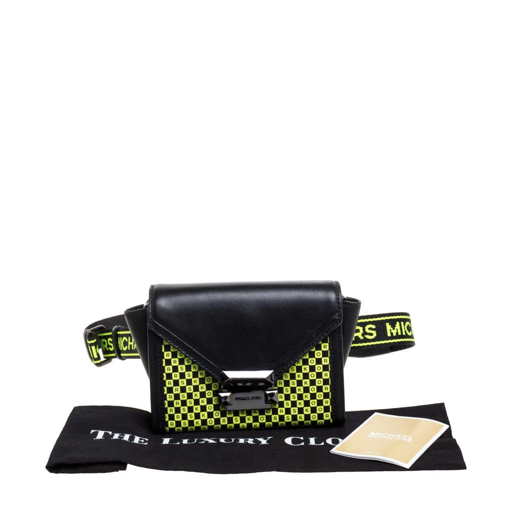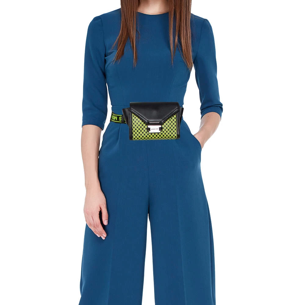 Designed to perfection and crafted from fine quality leather, this belt bag can be your go-to accessory. Bringing elegance and class to your daily style, this Whitney bag from Michael Kors is adorned with a neon green checkerboard pattern all over the black exterior. It has a front flap that opens to a nylon-lined interior and it is finished with a waist belt.