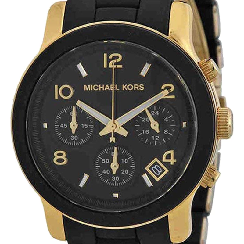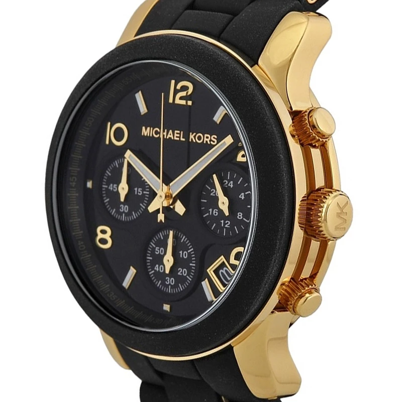 Designed in black PVC bracelet and accented with yellow gold plated steel details, this stunning and eye catching Michael Kors Runway watch is perfect for those casual occasions. The stunning black dial on this watch features three sub dials and gold and luminescent hour indexes for a distinct look.