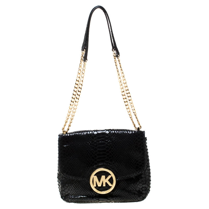 From Michael Kors comes this Fulton crossbody bag that looks ready to assist your great style. It comes crafted from python-embossed leather and designed with shoulder chains, nylon compartments and the MK logo on the front.