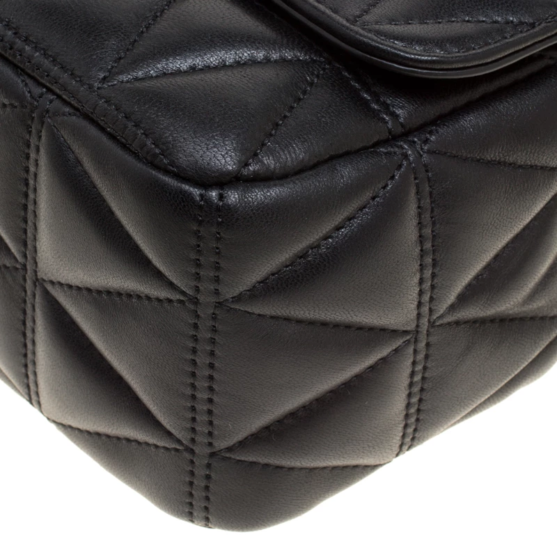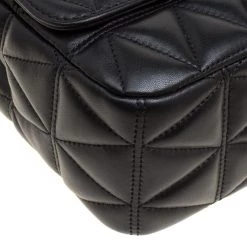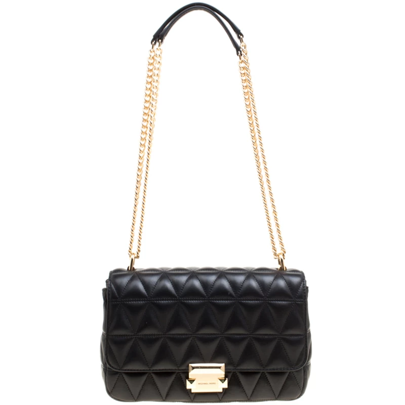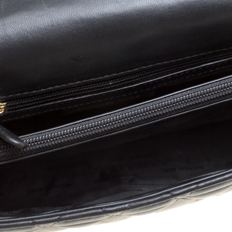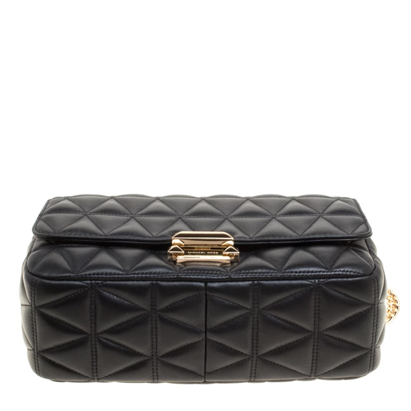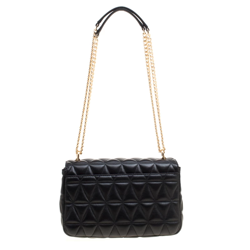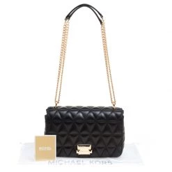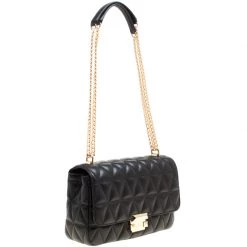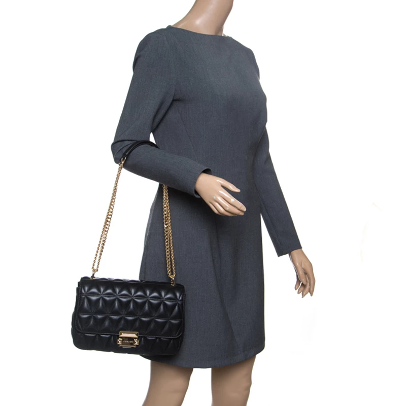 This versatile Michael Kors bag has been shaped from a classic black leather body detailed with an ever-stylish quilting pattern on it. The flap style bag is secured with a gold-tone, brand etched lock and comes fitted with a chain shoulder strap. This bag is ideally sized to hold your evening essentials- think of cell phone, lipstick for touch-up, cards, keys and currency. Style with a pantsuit for a glorious evening look.