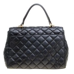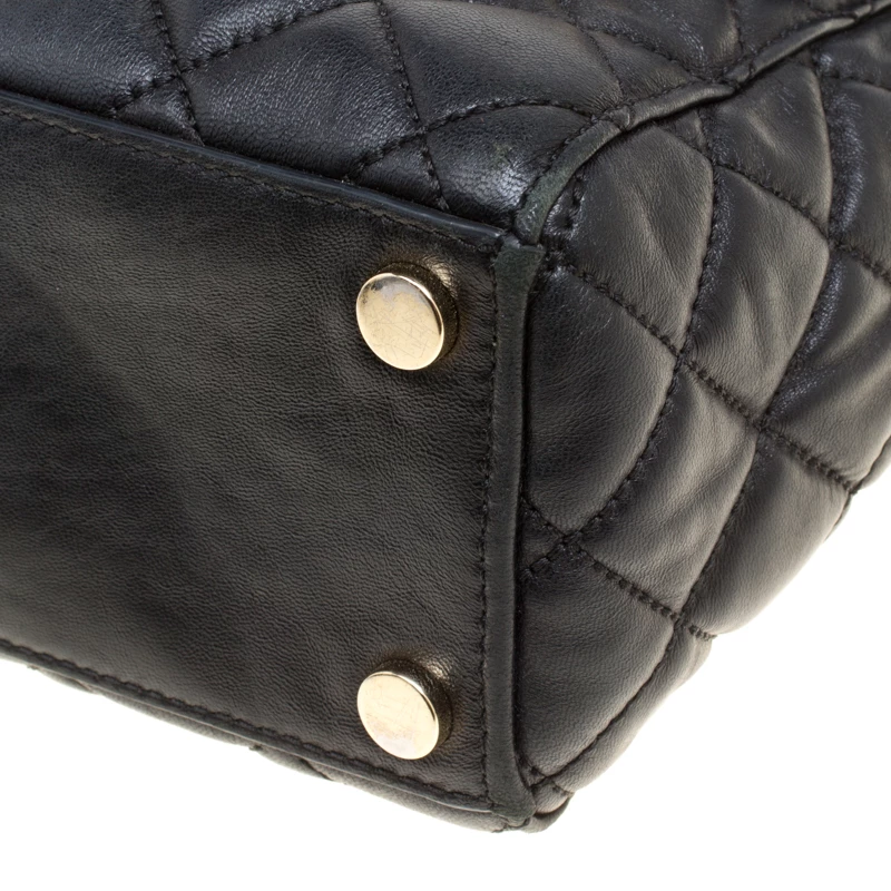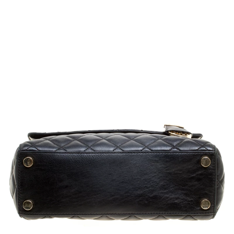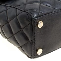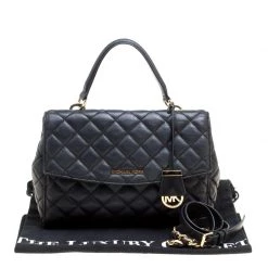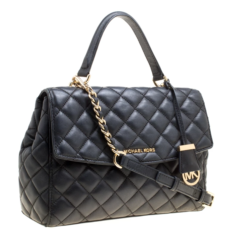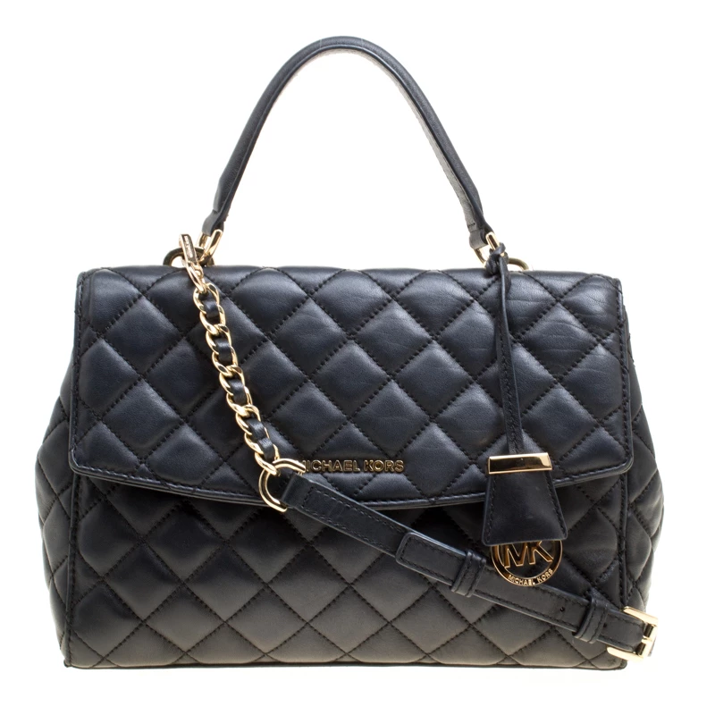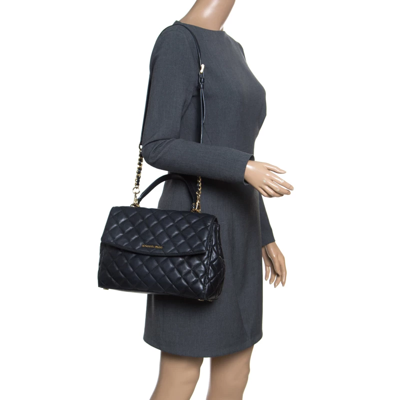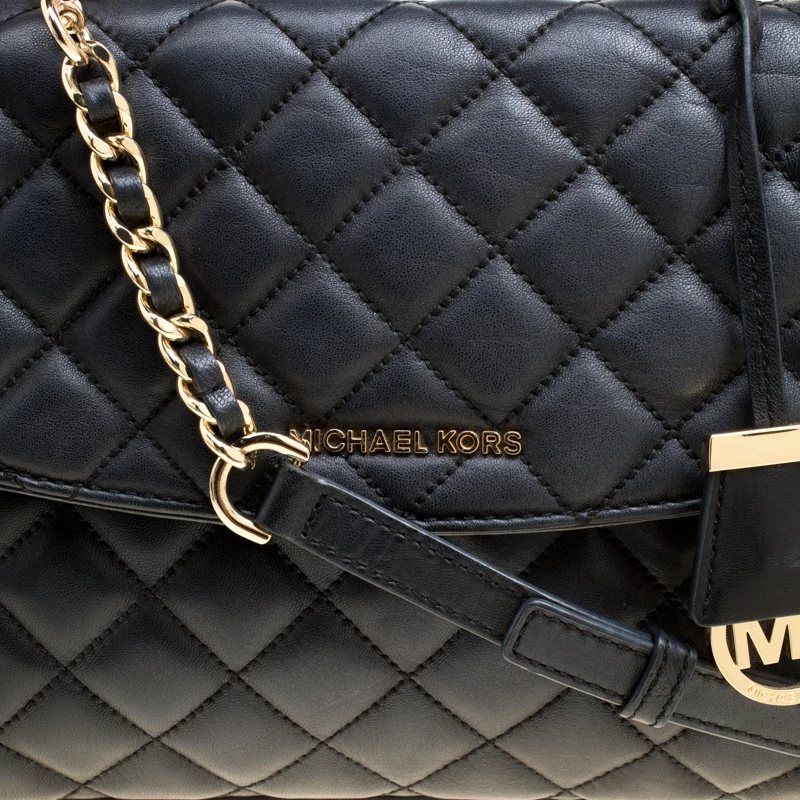 Known for making sleek and sophisticated designs, this Michael Kors Ava satchel comes crafted from leather in a black colour with a quilted pattern. It features a top handle, an adjustable shoulder strap, protective metal feet and a logo charm. The interior is fabric lined and equipped with a slip and a zip pocket.