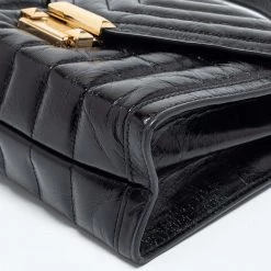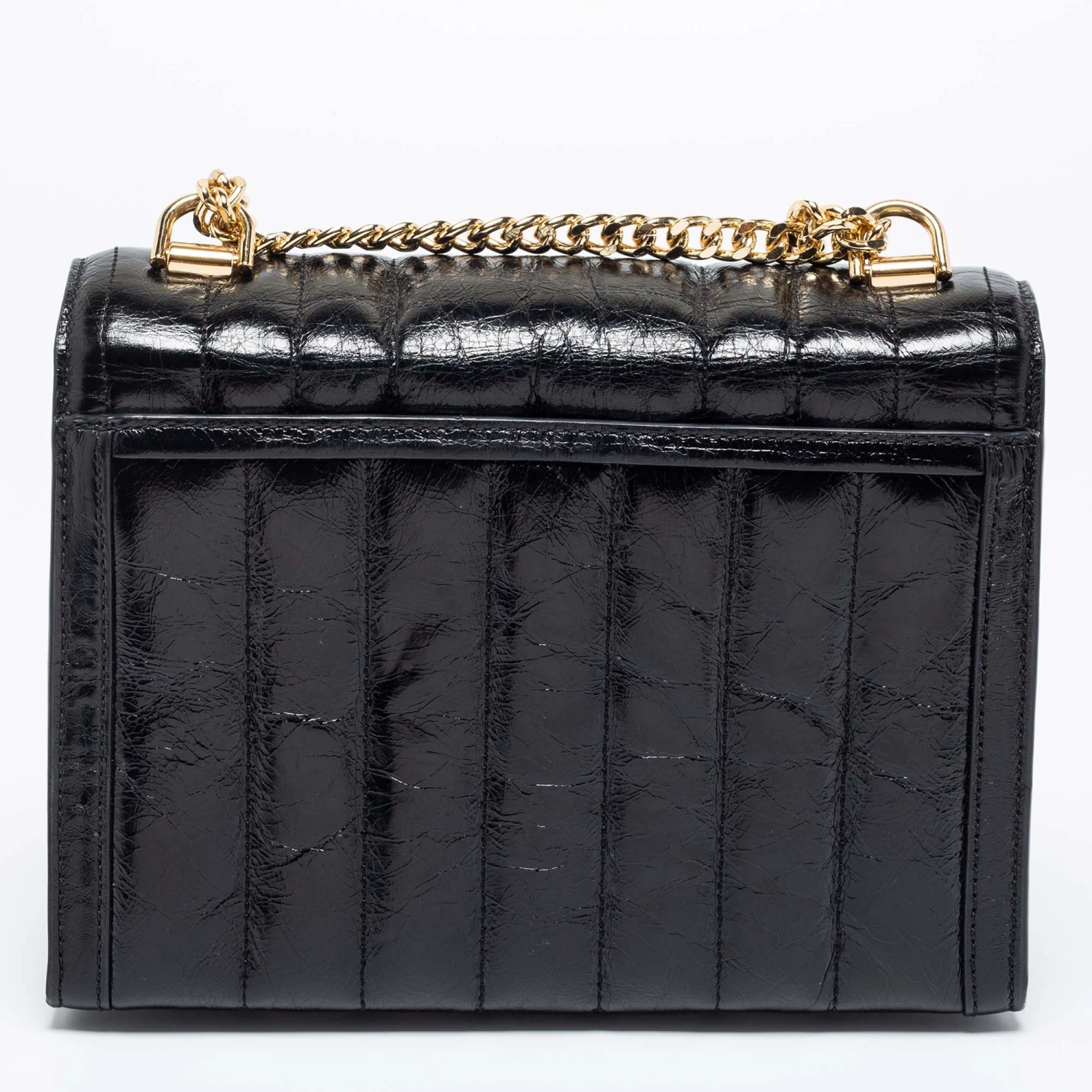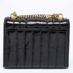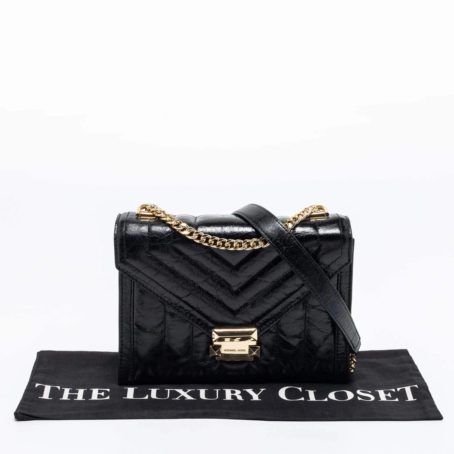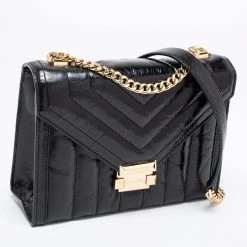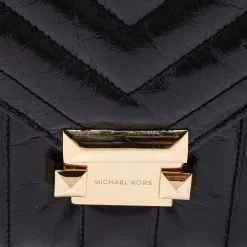 Beautified with gold-tone accents and a structured silhouette, this Michael Kors Whitney bag is an ideal option for your next party outing. It comes crafted from quilted leather and exhibits the brand signature on the front, a chain-leather shoulder strap, and a nylon-lined interior.