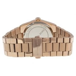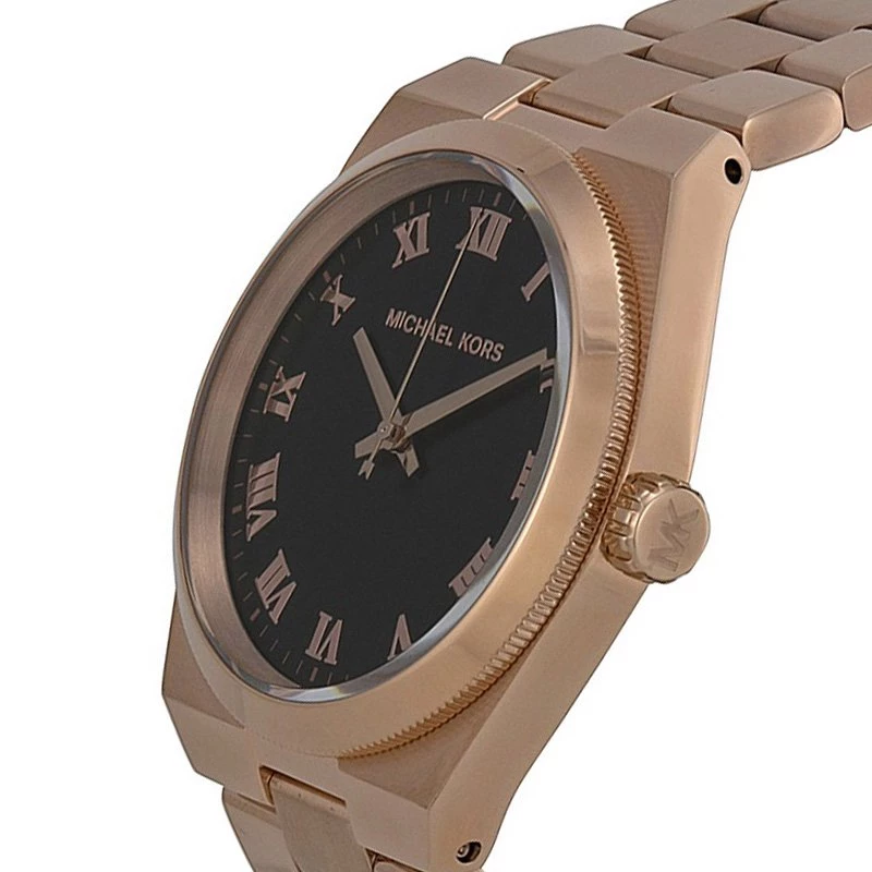 From the Channing collection by Michael Kors, this piece is inspired by men’s watches, as is evident in its design. With its Rose Gold-Plated Stainless Steel casing, black dial with rose gold-tone Roman numerals, three hands and logo this watch will update your look. It is water resistant up to 100M and the Rose Gold-Plated Stainless Steel bracelet features a push button deployment clasp.