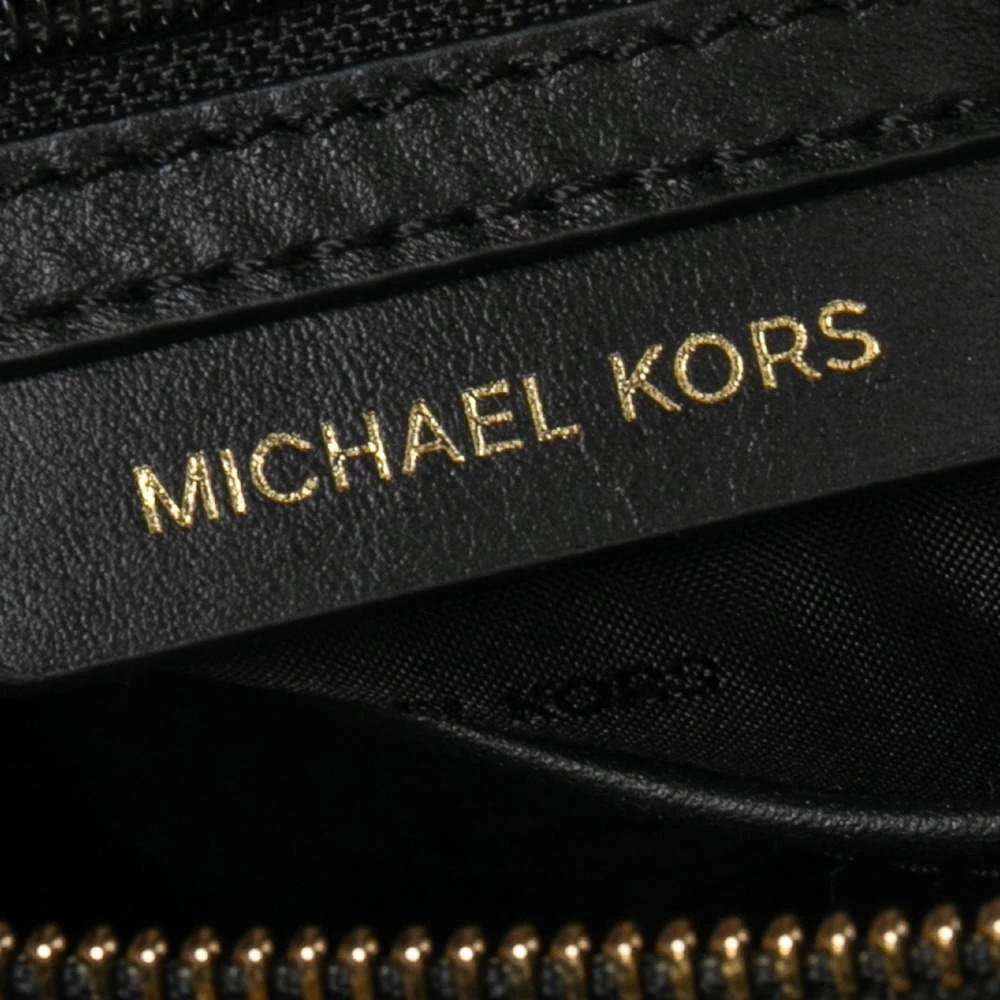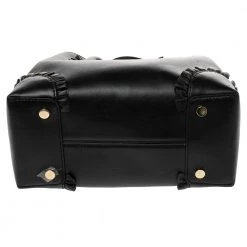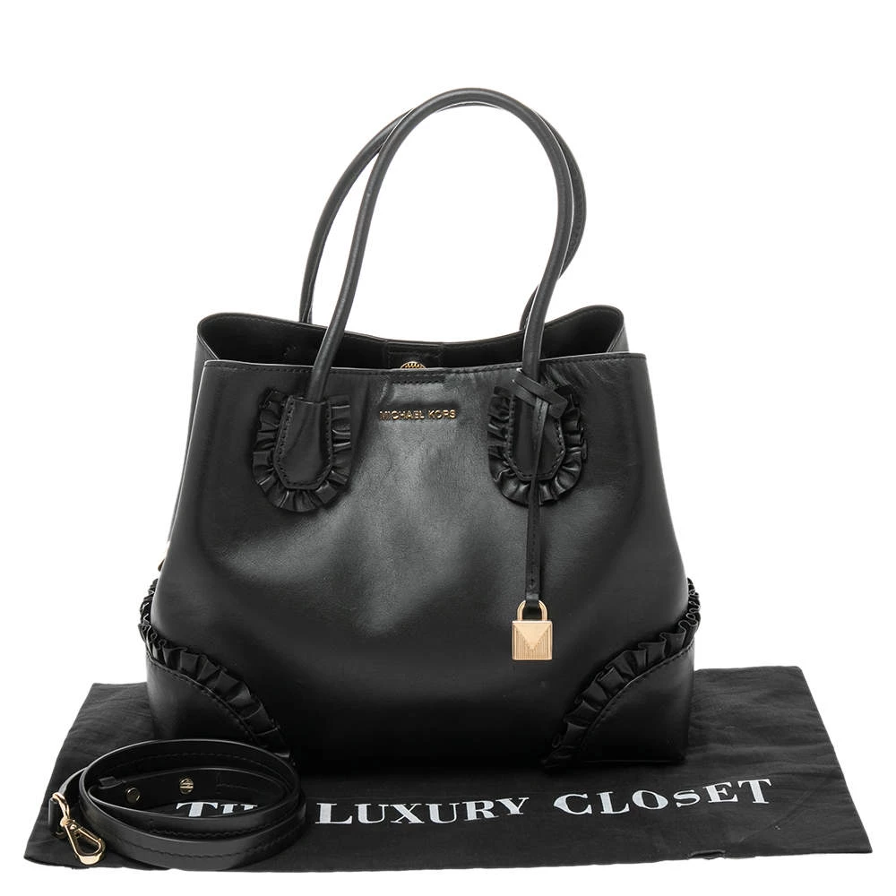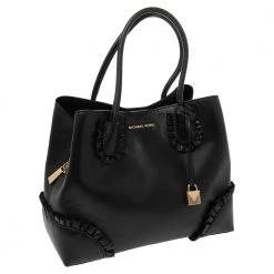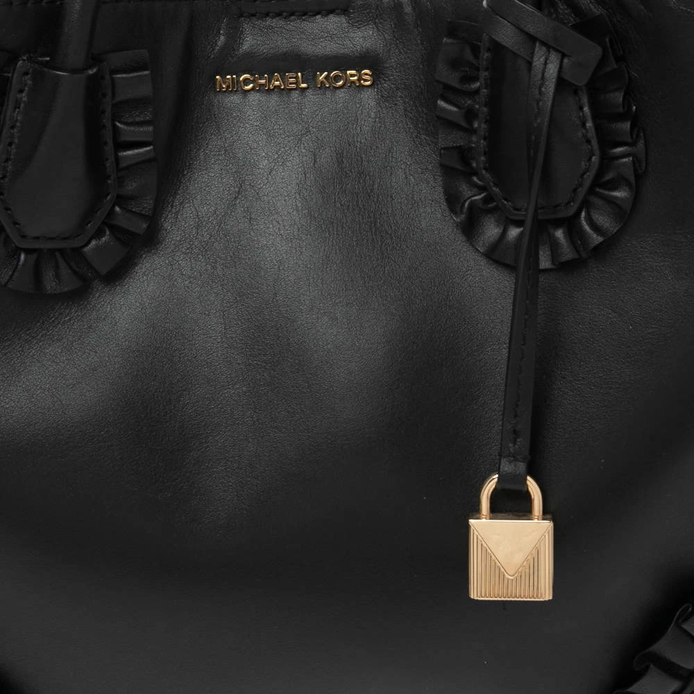 Featuring a chic and fabulous style, this Michael Michael Kors tote is modern. Crafted from leather in stunning black, the tote features ruffle trims, dual handles, a removable shoulder strap, and a padlock. It opens to a spacious leather and nylon interior divided by a zipped compartment. The tote comes with protective metal feet and you are sure to love swinging this beauty.