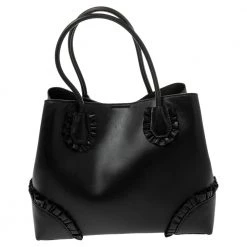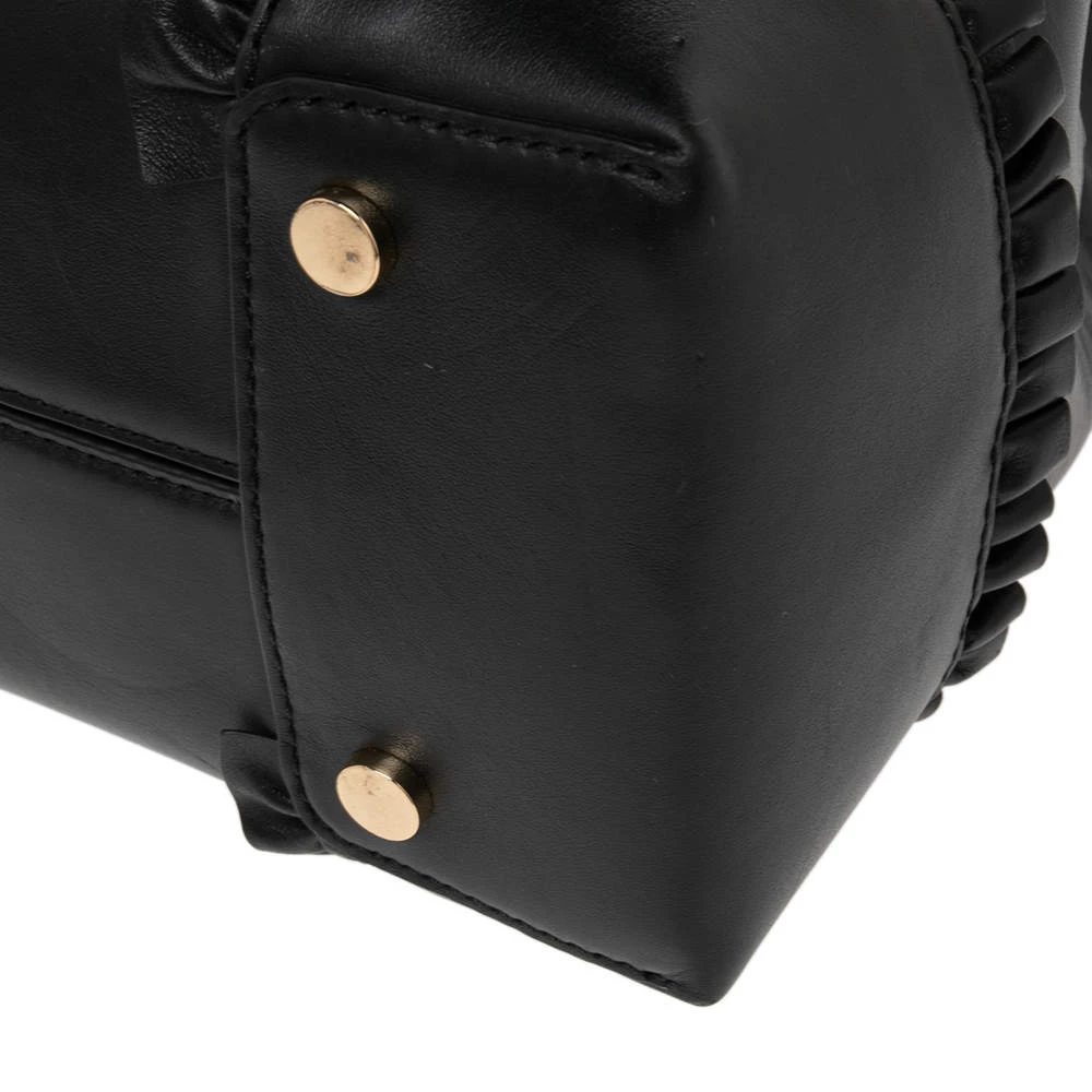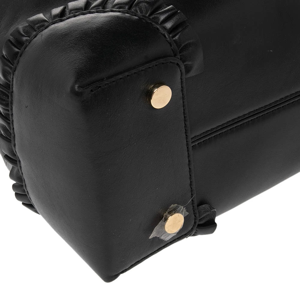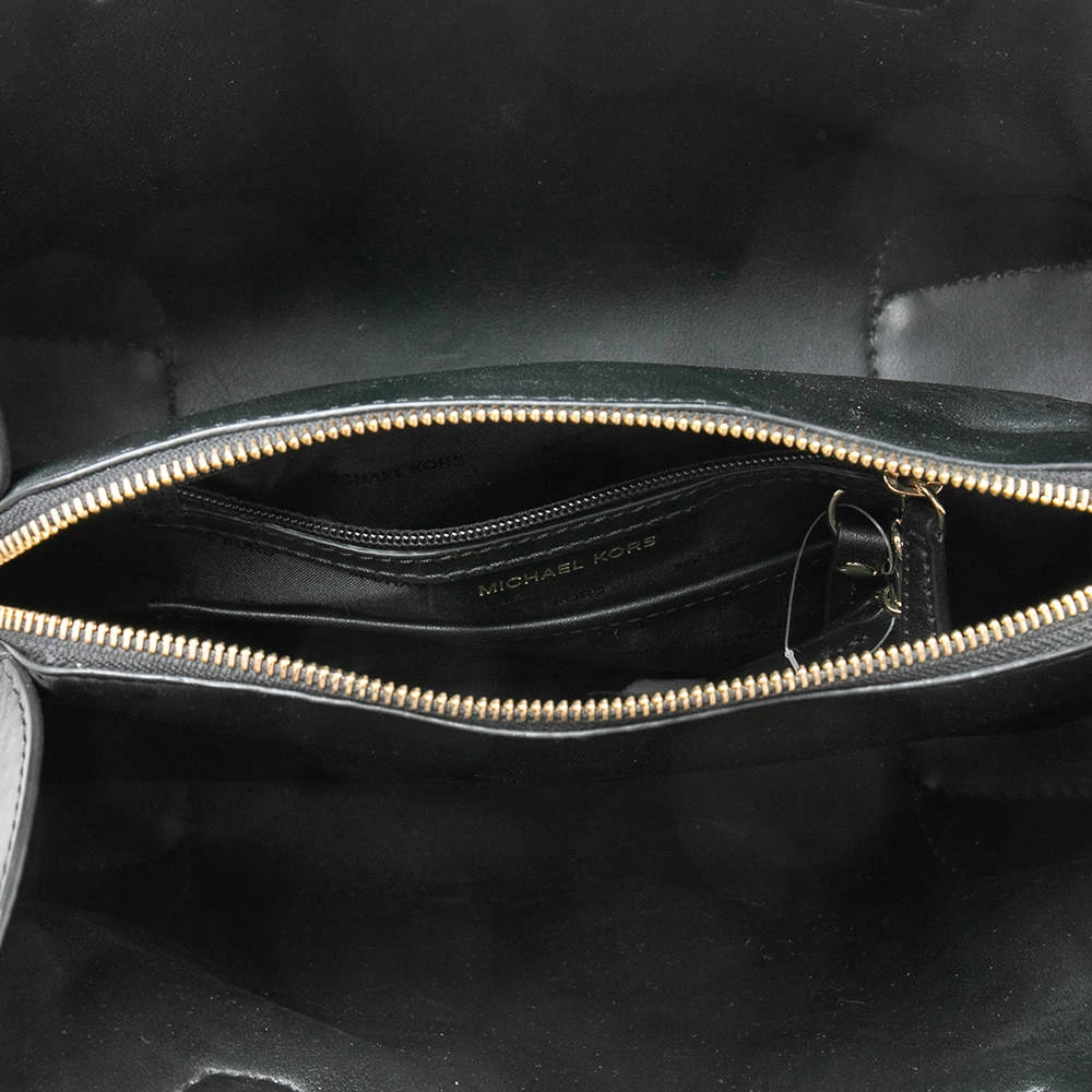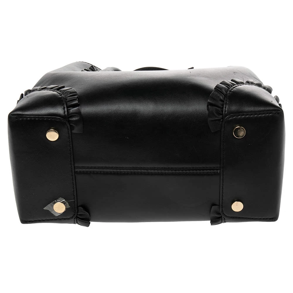 Featuring a chic and fabulous style, this Michael Michael Kors tote is modern. Crafted from leather in stunning black, the tote features ruffle trims, dual handles, a removable shoulder strap, and a padlock. It opens to a spacious leather and nylon interior divided by a zipped compartment. The tote comes with protective metal feet and you are sure to love swinging this beauty.